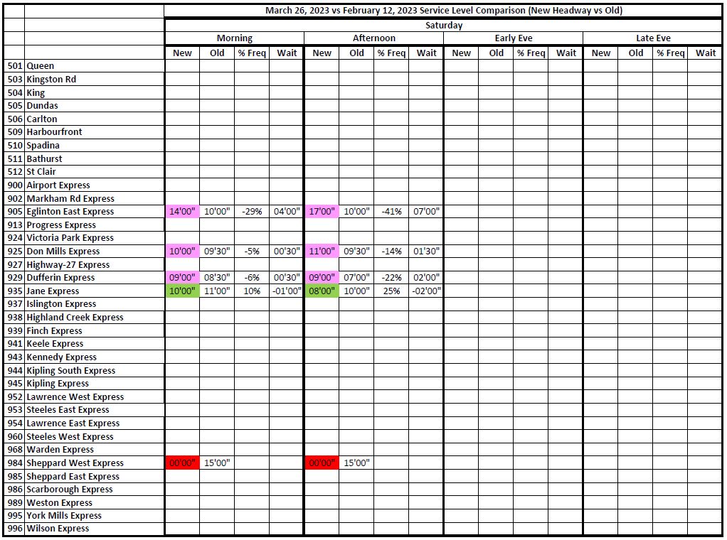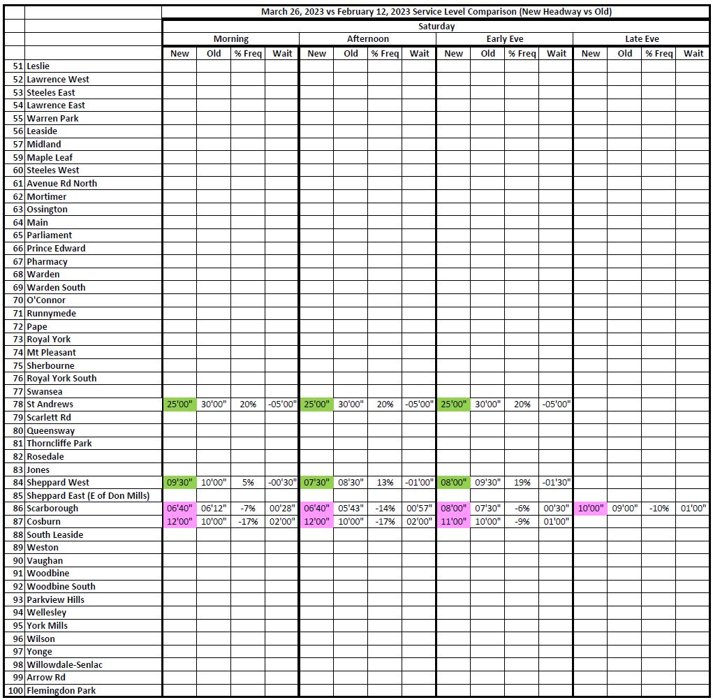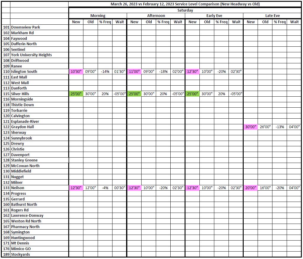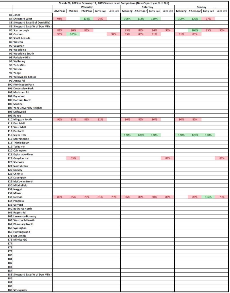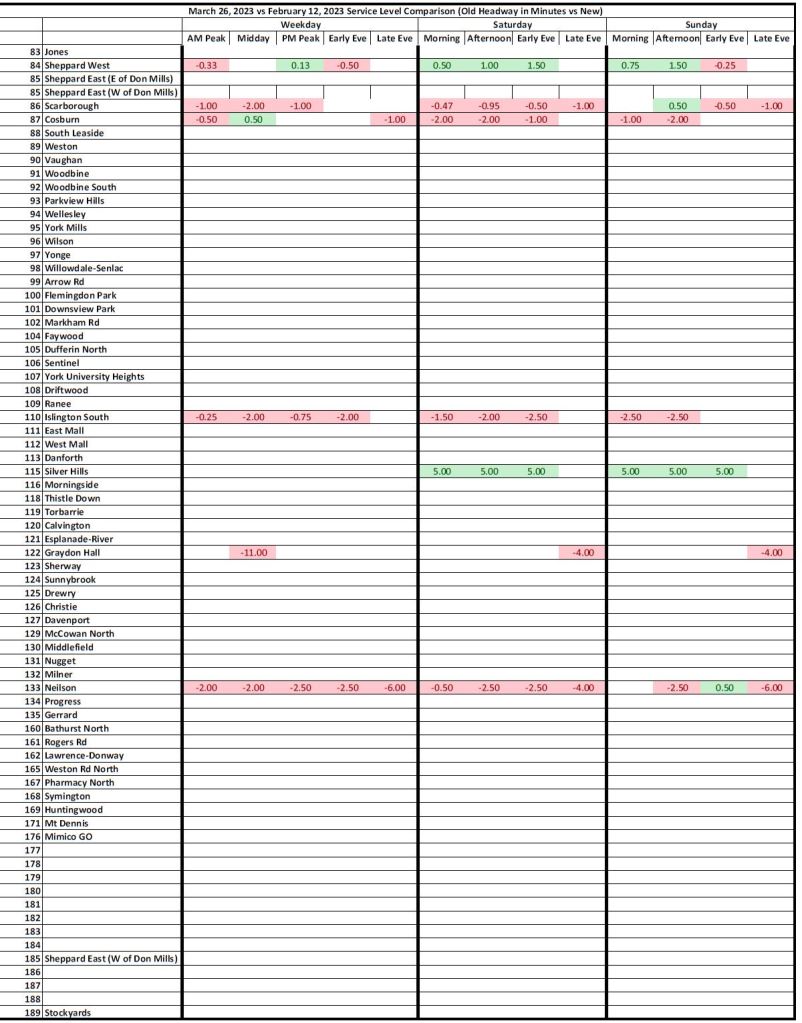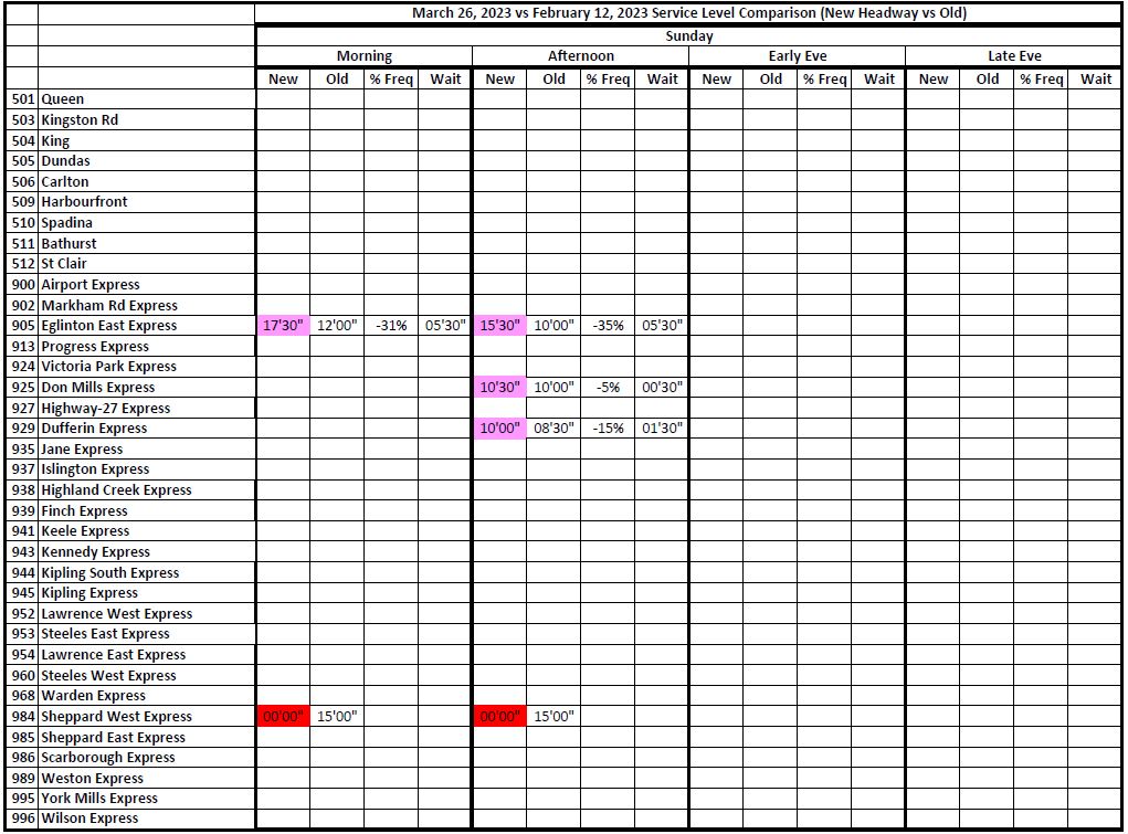 The big challenge will be that this year, and likely 2024 will be “austerity” years where any improvements will come from robbing one route to fund another. Various proposed extensions are on hold due to resources. Don’t forget that changes in Scarborough are linked to the SRT shutdown and so you won’t see anything there until November, assuming that remains the target month. 150 Eastern is on hold due to construction in various locations.