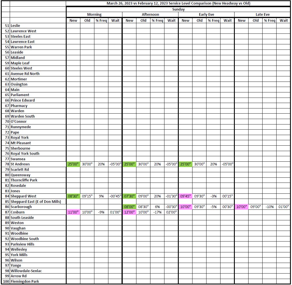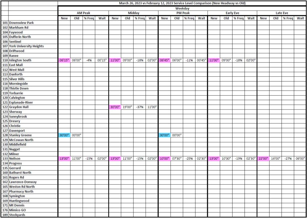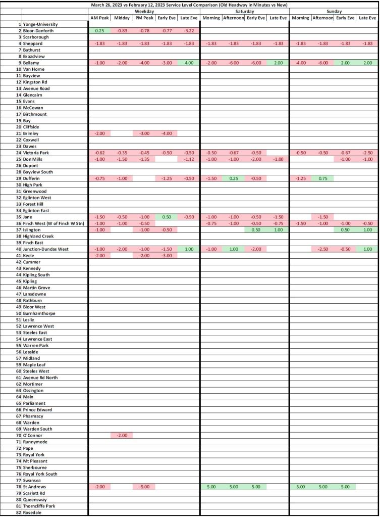 - There are a few cases where the “before” headway shown by the TTC does not match the value in the February Scheduled Service Summary nor the online schedules. My table includes the published versions.