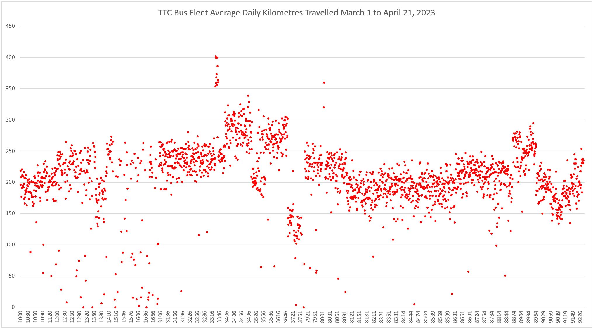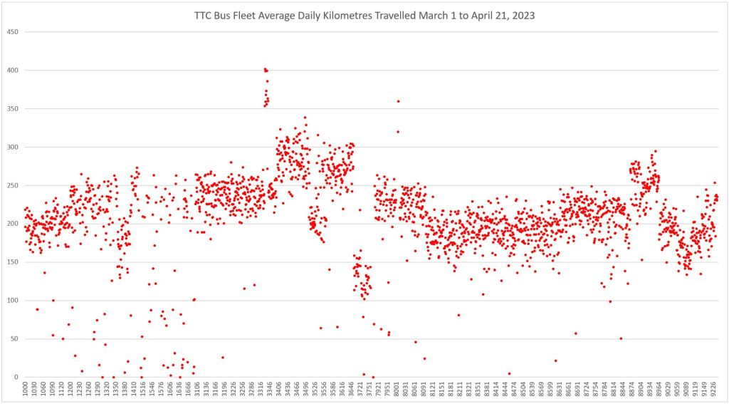 To determine the actual usage of the bus fleet, I obtained a summary of tracking data from Darwin O’Connor, proprietor of the TransSee website, for the period from March 1 to April 21, 2023. This allowed me to plot actual usage of the fleet in various ways. Many thanks to Darwin for this assistance.