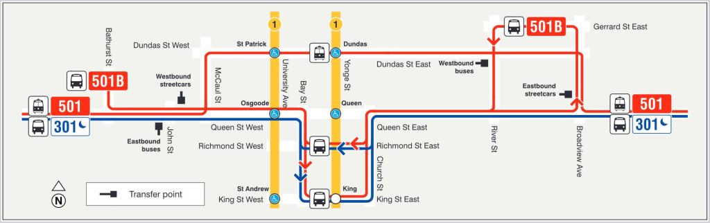 - 501B bus service from Bathurst to Broadview & Gerrard. This will divert around OL construction will be westbound via Church, Richmond and Bay; eastbound via Bay, King and Church. Buses will loop via Broadview, Gerrard and River.
