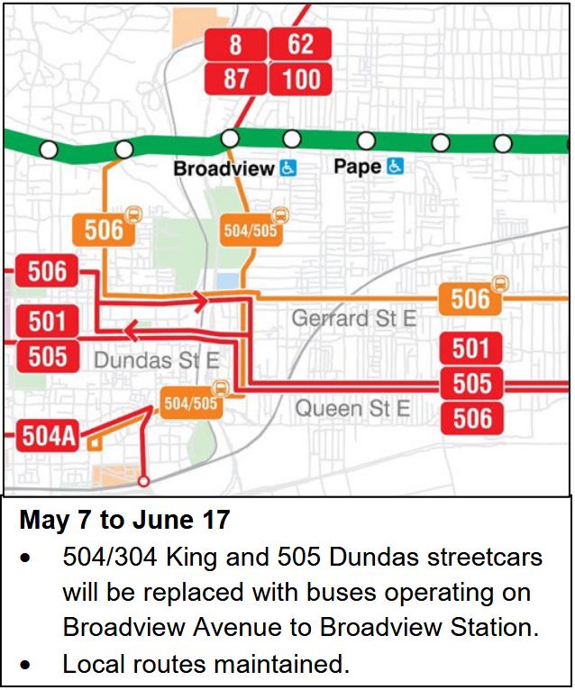 202304_broadviewdiversions_mayjune Published April 14, 2023 at 638 × 766 in Construction on Broadview, Gerrard/Coxwell, Main Station and Queen East Next →