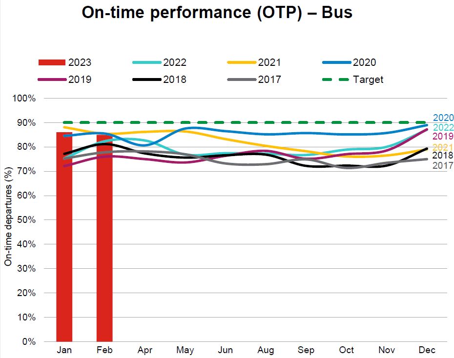Network performance was negatively impacted by the inclement weather the weeks of February 20 to March 10, where over 60 centimetres of snow fell on the city during this time. Weekday On-time performance was 88% for Weeks 7, 11 and 12. During weekends for the period, OTP was 82%. During February, 32 of 159 weekday routes were impacted by construction for at least three weeks of the period. Overall weekday OTP was 88% for the 127 routes not affected by construction: