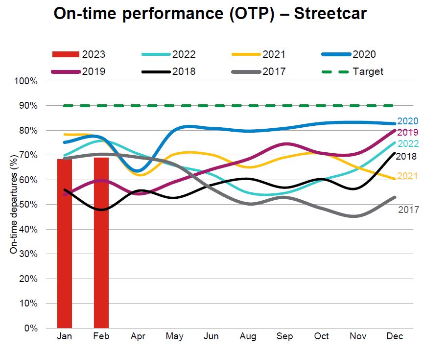 The intent is to hit this target 90% of the time, but the TTC does not achieve this with values typically falling in the 70-to-85 per cent range. At an individual route level results can be considerably worse. Streetcar routes fared worse with a 50-to-85 per cent range, and the higher end was achieved during the pandemic era when traffic and demand were light. The numbers have fallen since then.