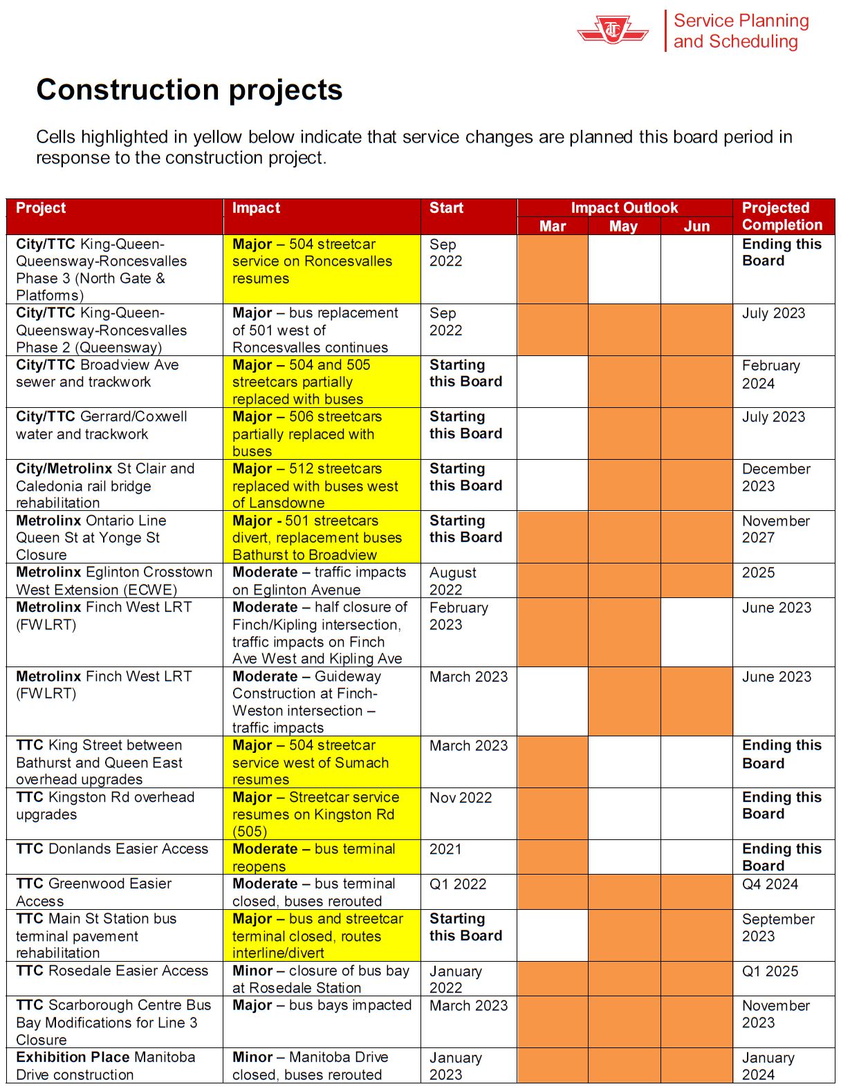 - 22 Coxwell: Service improvements during some periods due to replacement of service on Kingston Road with streetcars and shortening of the Coxwell route. (*)