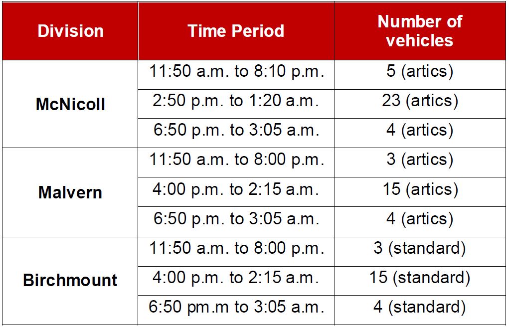 - 20 Cliffside: Service improvements during most periods due to new schedules with route cut back to Victoria Park Station (*)