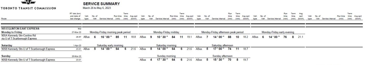 905_20230326_servicesummary Published May 7, 2023 at 1861 × 330 in 905 Eglinton East Express March-April 2023 ← Previous Next →