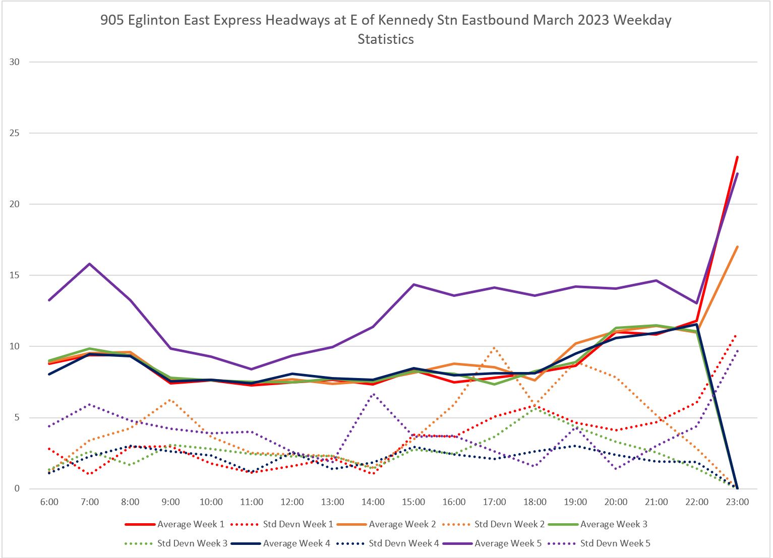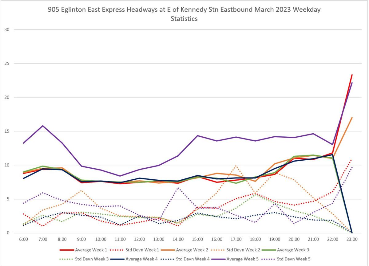 905_202303_eofkennedystn_eb_headways_weekdaystats Published May 7, 2023 at 1533 × 1107 in 905 Eglinton East Express March-April 2023 ← Previous Next →