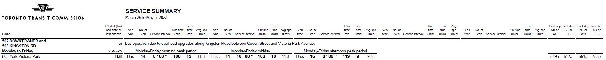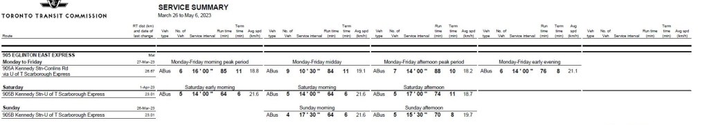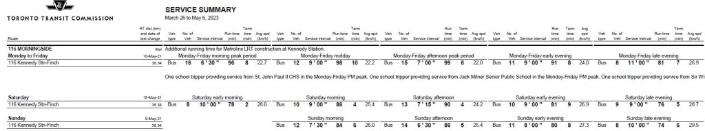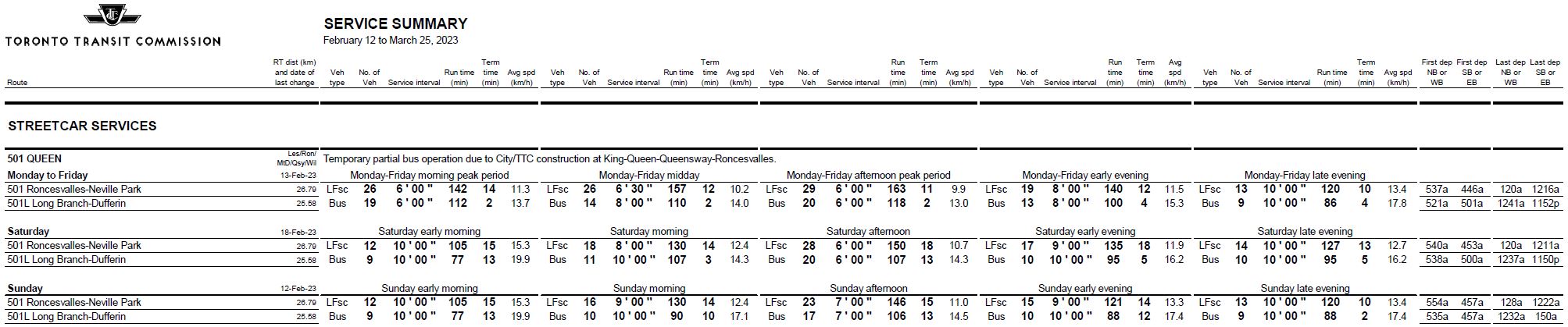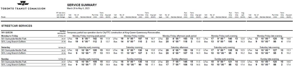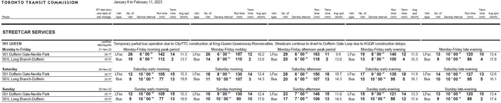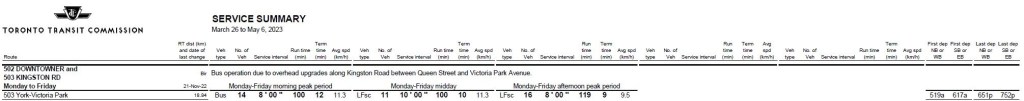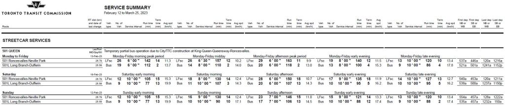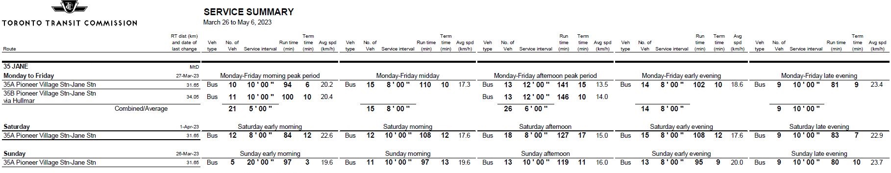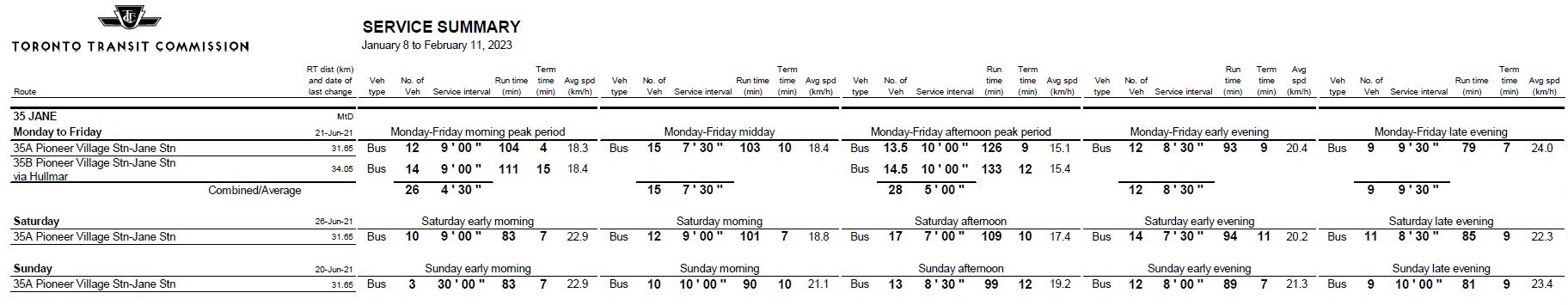 For reference, here are the service designs for 35 Jane in effect at the beginning of 2023, and the late March revision when service was trimmed. (For those seeking archived TTC Scheduled Service Summaries, they are available here.)