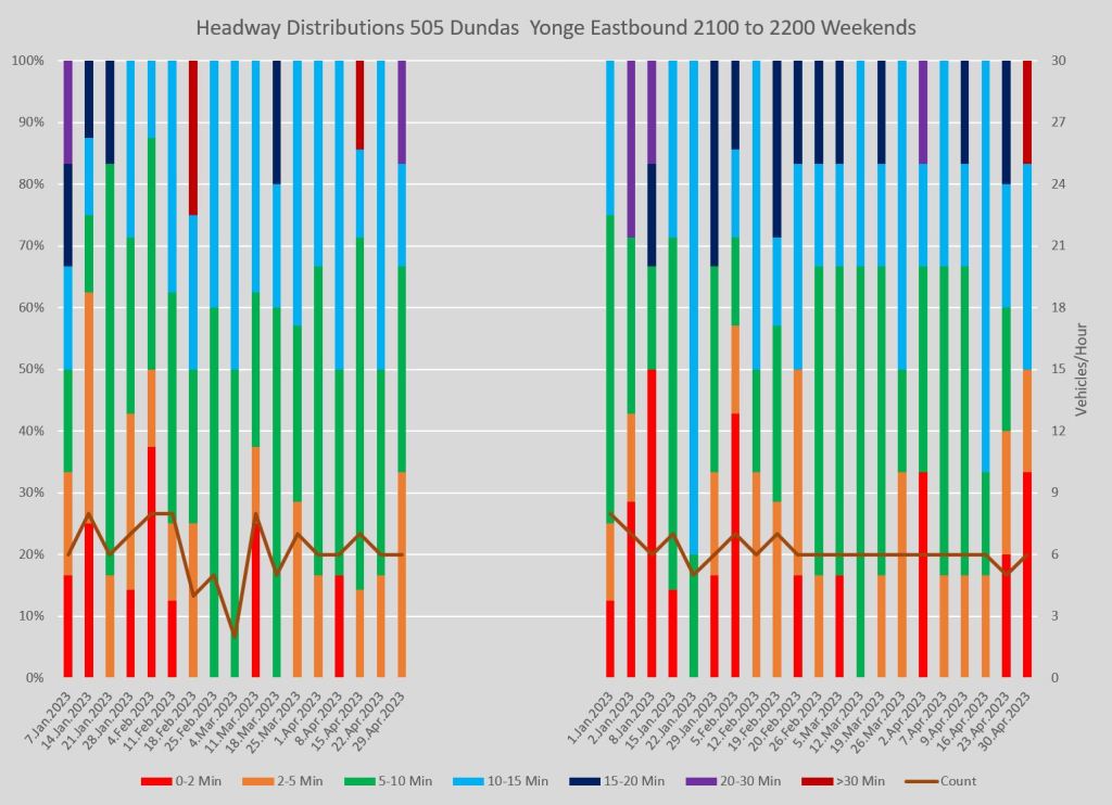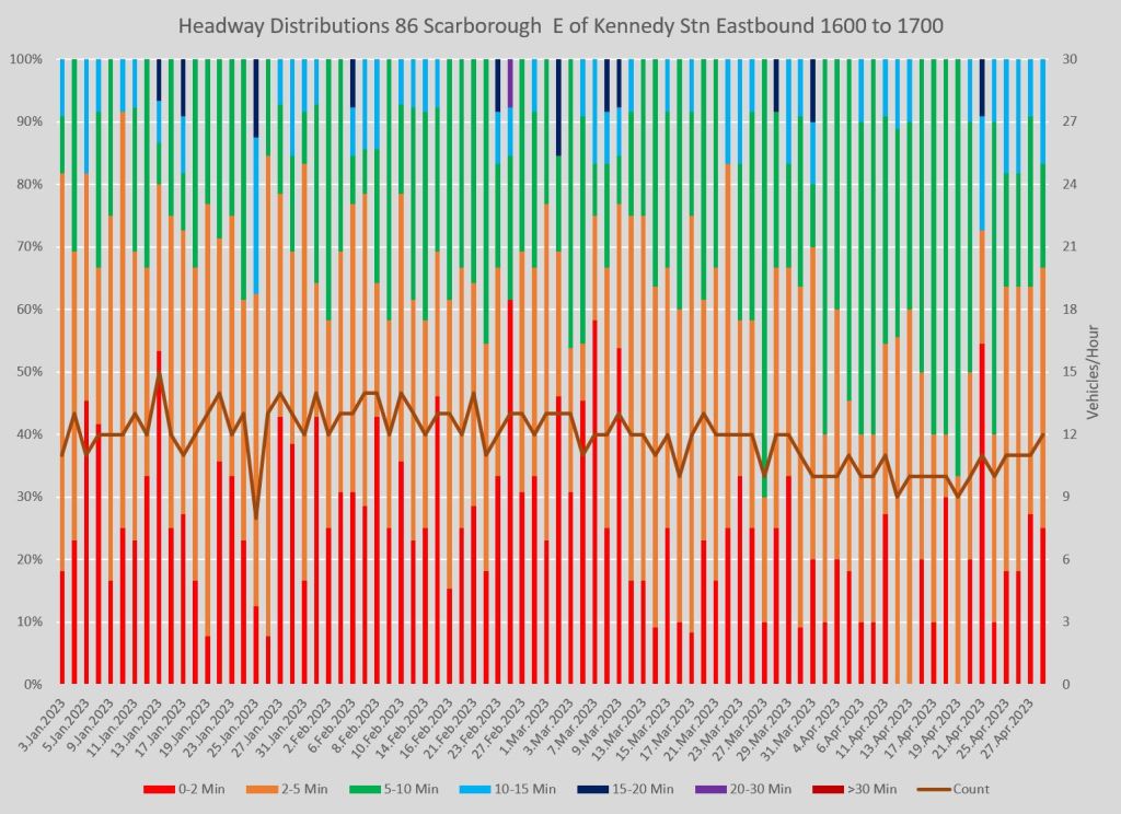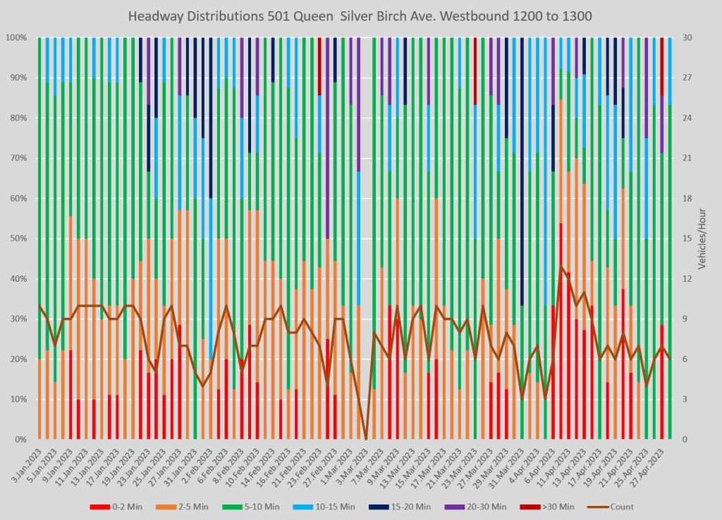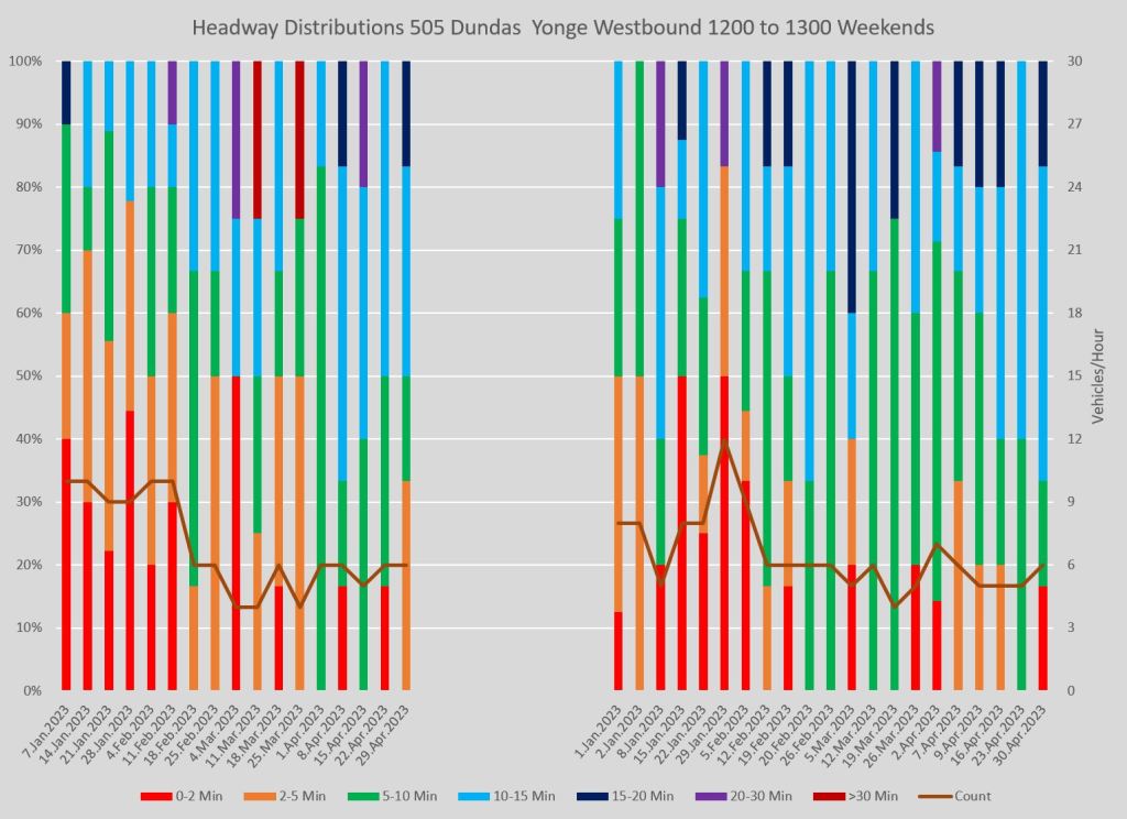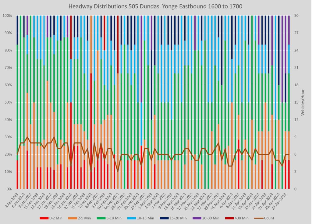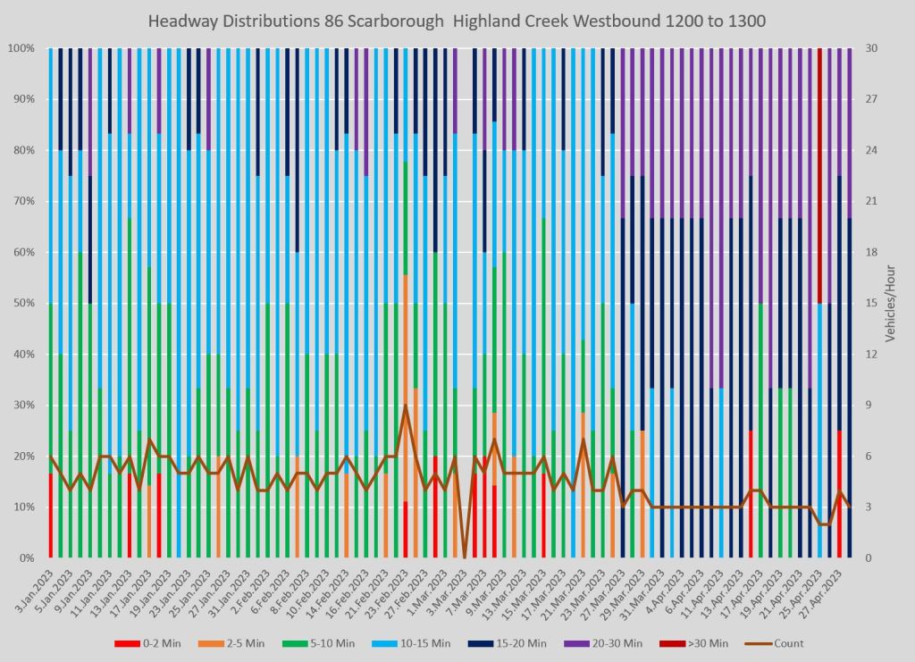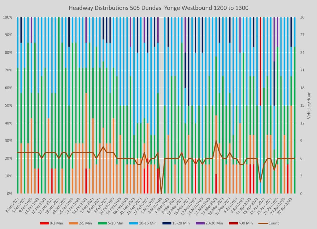 In all of the charts, the same headway bands are used regardless of the scheduled frequency. The intent is not to track service versus the scheduled level, but to show what proportion lies in a “bunched” or “gapped” group as well the ranges more commonly expected by riders. Most routes in Toronto operate on headways in the 5-15 minute range, and my preference was for a standard chart layout that would not have to be adjusted for various routes and conditions.