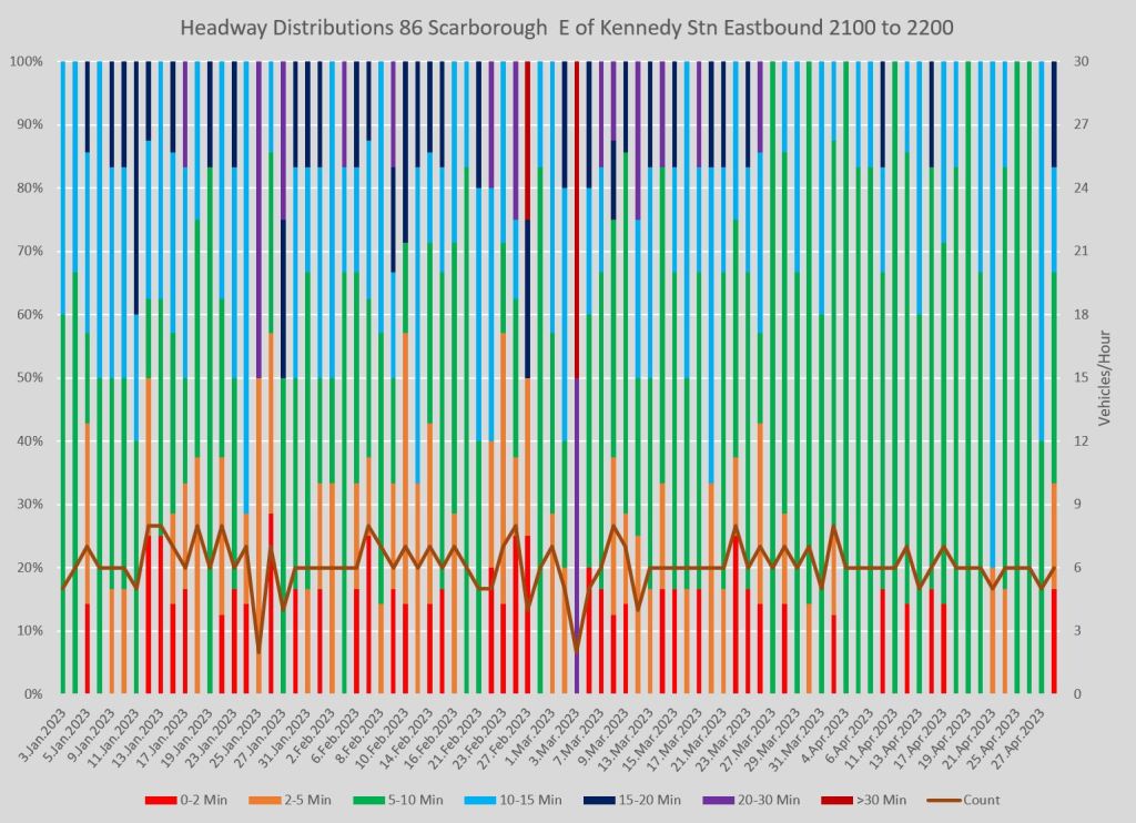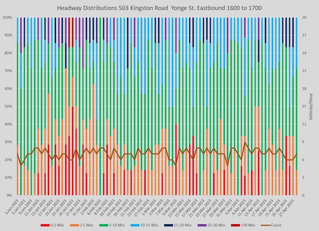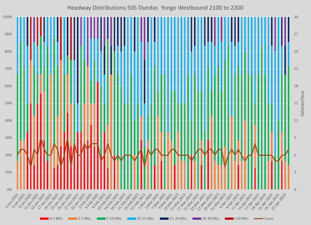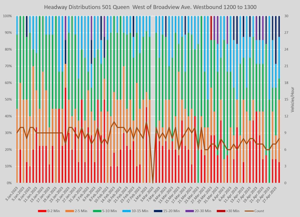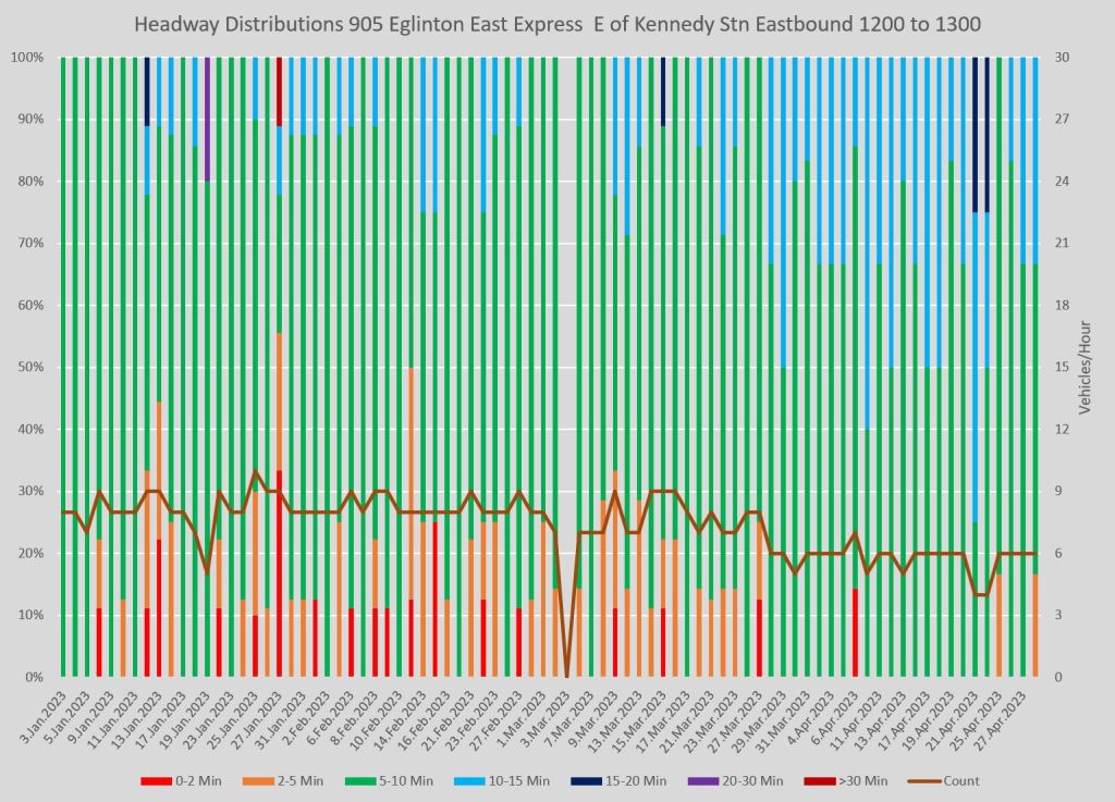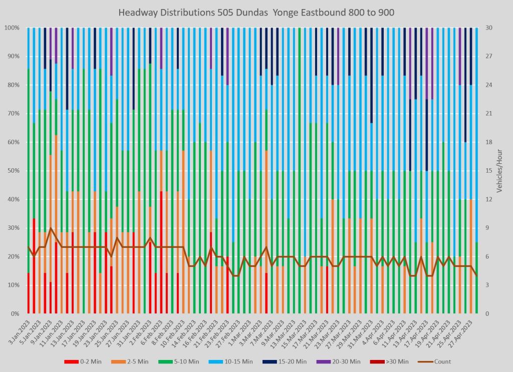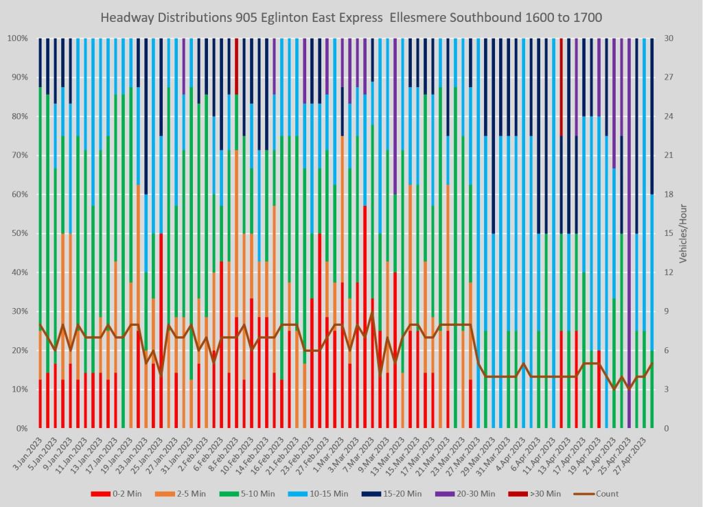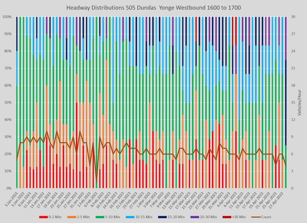 In all of the charts, the same headway bands are used regardless of the scheduled frequency. The intent is not to track service versus the scheduled level, but to show what proportion lies in a “bunched” or “gapped” group as well the ranges more commonly expected by riders. Most routes in Toronto operate on headways in the 5-15 minute range, and my preference was for a standard chart layout that would not have to be adjusted for various routes and conditions.