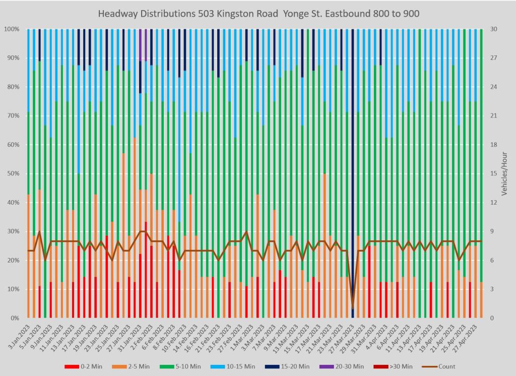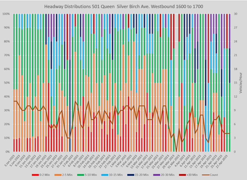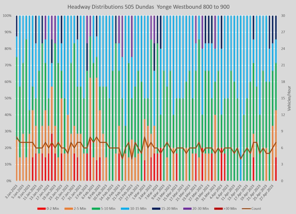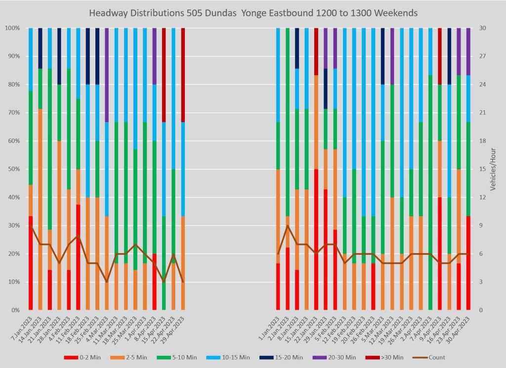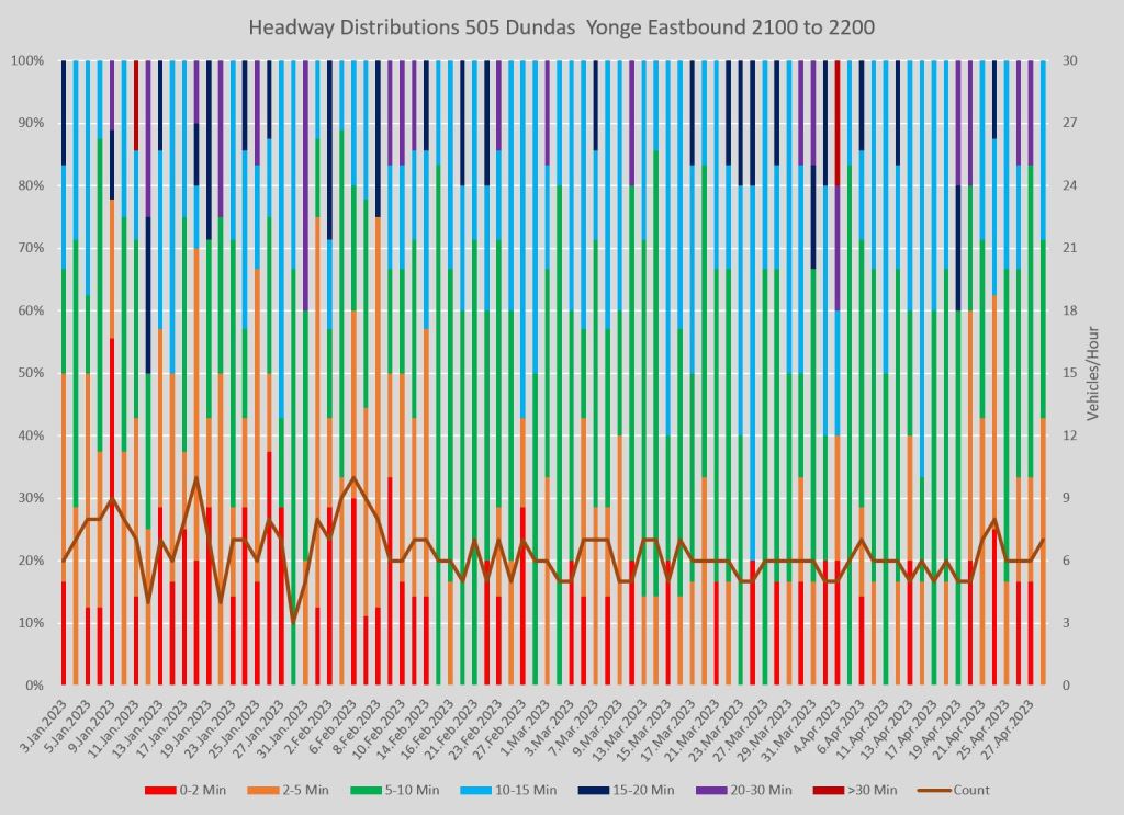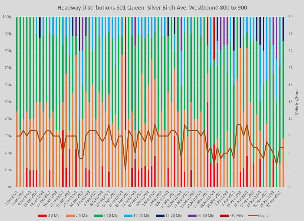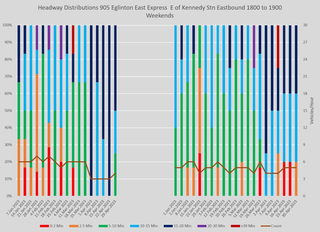 In all of the charts, the same headway bands are used regardless of the scheduled frequency. The intent is not to track service versus the scheduled level, but to show what proportion lies in a “bunched” or “gapped” group as well the ranges more commonly expected by riders. Most routes in Toronto operate on headways in the 5-15 minute range, and my preference was for a standard chart layout that would not have to be adjusted for various routes and conditions.