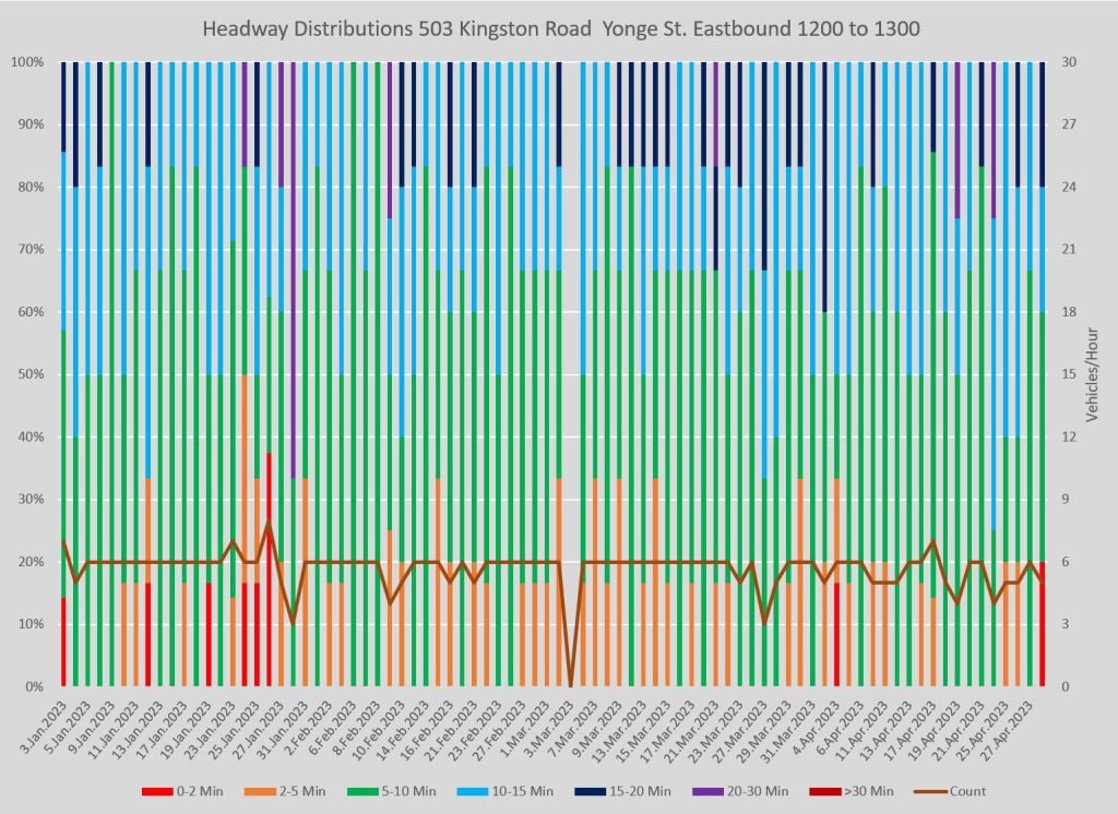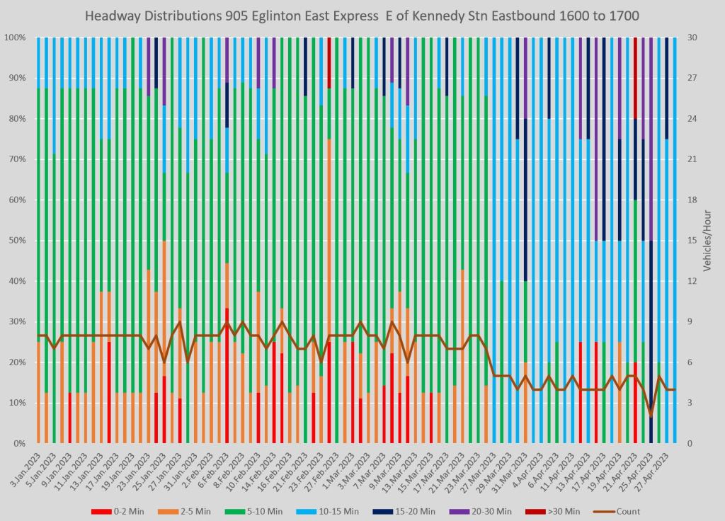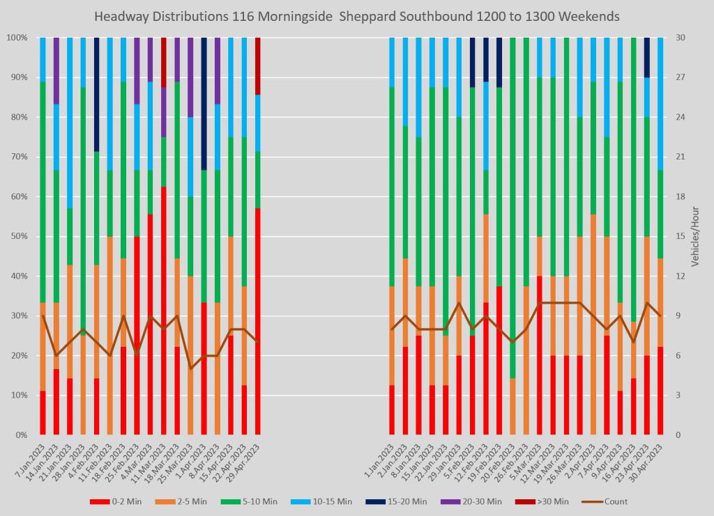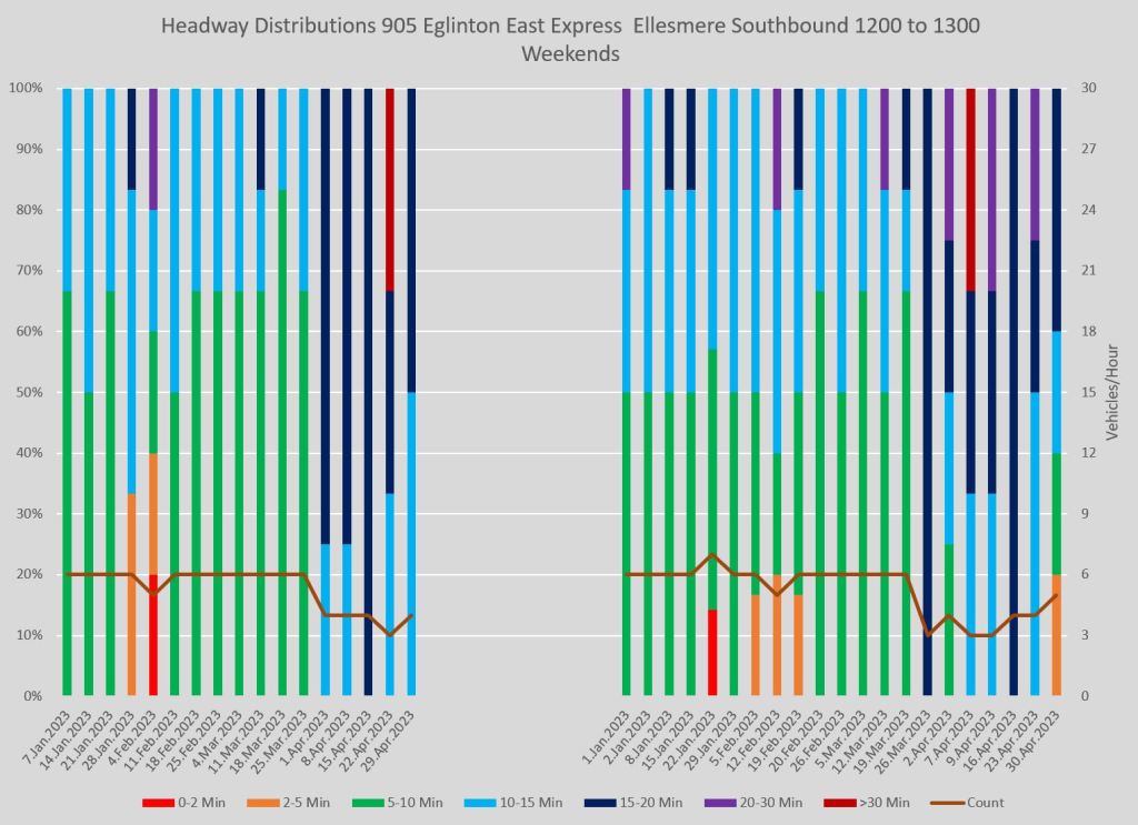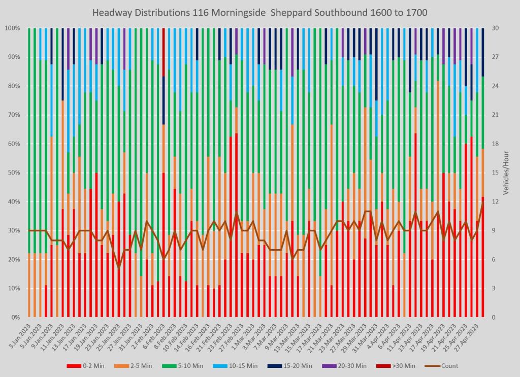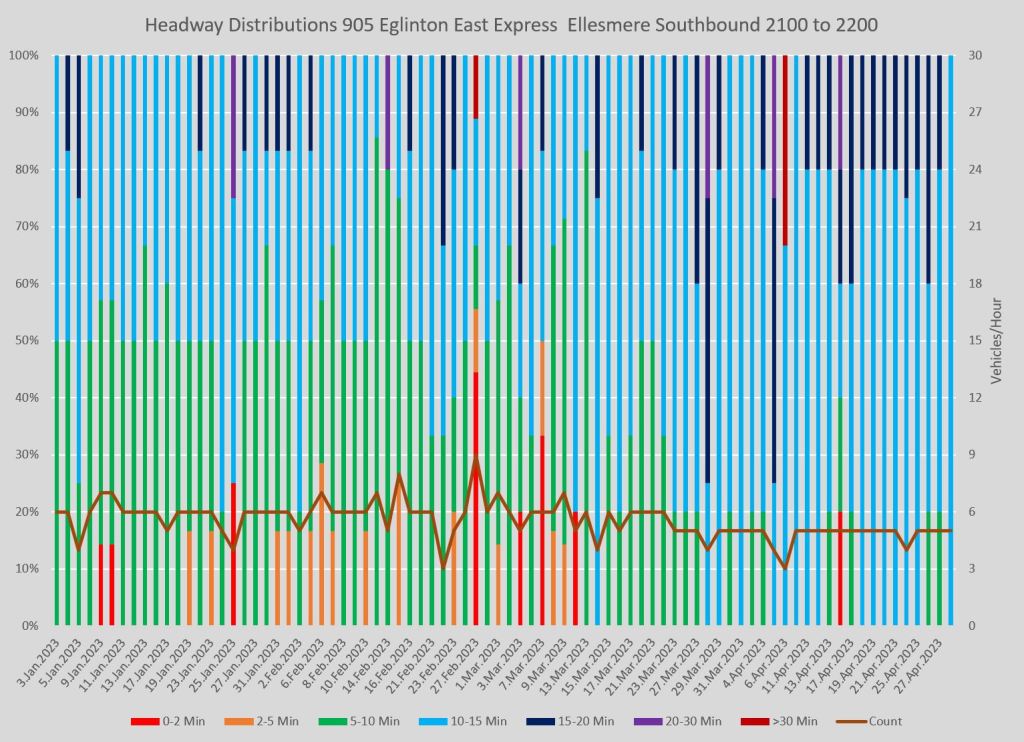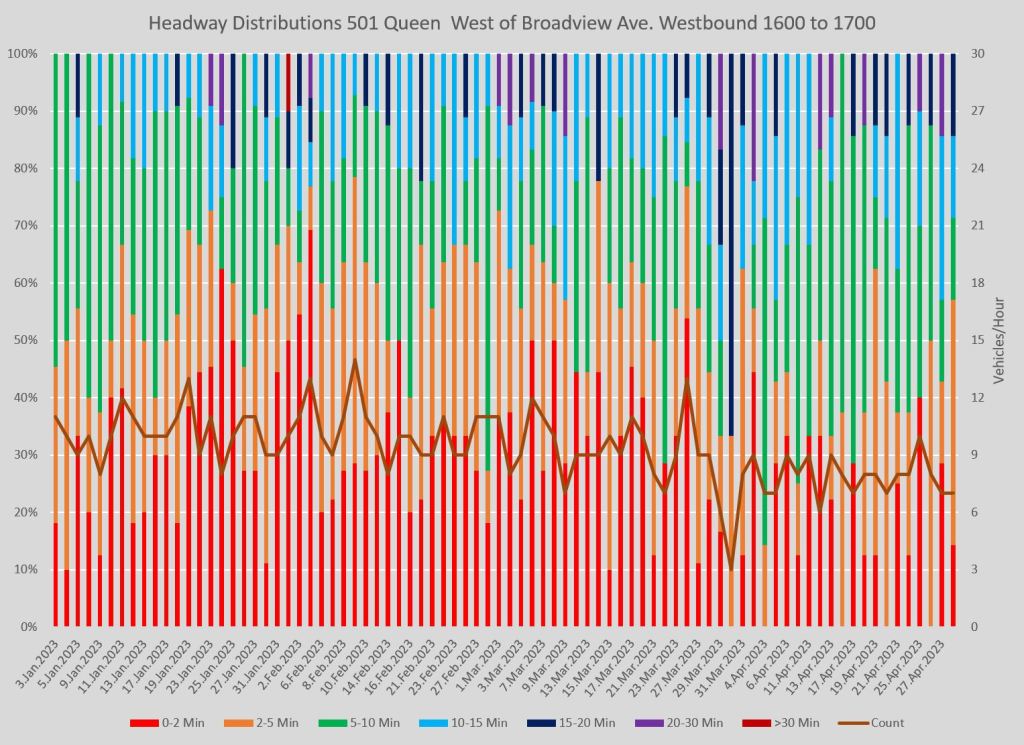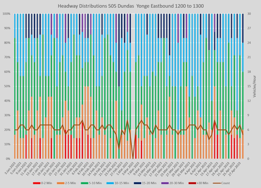 In all of the charts, the same headway bands are used regardless of the scheduled frequency. The intent is not to track service versus the scheduled level, but to show what proportion lies in a “bunched” or “gapped” group as well the ranges more commonly expected by riders. Most routes in Toronto operate on headways in the 5-15 minute range, and my preference was for a standard chart layout that would not have to be adjusted for various routes and conditions.