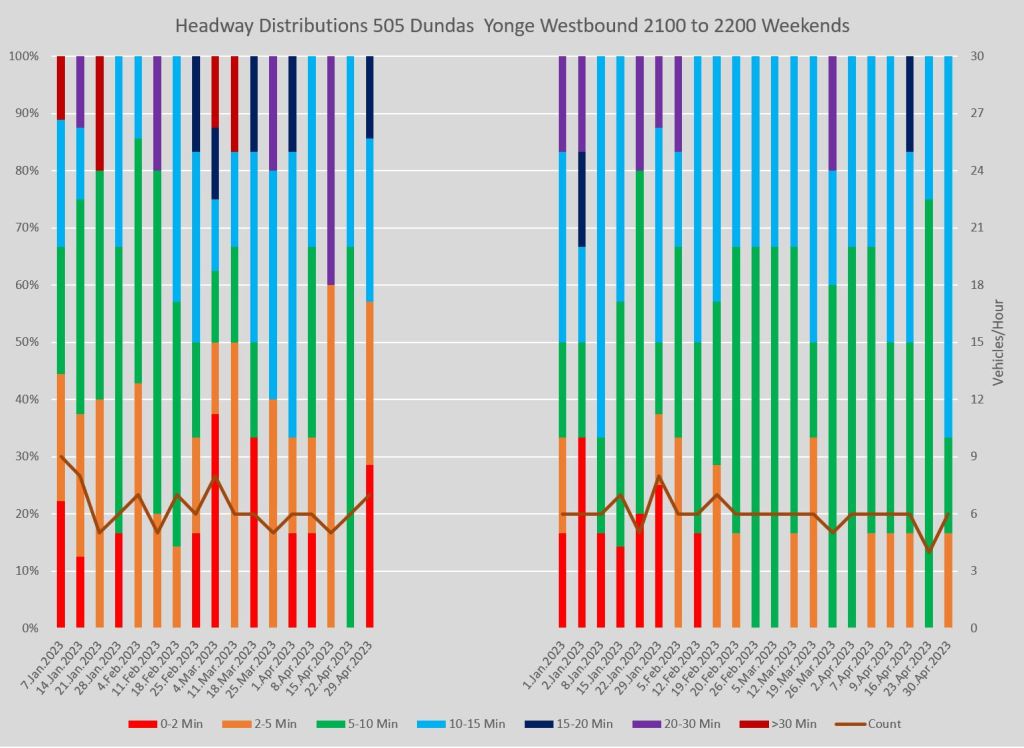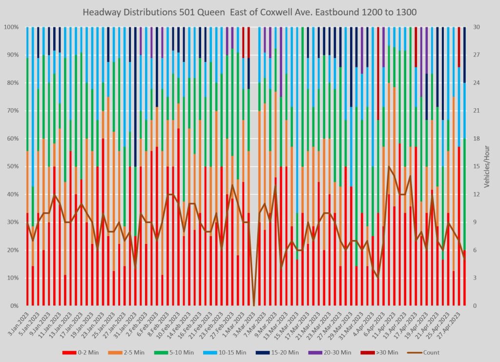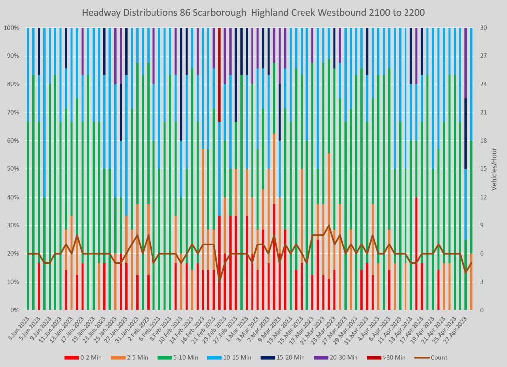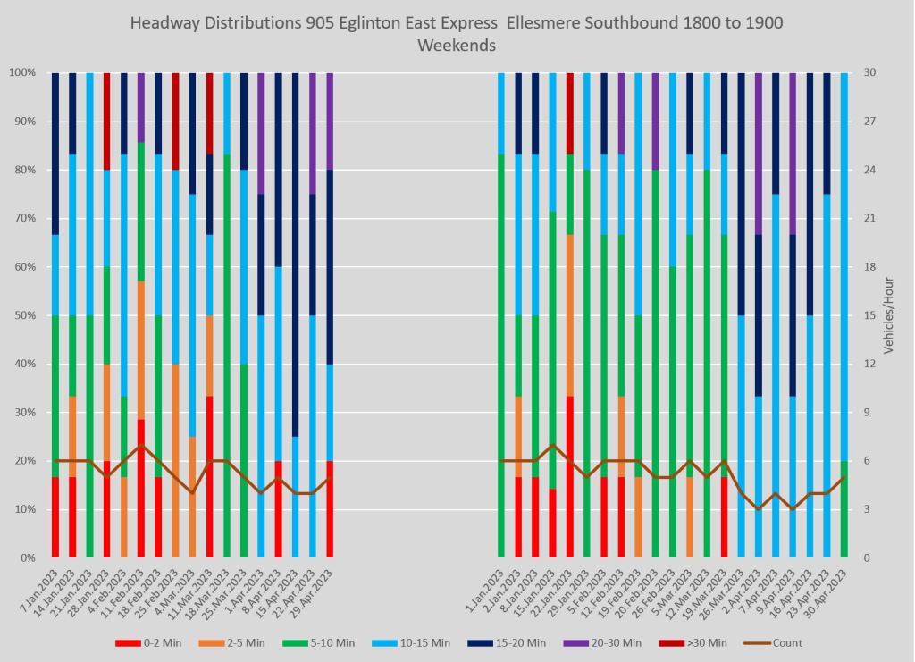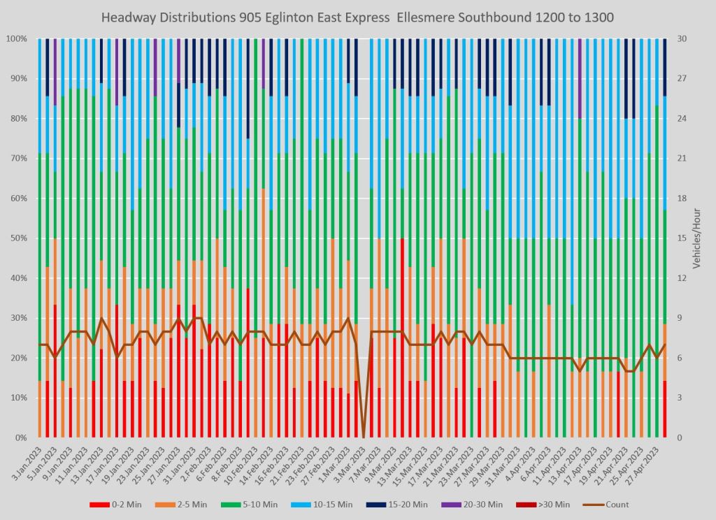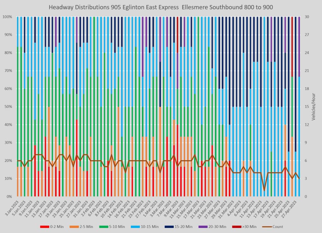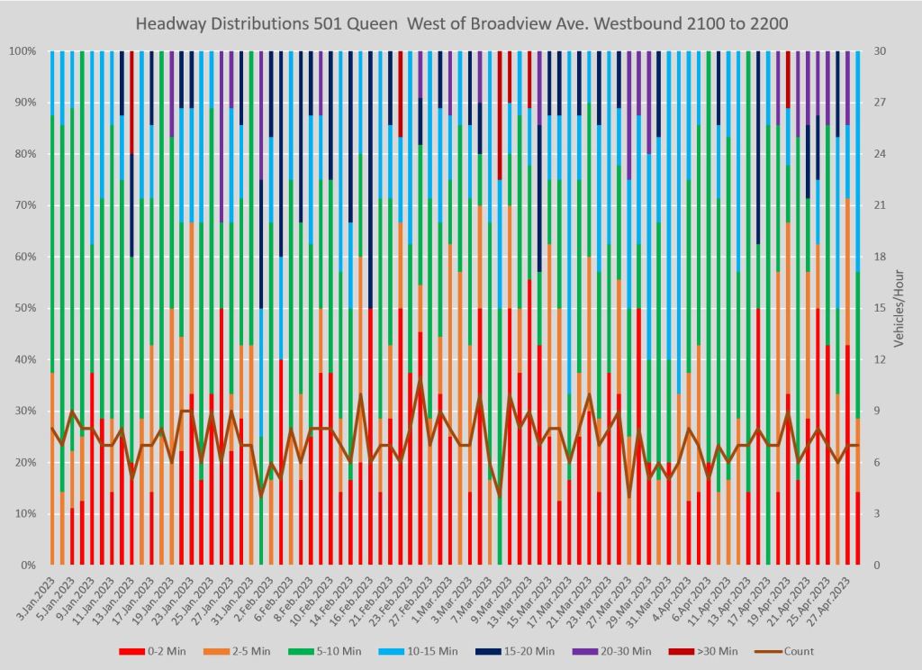 In all of the charts, the same headway bands are used regardless of the scheduled frequency. The intent is not to track service versus the scheduled level, but to show what proportion lies in a “bunched” or “gapped” group as well the ranges more commonly expected by riders. Most routes in Toronto operate on headways in the 5-15 minute range, and my preference was for a standard chart layout that would not have to be adjusted for various routes and conditions.