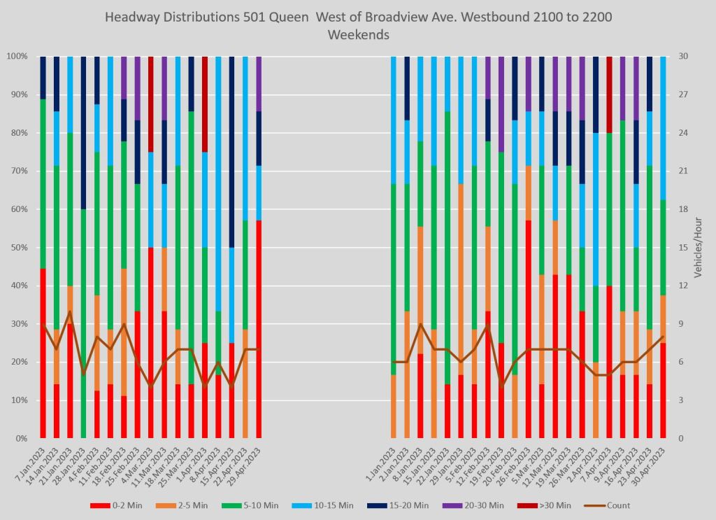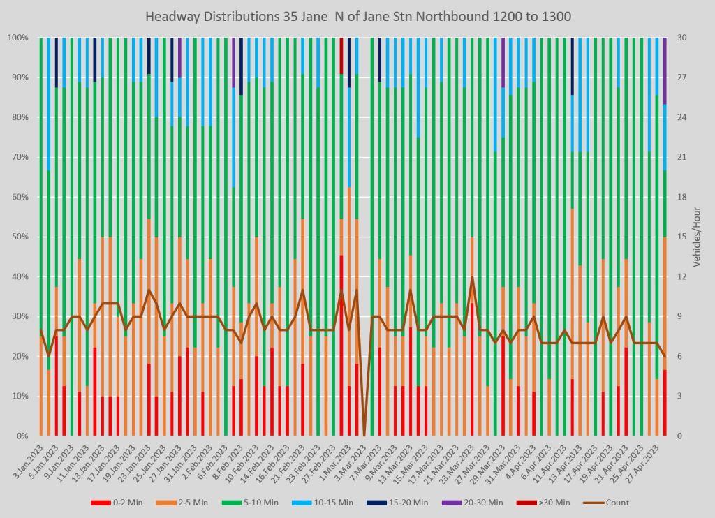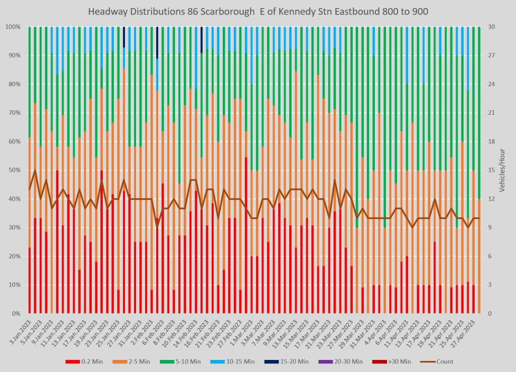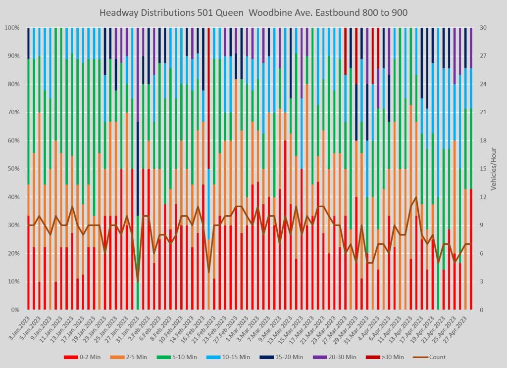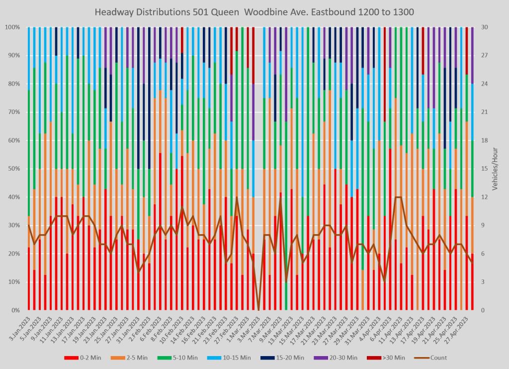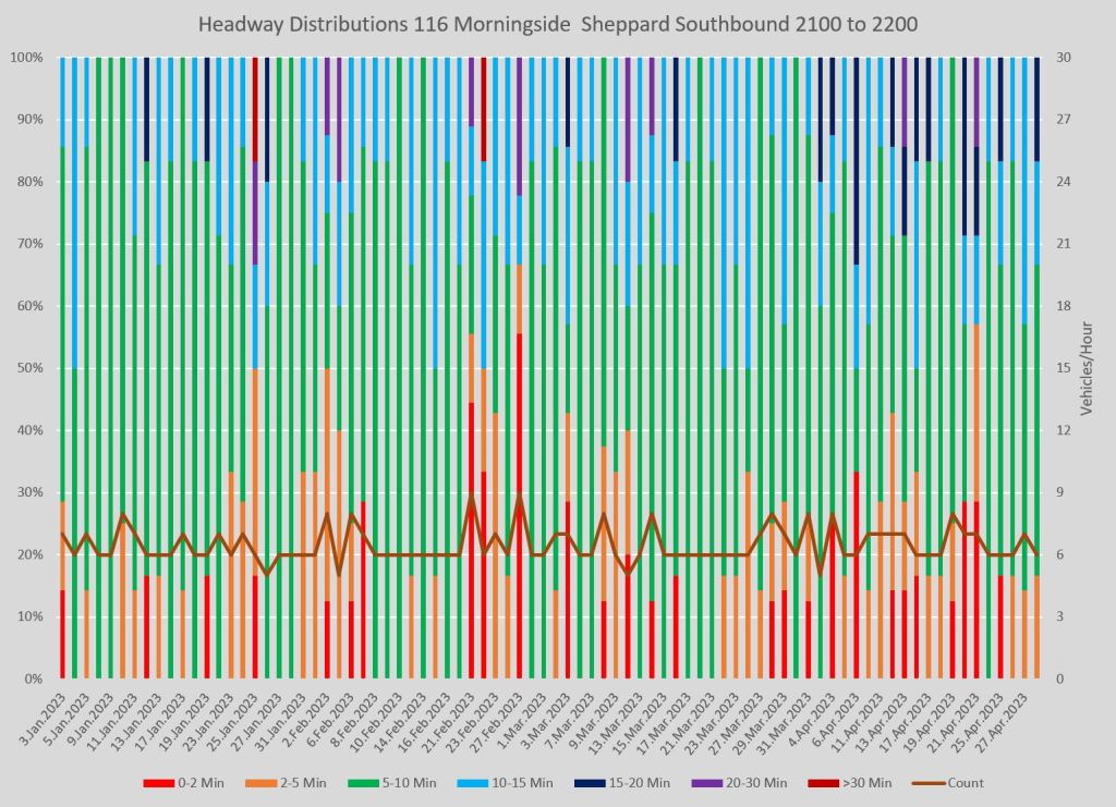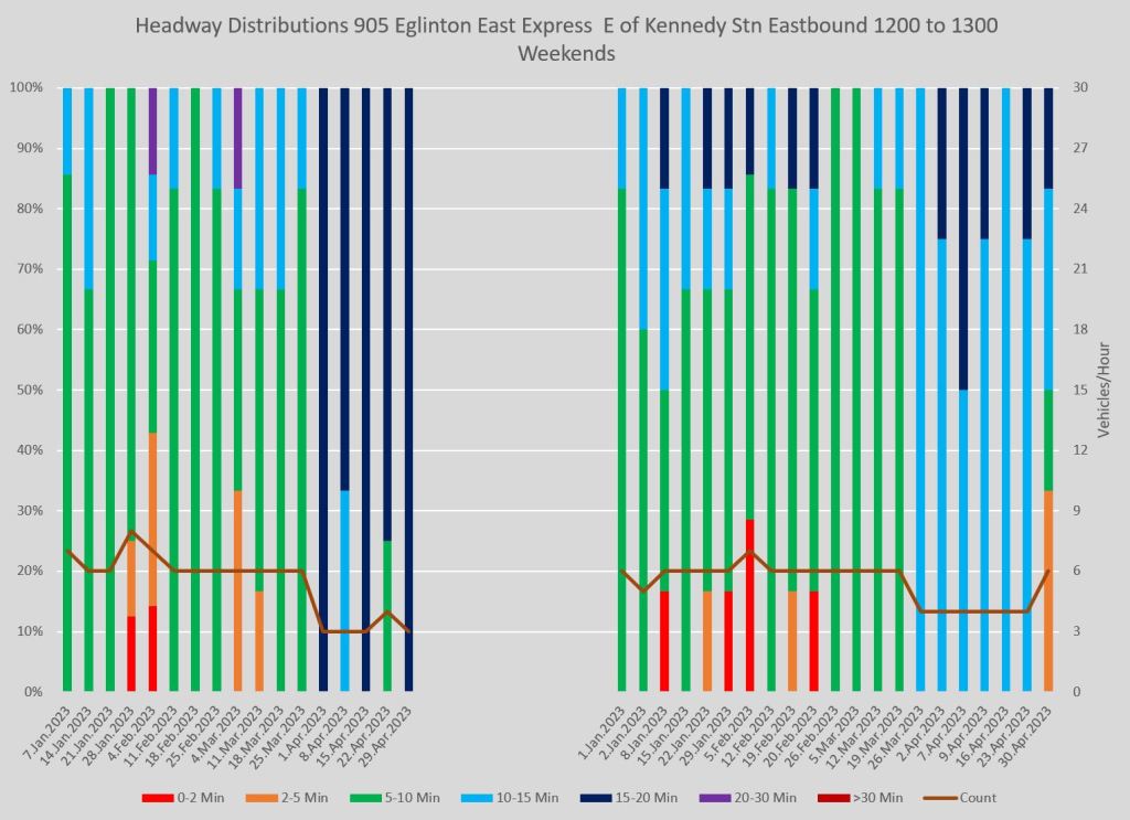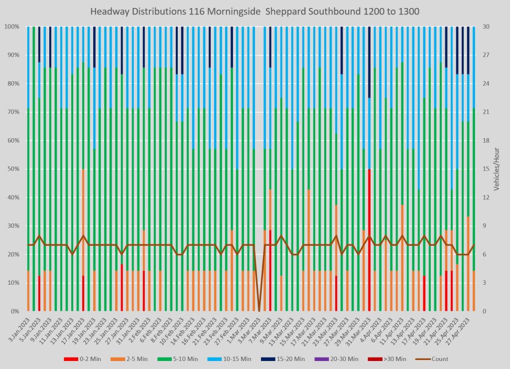 In all of the charts, the same headway bands are used regardless of the scheduled frequency. The intent is not to track service versus the scheduled level, but to show what proportion lies in a “bunched” or “gapped” group as well the ranges more commonly expected by riders. Most routes in Toronto operate on headways in the 5-15 minute range, and my preference was for a standard chart layout that would not have to be adjusted for various routes and conditions.