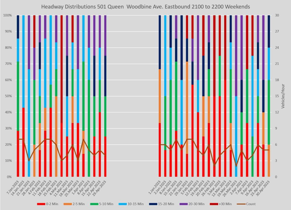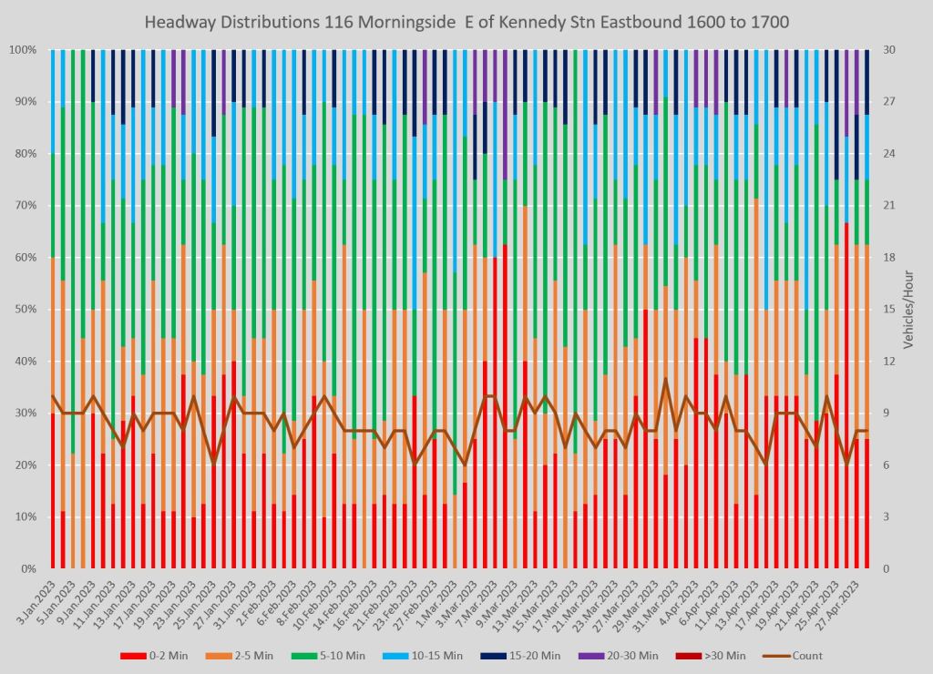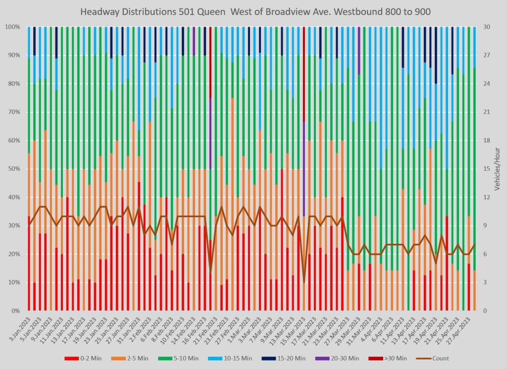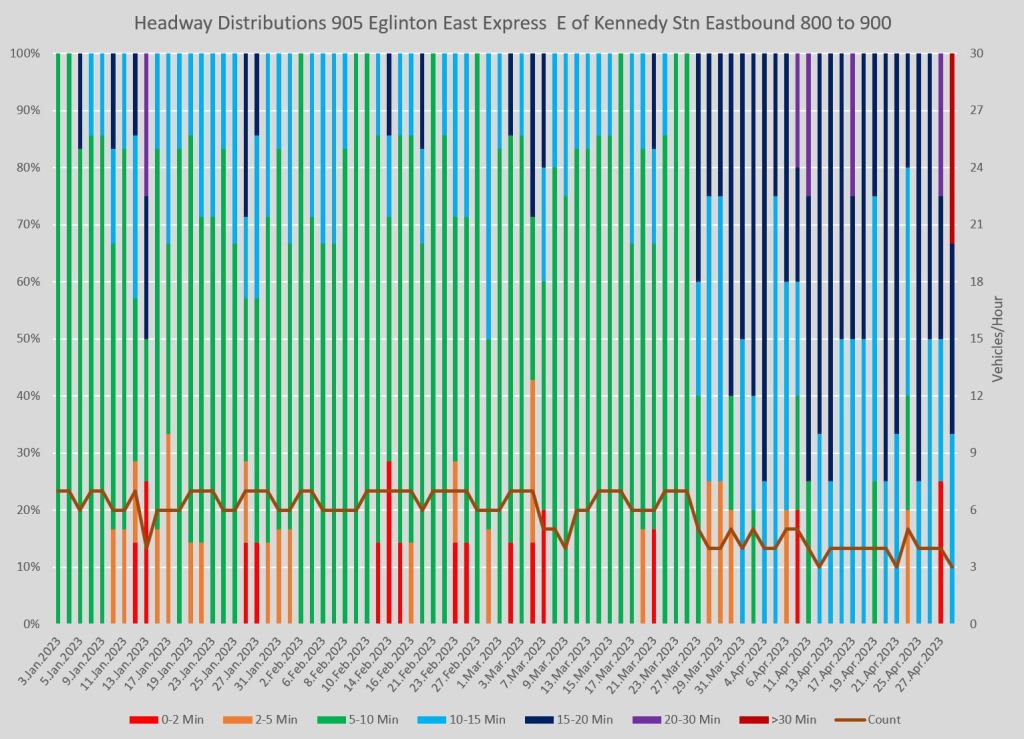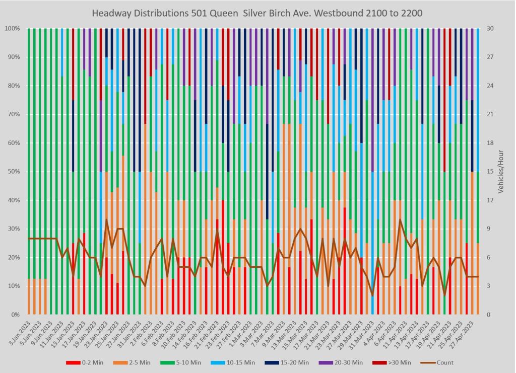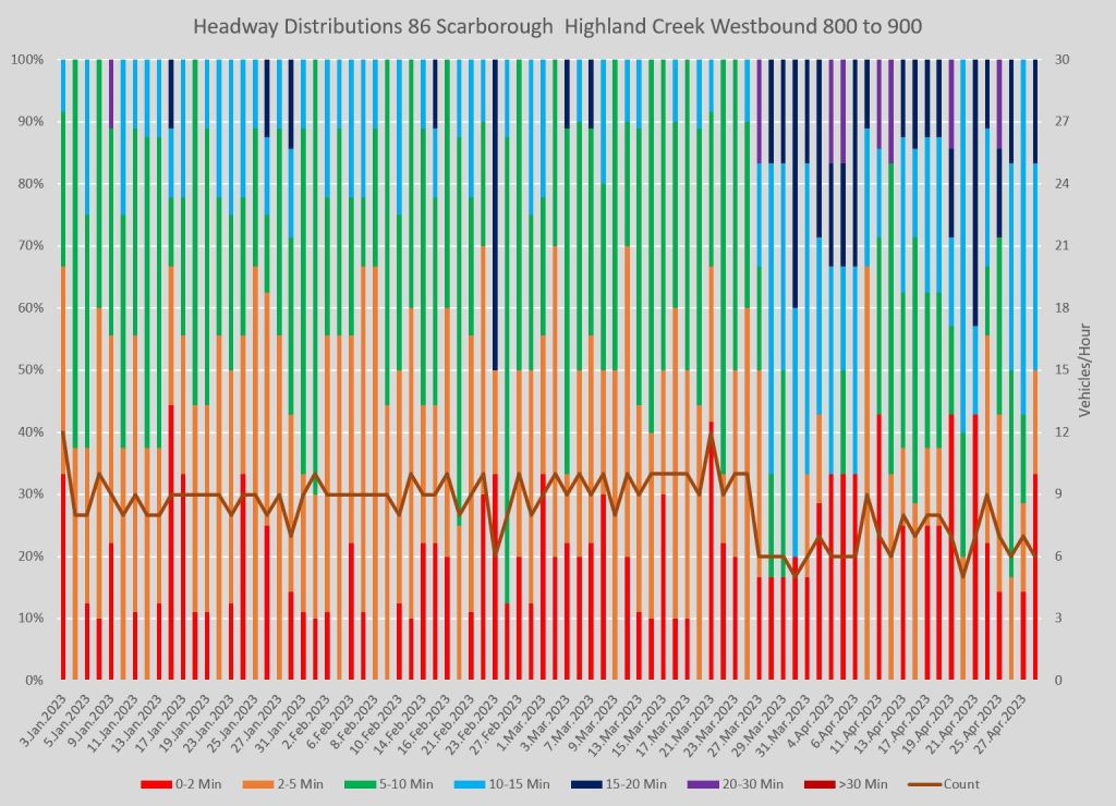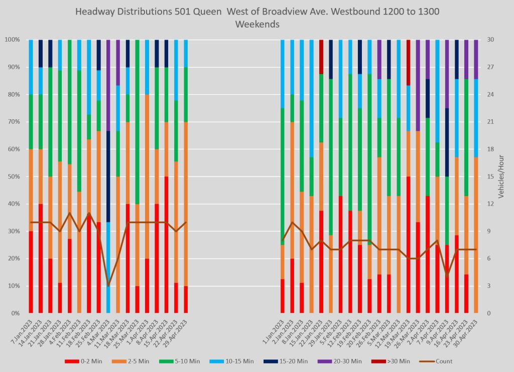 In all of the charts, the same headway bands are used regardless of the scheduled frequency. The intent is not to track service versus the scheduled level, but to show what proportion lies in a “bunched” or “gapped” group as well the ranges more commonly expected by riders. Most routes in Toronto operate on headways in the 5-15 minute range, and my preference was for a standard chart layout that would not have to be adjusted for various routes and conditions.