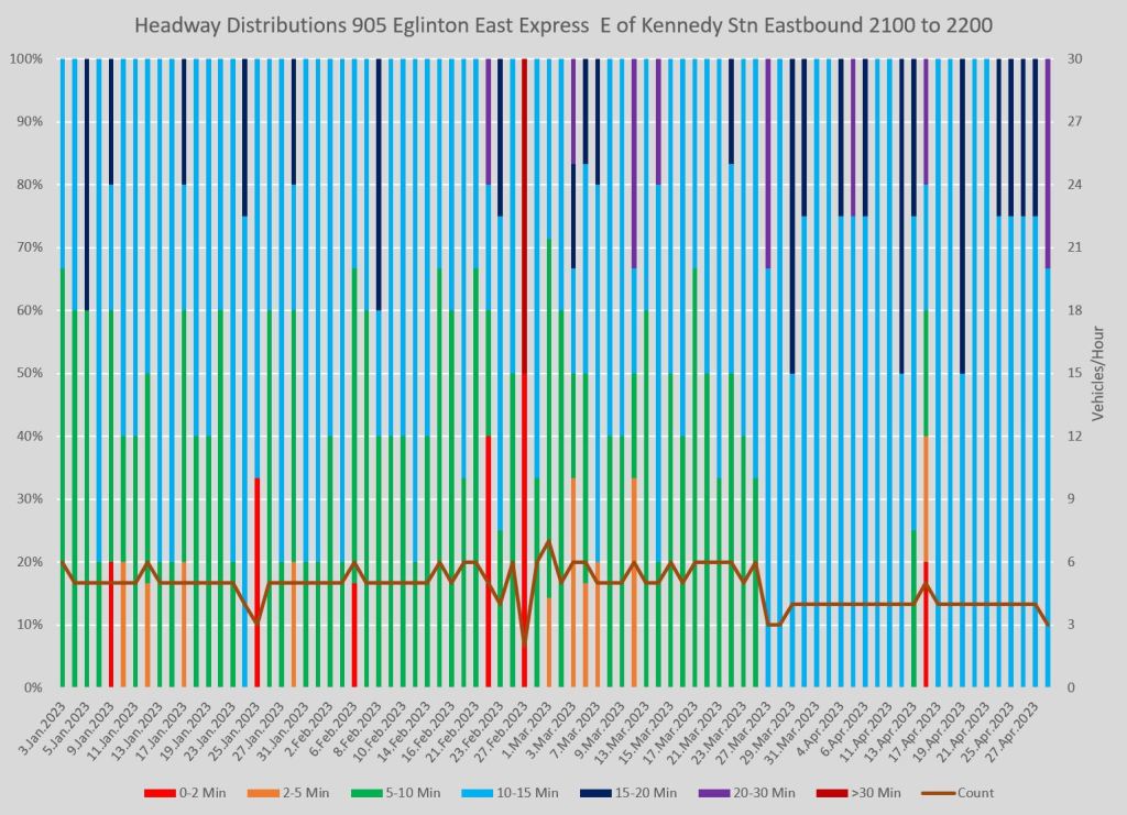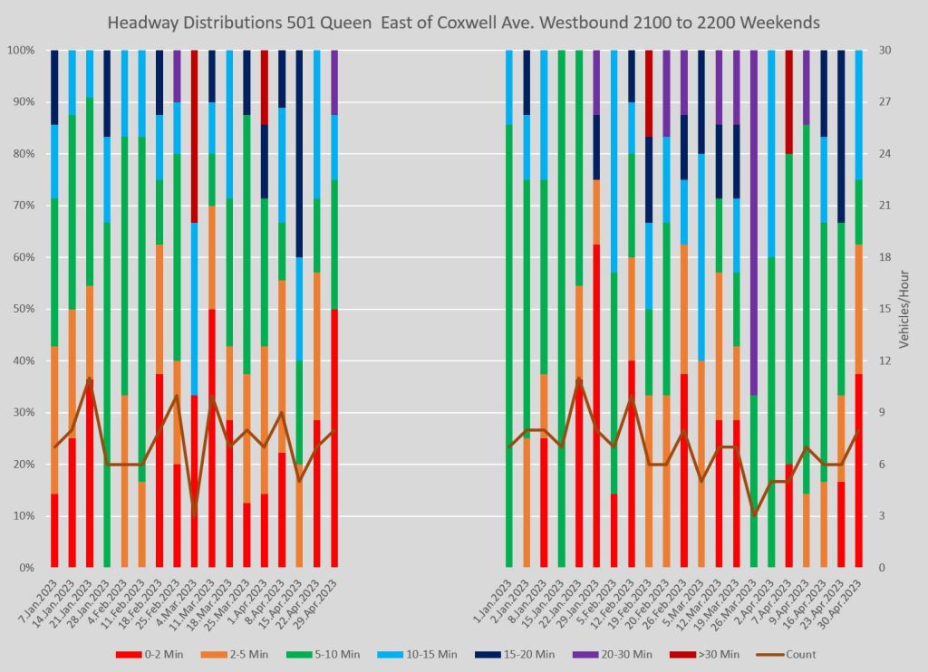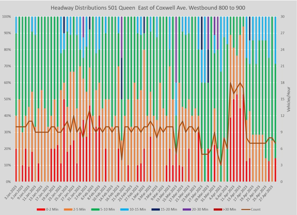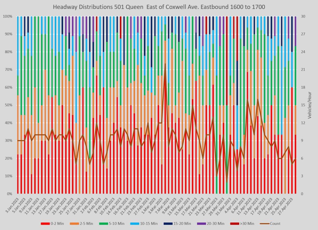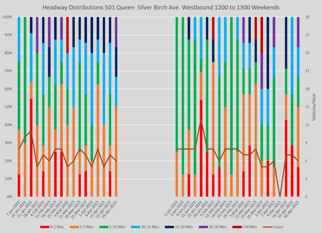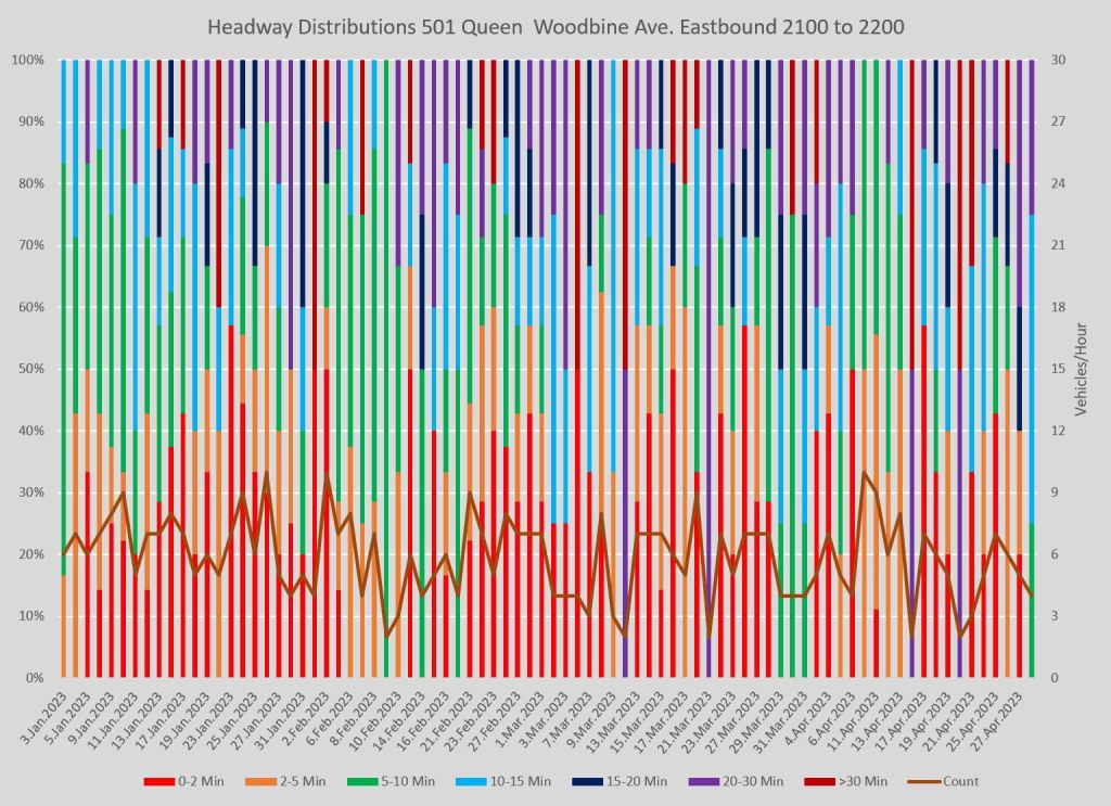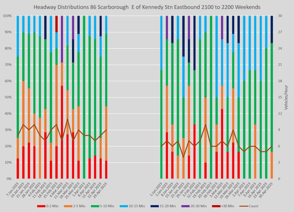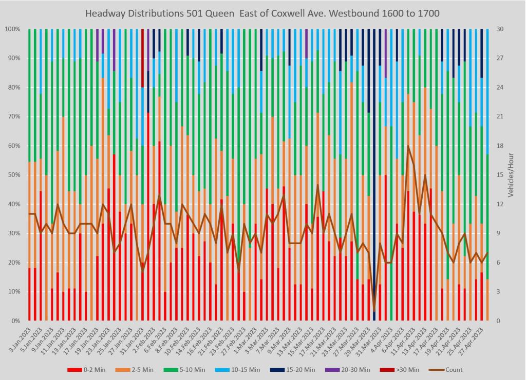 In all of the charts, the same headway bands are used regardless of the scheduled frequency. The intent is not to track service versus the scheduled level, but to show what proportion lies in a “bunched” or “gapped” group as well the ranges more commonly expected by riders. Most routes in Toronto operate on headways in the 5-15 minute range, and my preference was for a standard chart layout that would not have to be adjusted for various routes and conditions.