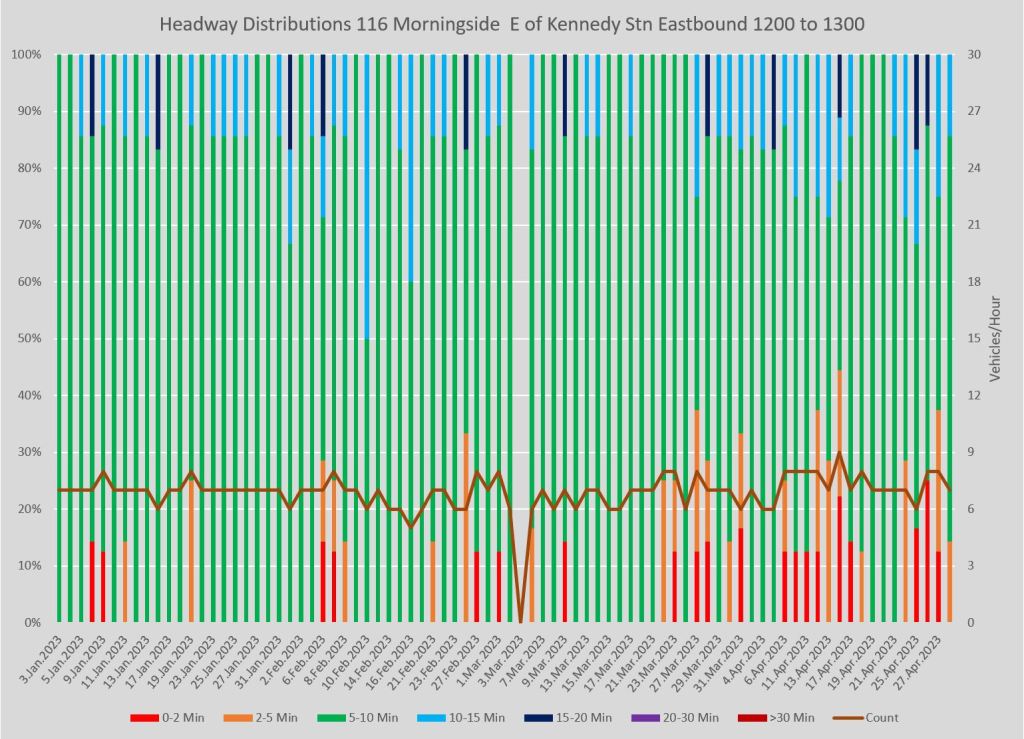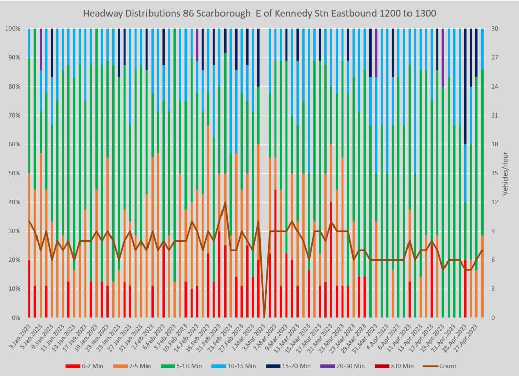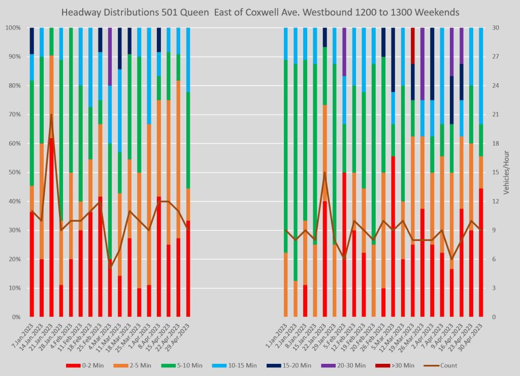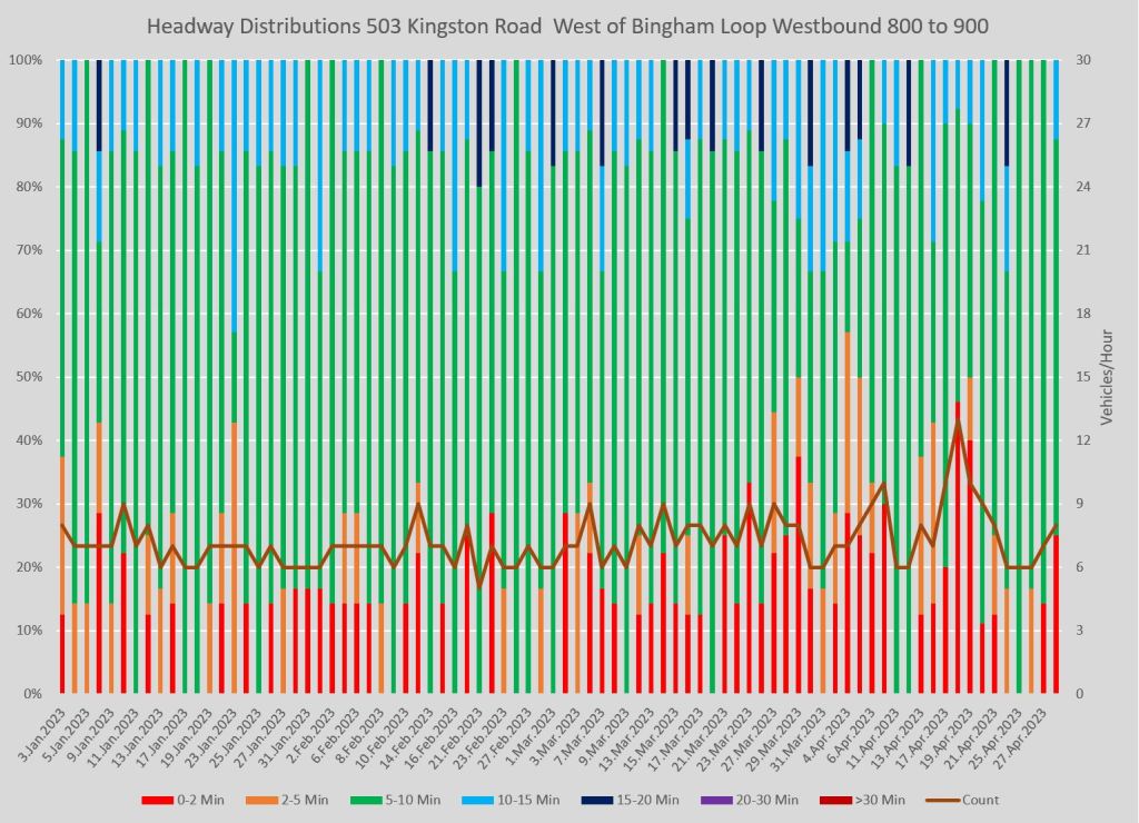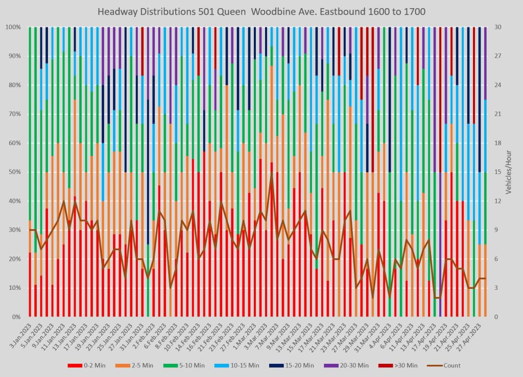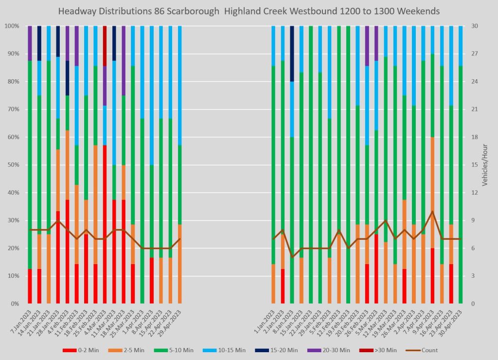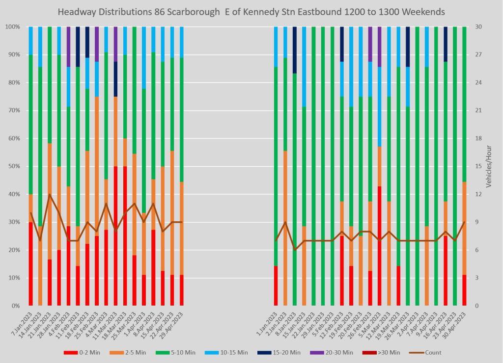 In all of the charts, the same headway bands are used regardless of the scheduled frequency. The intent is not to track service versus the scheduled level, but to show what proportion lies in a “bunched” or “gapped” group as well the ranges more commonly expected by riders. Most routes in Toronto operate on headways in the 5-15 minute range, and my preference was for a standard chart layout that would not have to be adjusted for various routes and conditions.
