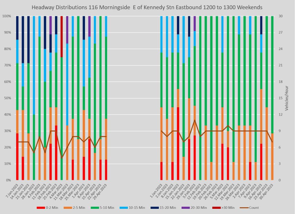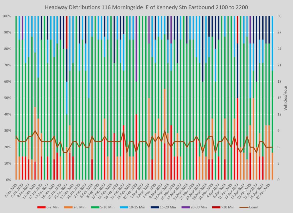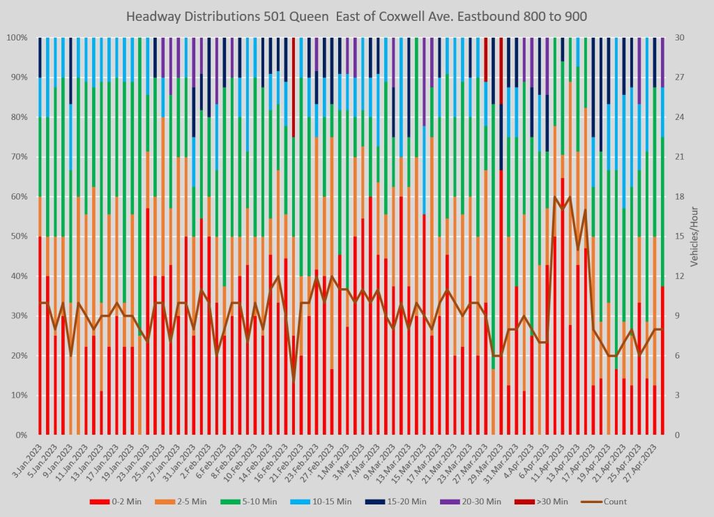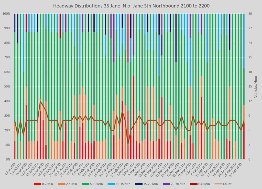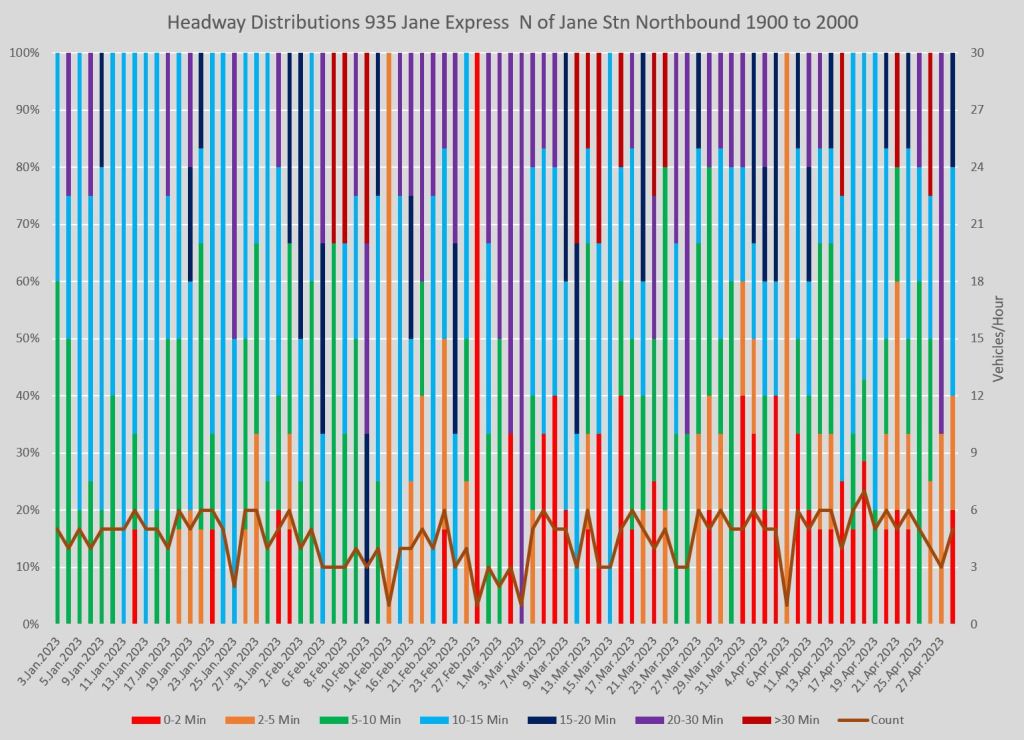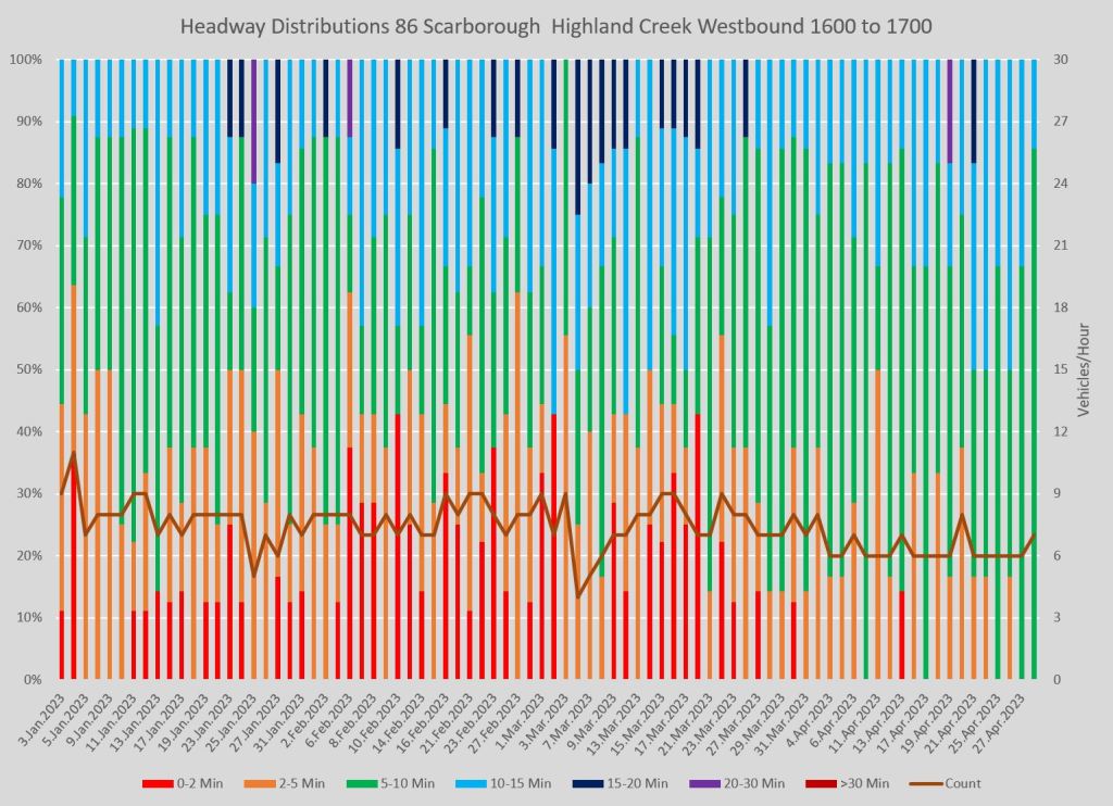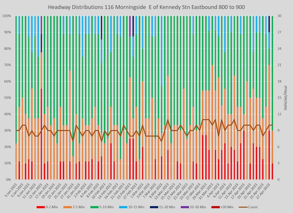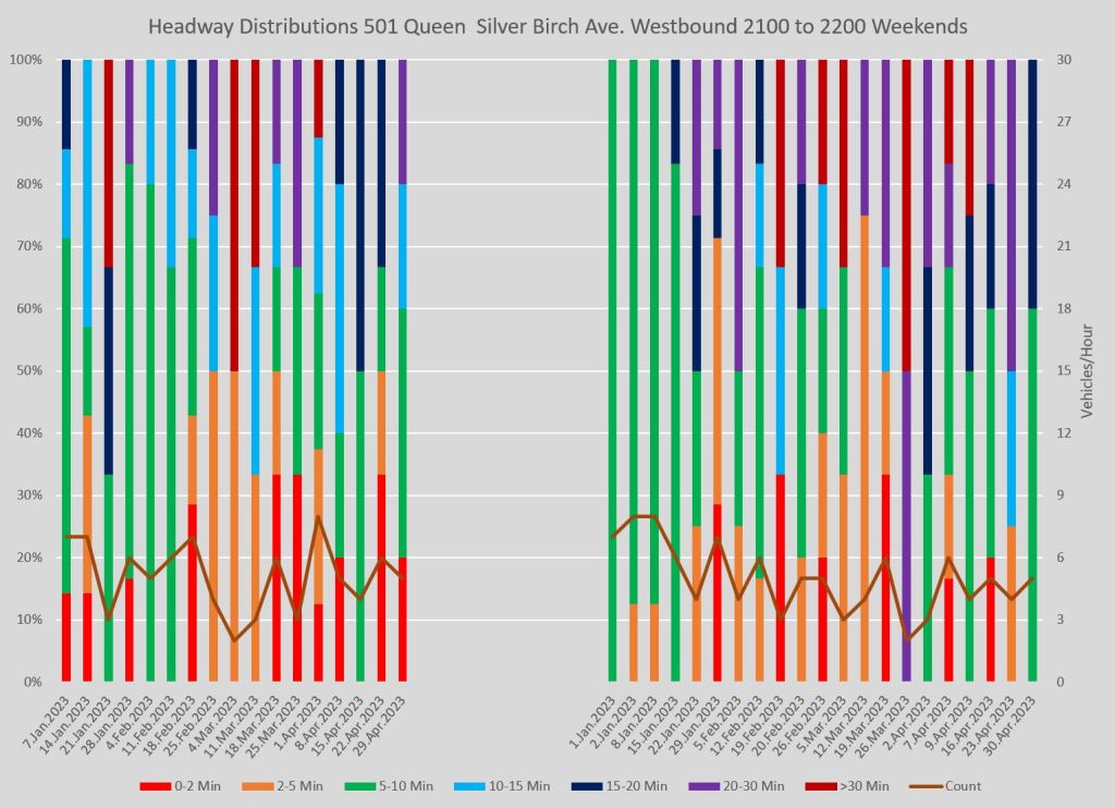 In all of the charts, the same headway bands are used regardless of the scheduled frequency. The intent is not to track service versus the scheduled level, but to show what proportion lies in a “bunched” or “gapped” group as well the ranges more commonly expected by riders. Most routes in Toronto operate on headways in the 5-15 minute range, and my preference was for a standard chart layout that would not have to be adjusted for various routes and conditions.