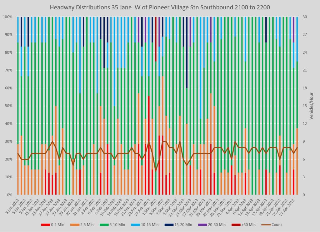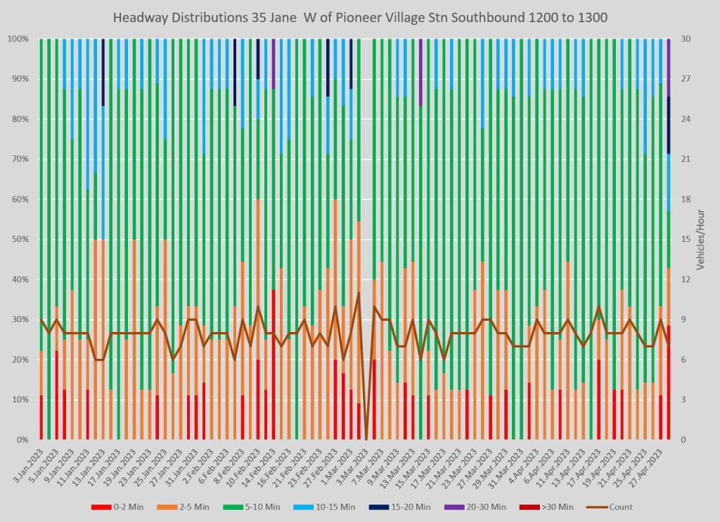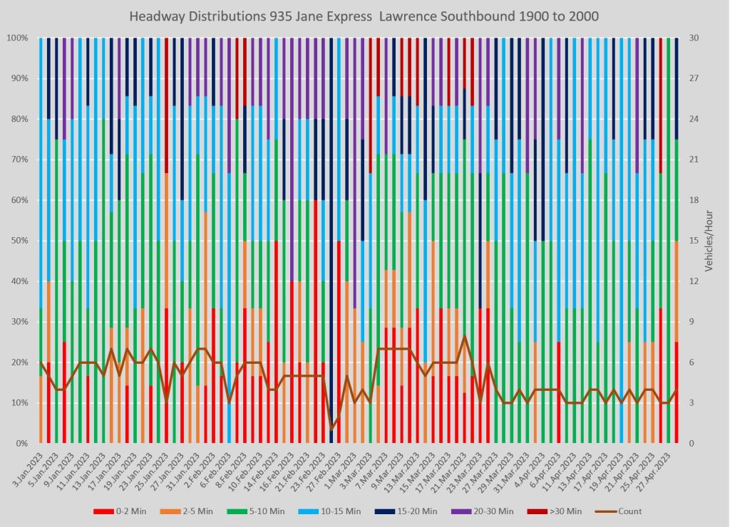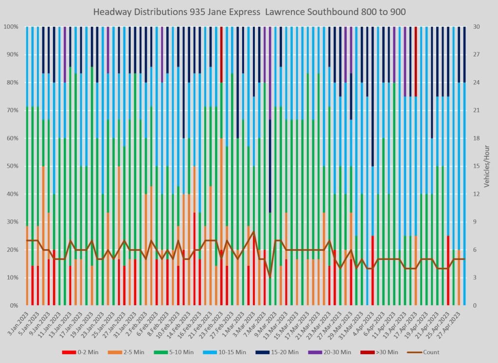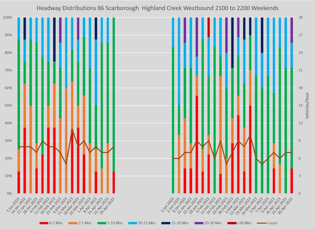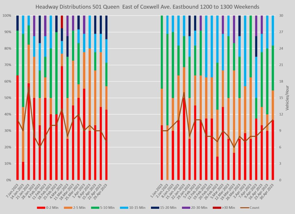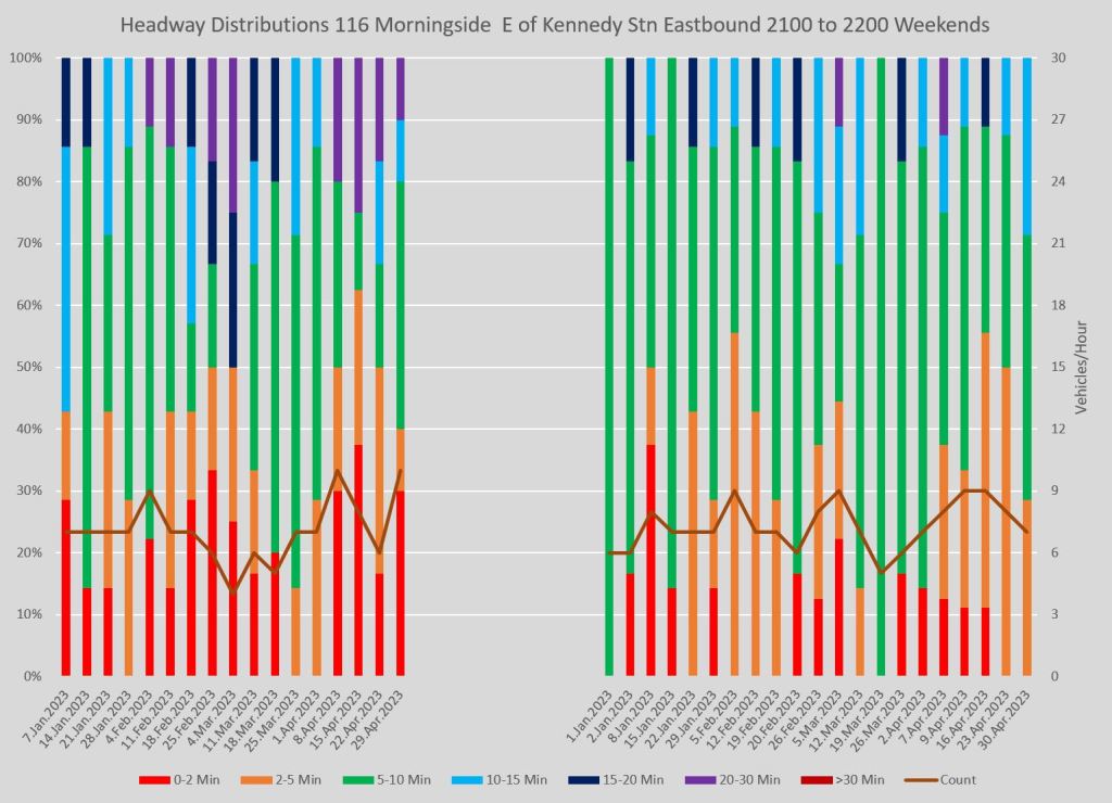 In all of the charts, the same headway bands are used regardless of the scheduled frequency. The intent is not to track service versus the scheduled level, but to show what proportion lies in a “bunched” or “gapped” group as well the ranges more commonly expected by riders. Most routes in Toronto operate on headways in the 5-15 minute range, and my preference was for a standard chart layout that would not have to be adjusted for various routes and conditions.