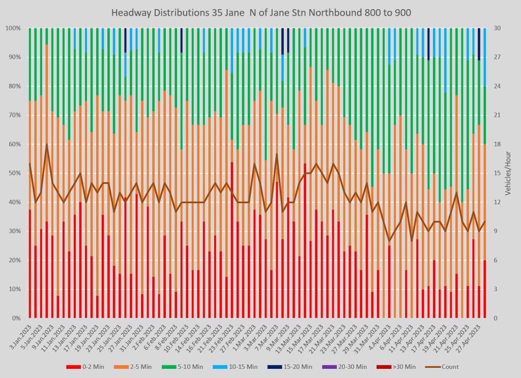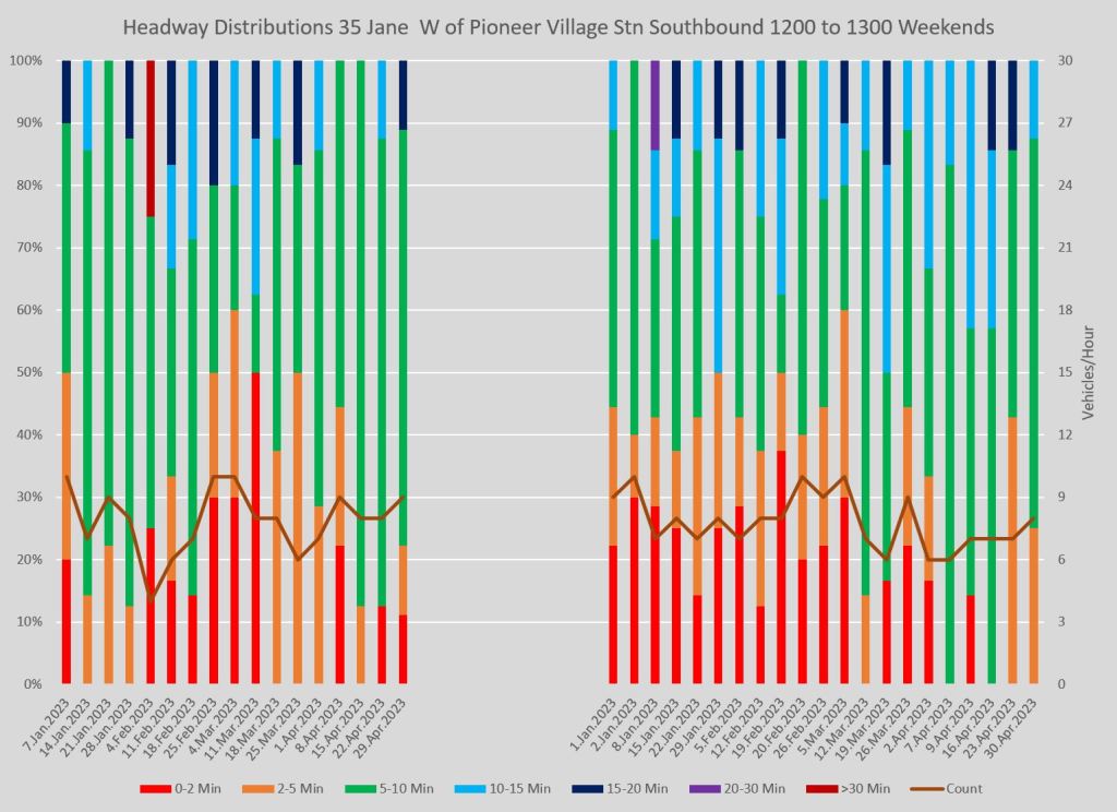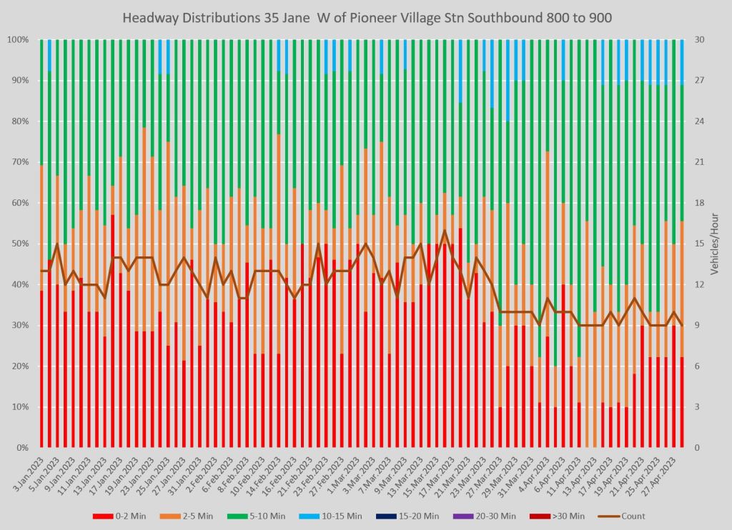 At midday, the count of vehicles/hour does not bounce around quite as much as the 8am and 4pm charts. The red area is smaller, sometimes down near 10% which would probably be one bus at the scheduled service level. There are still incursions at the top of the chart showing a wide gap, again probably one bus.