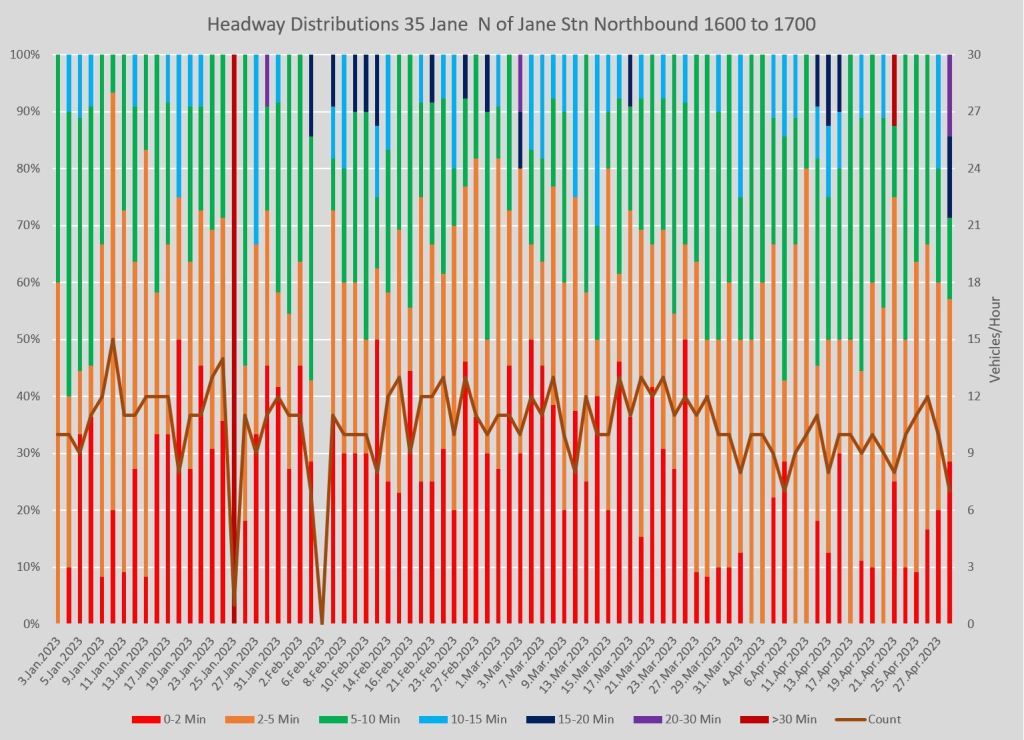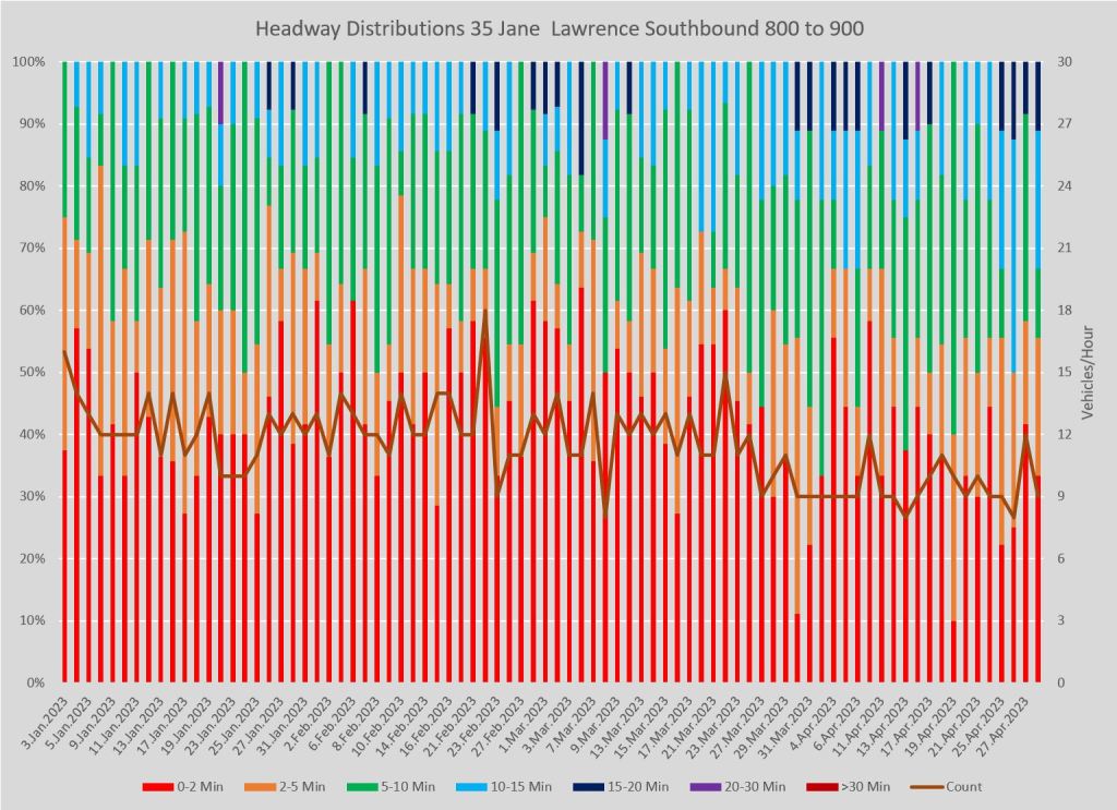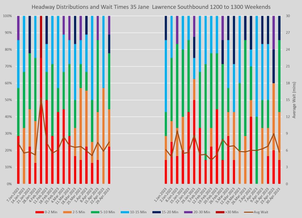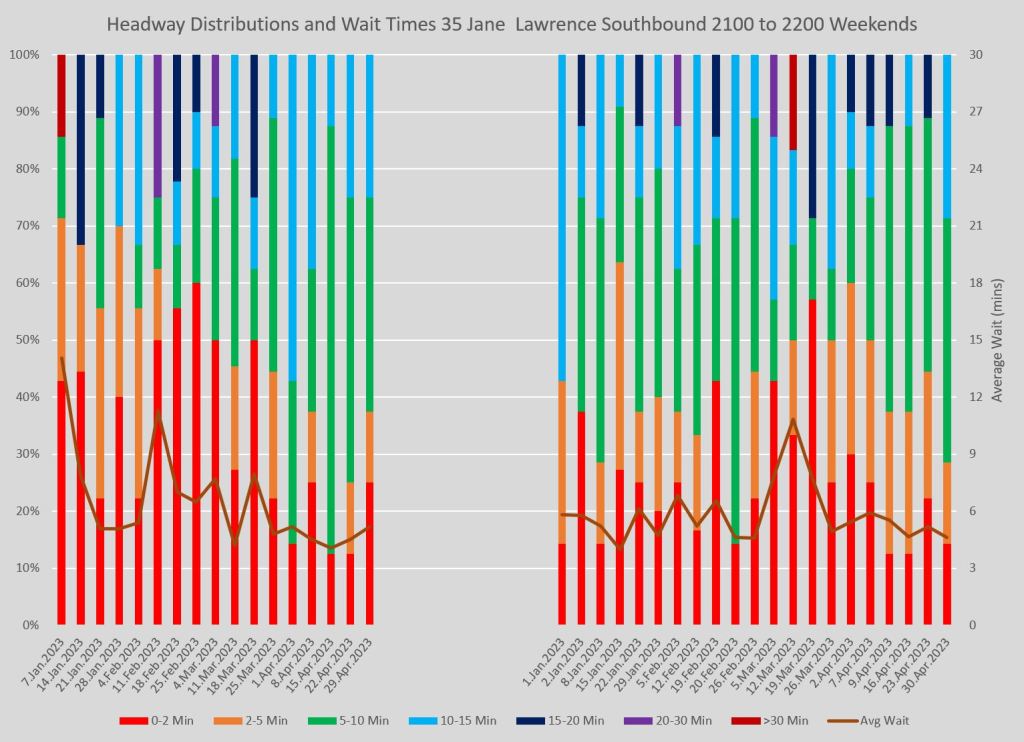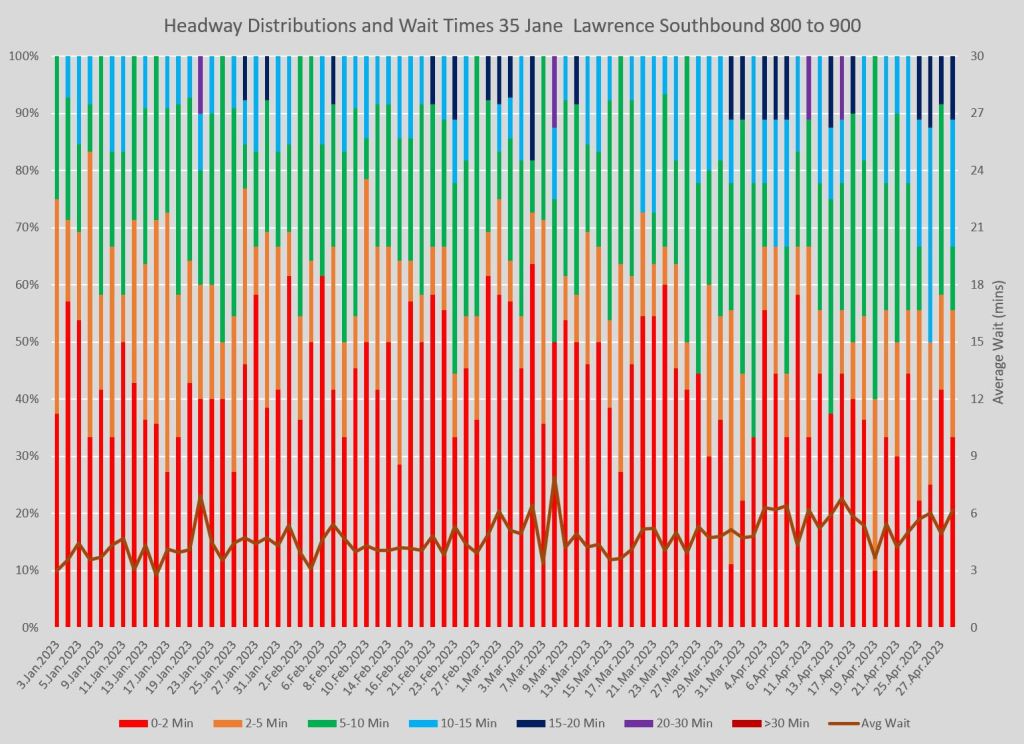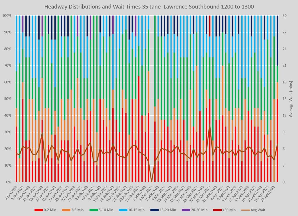 Here is the sample chart for 35 Jane southbound at Lawrence with the average wait time values.