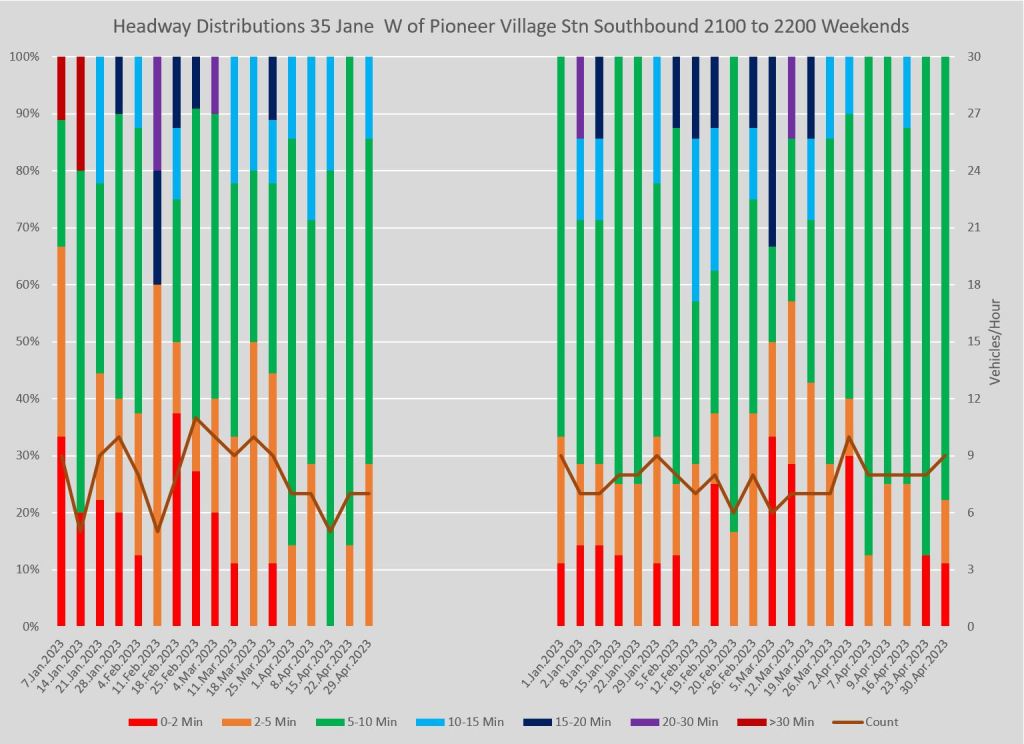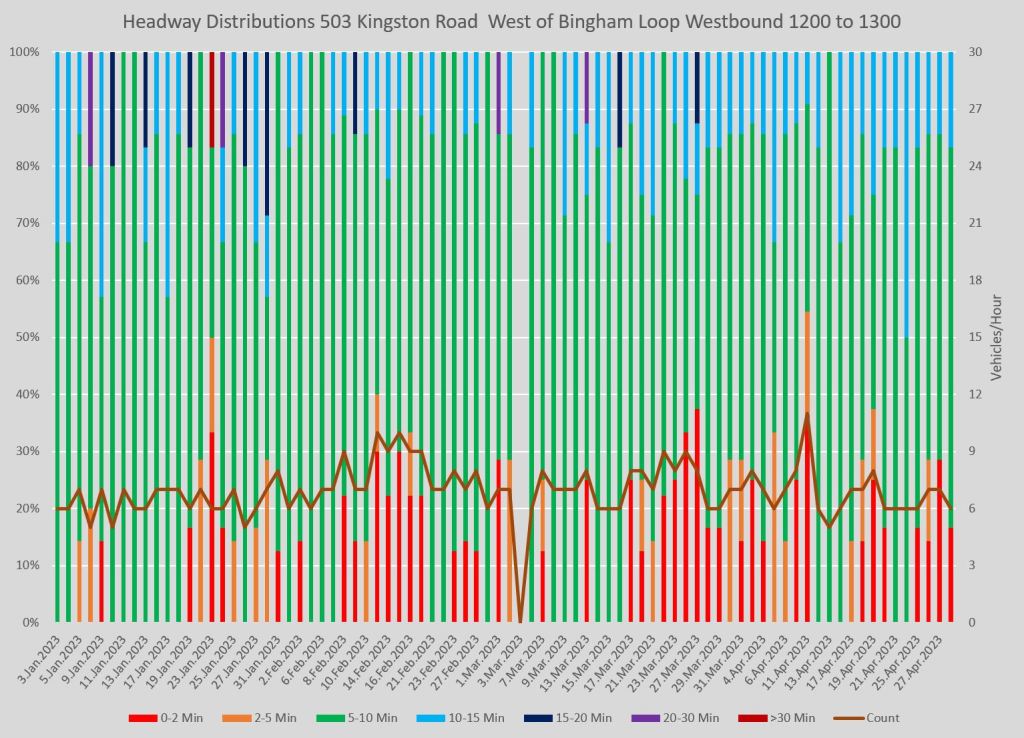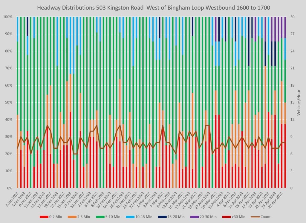 Note how the proportion of short headways grows as we travel west showing how a problem with irregular departures from Neville is magnified along the route as pairs of vehicles catch up with each other. Measuring service quality measured only at the terminal understates the effect of bunching further along the line.