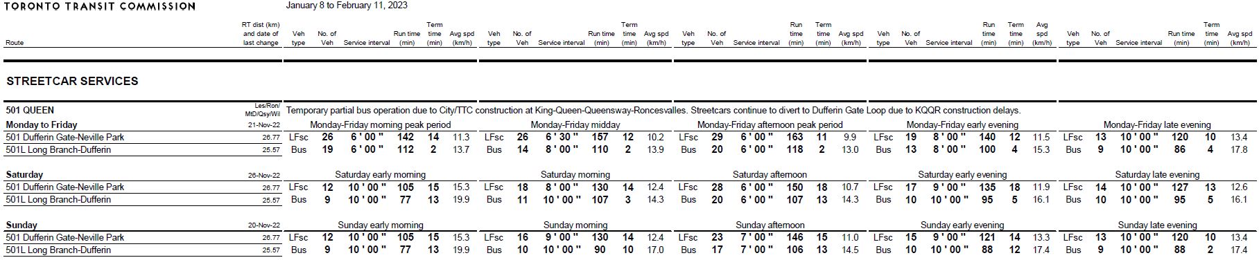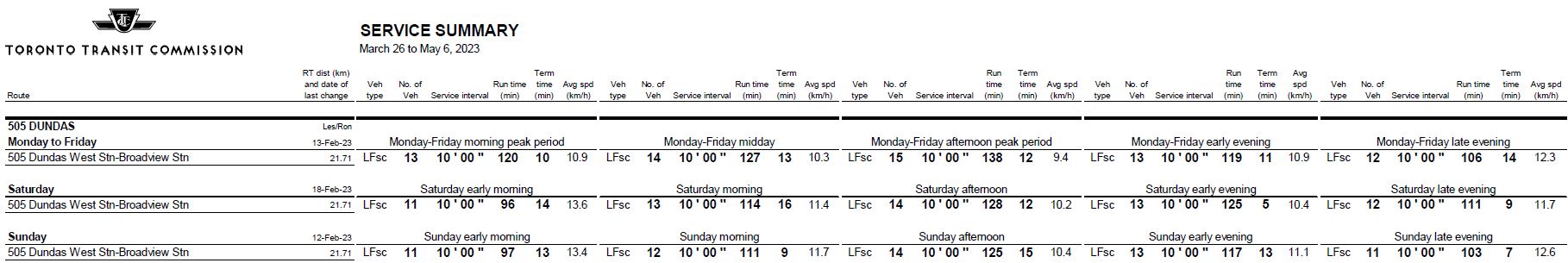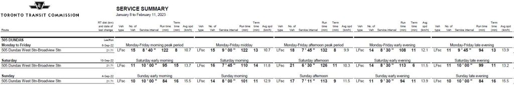 505 Dundas service was reduced in mid-February 2023, in some cases quite substantially. Headways that ranged from 6’30” to 10’00” at various times were changed to 10’00” at all hours. Running times were also extended to improve service reliability.