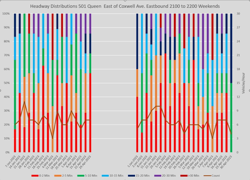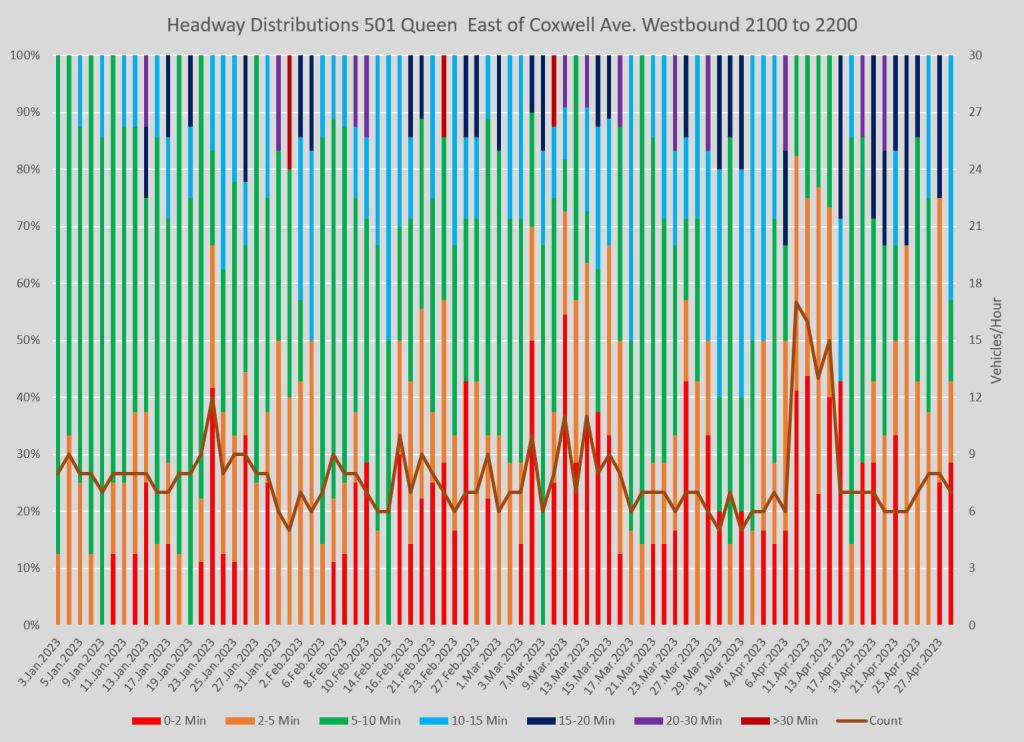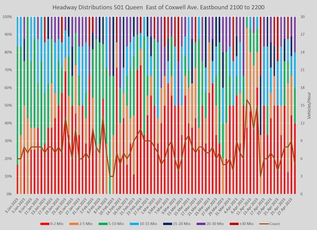The data here show the behaviour of the 501 Queen car at the east end of the line. Note that this predates the effect of Ontario Line construction diversions.