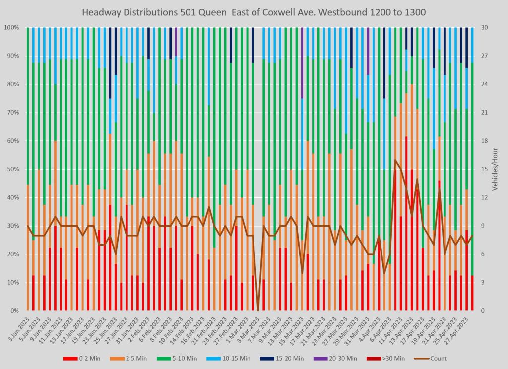 - The spike in vehicles/hour counts at Coxwell in April is due to a temporary bus substitution for track work east of Woodbine. The substitute buses ran far more frequently than the scheduled streetcars.