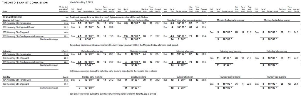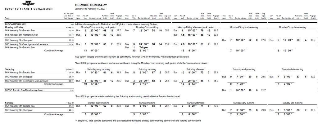 Service on the 86 Scarborough route had two changes over the period covered here: