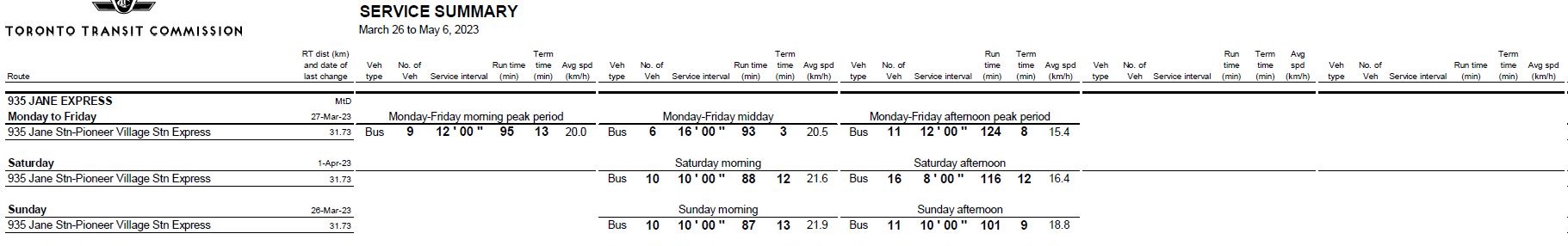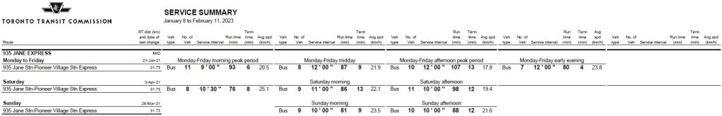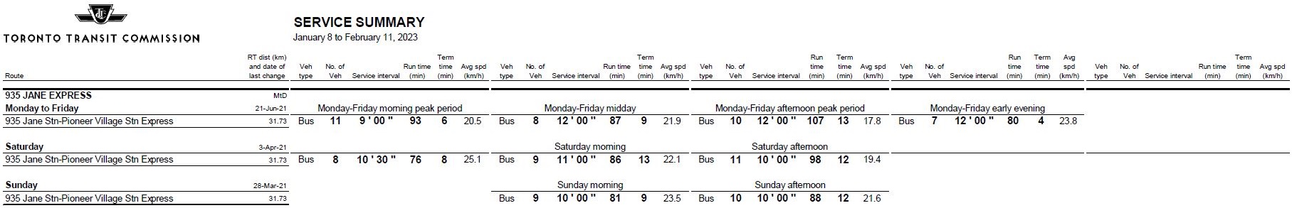 For reference, here are the service designs for 935 Jane Express as of the beginning of 2023 and effective March 26.
