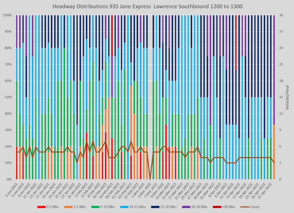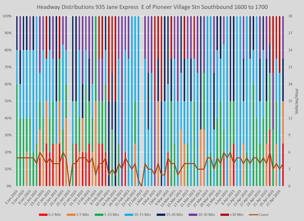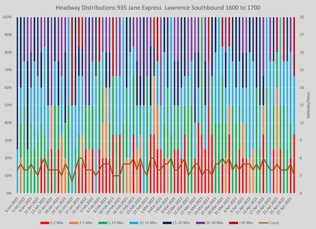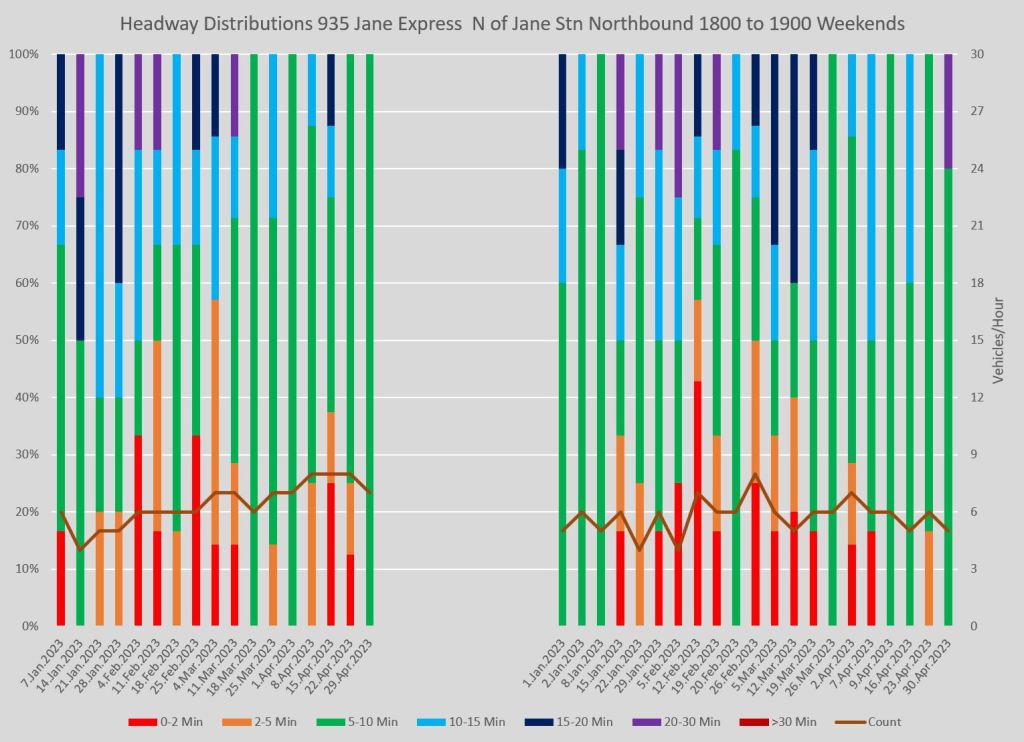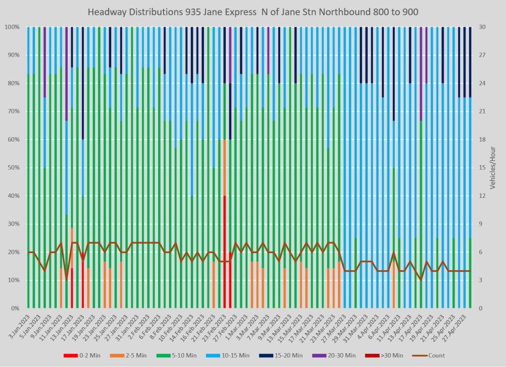 Service on the 935 Express is less frequent than on the local 35 Jane bus, and headway reliability is more important because with fewer buses, the gaps can be bigger and negate the faster travel time of a so-called express service.
