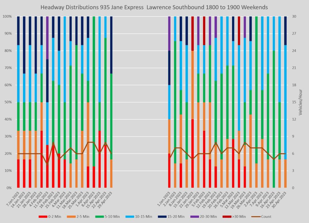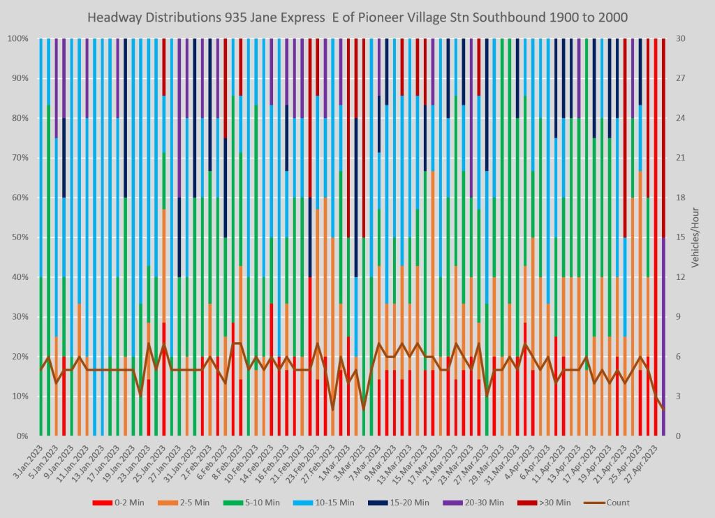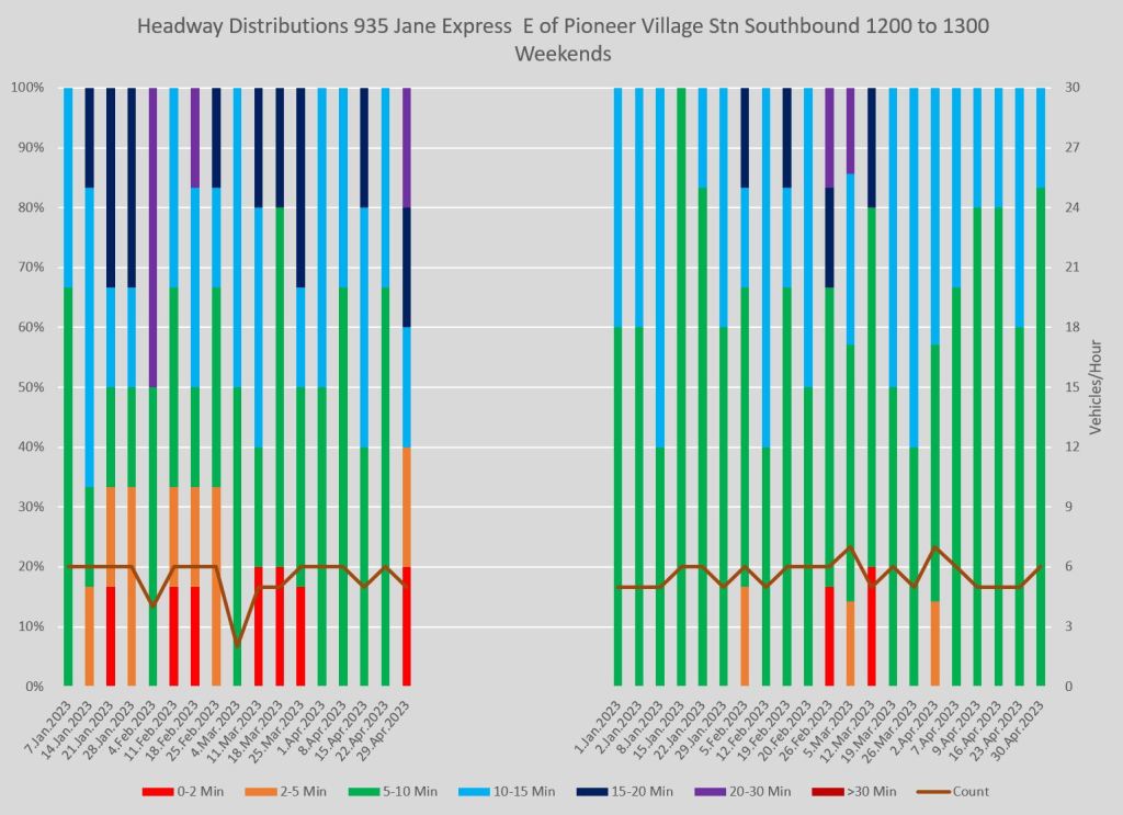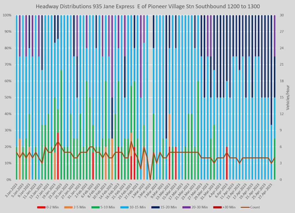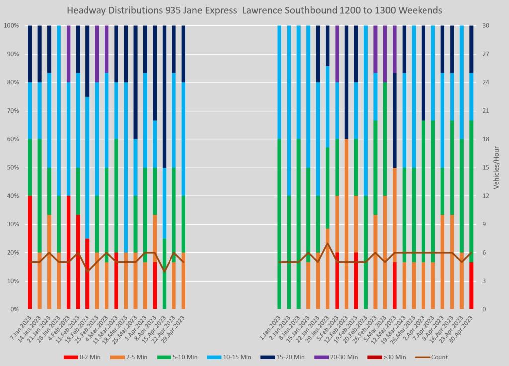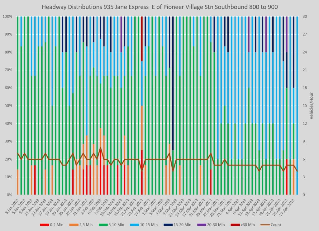 Service on the 935 Express is less frequent than on the local 35 Jane bus, and headway reliability is more important because with fewer buses, the gaps can be bigger and negate the faster travel time of a so-called express service.