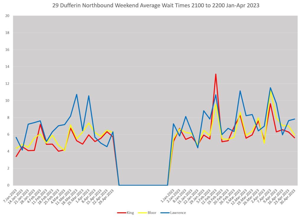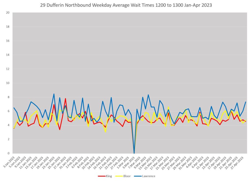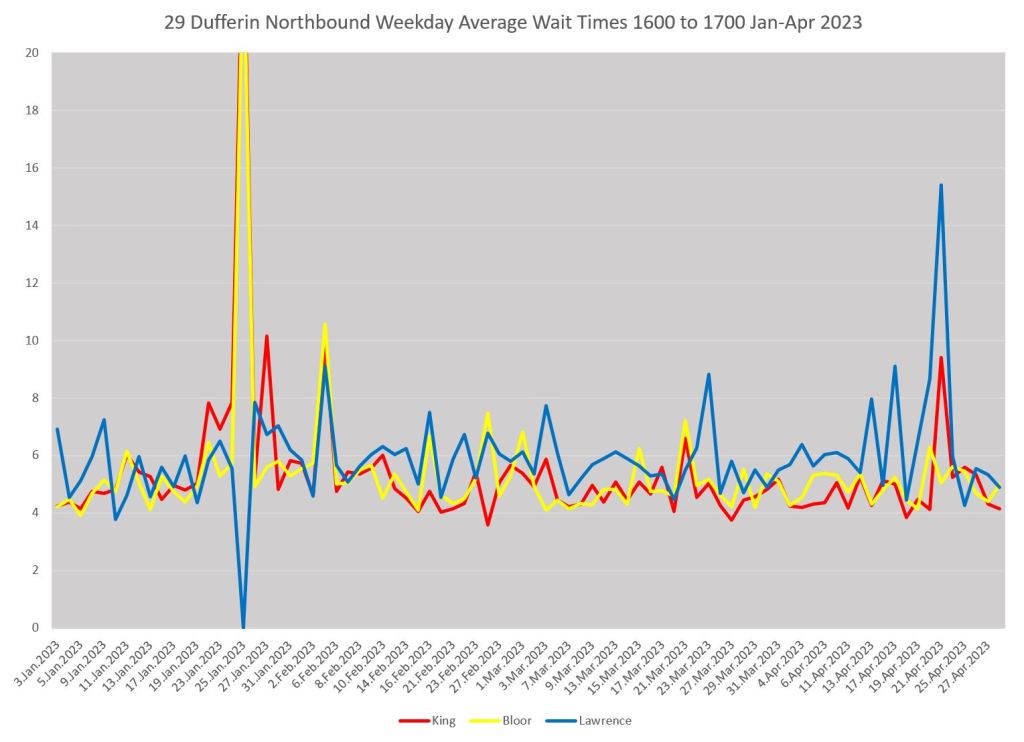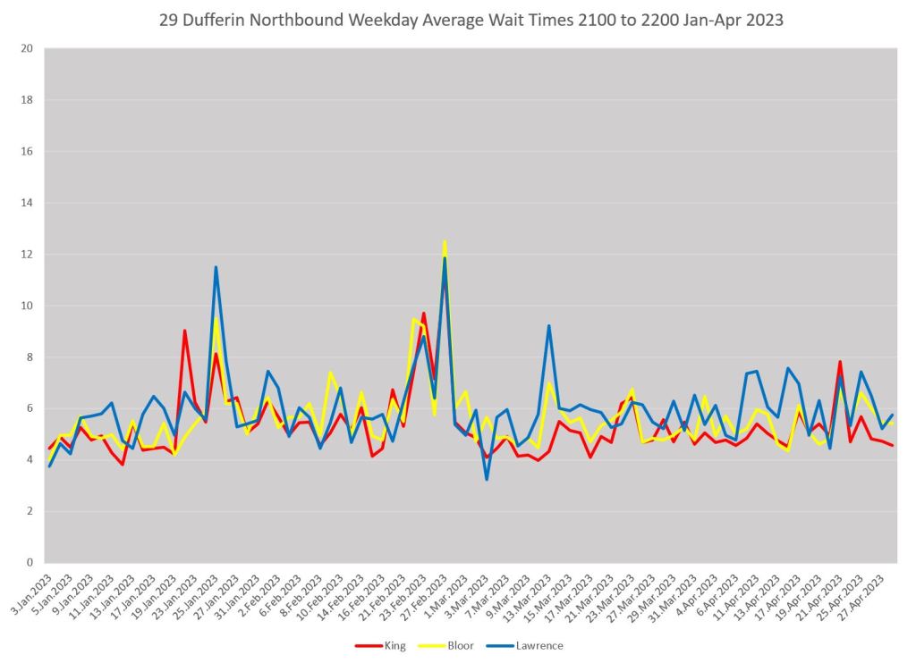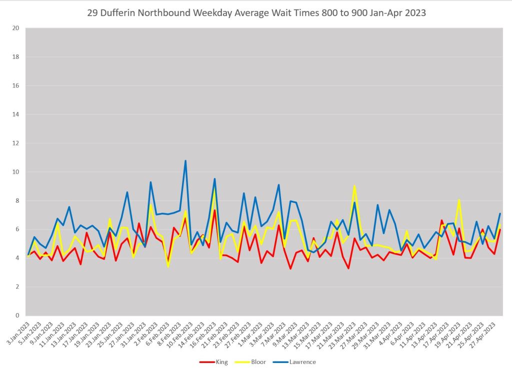 Here is a comparable set of charts for 29 Dufferin northbound as seen at King (red), Bloor (yellow) and Lawrence (blue).