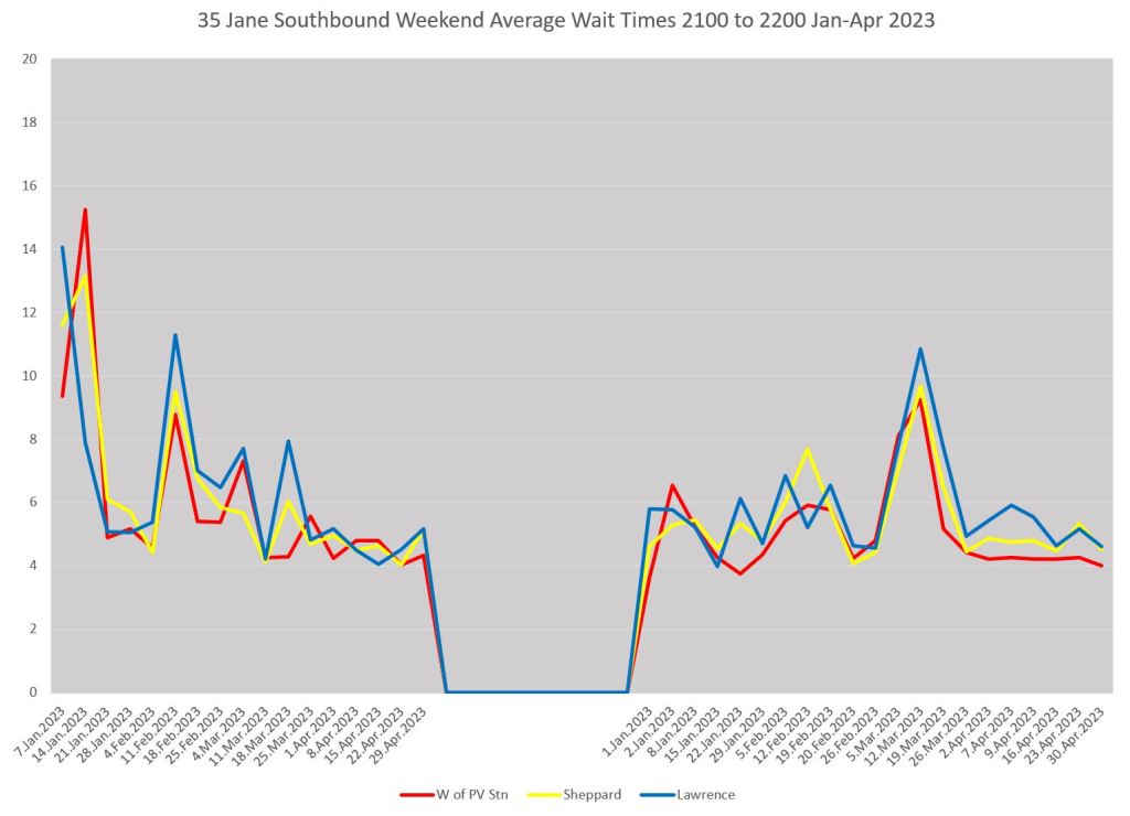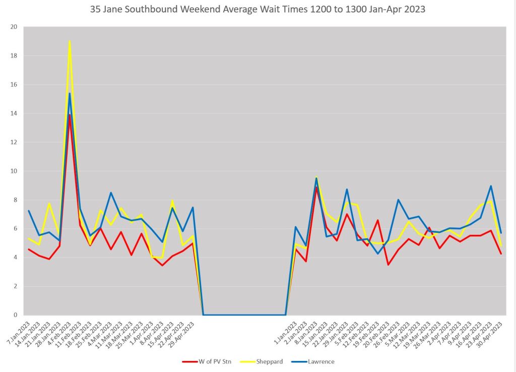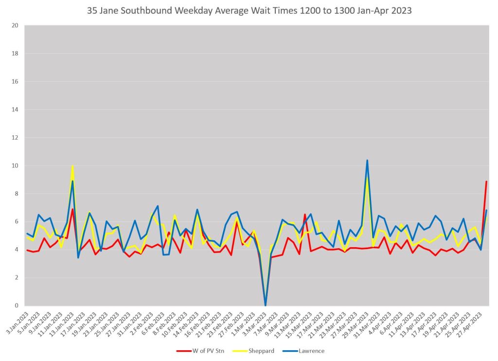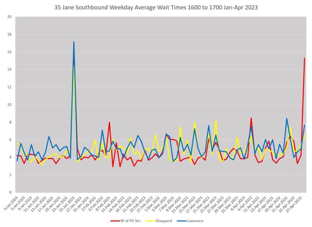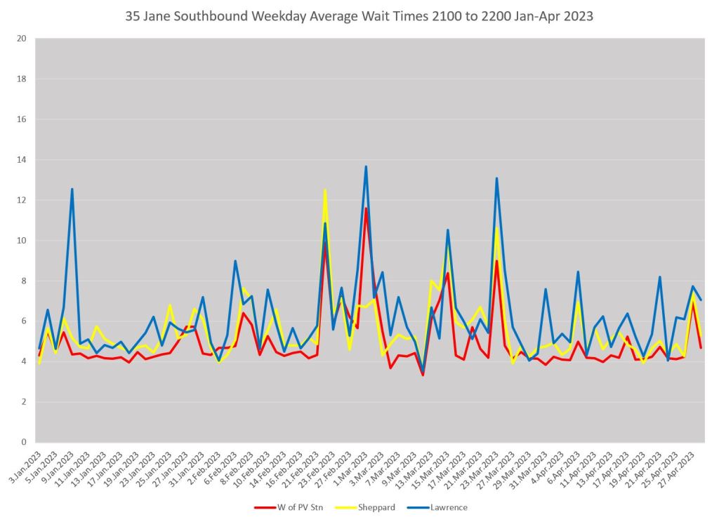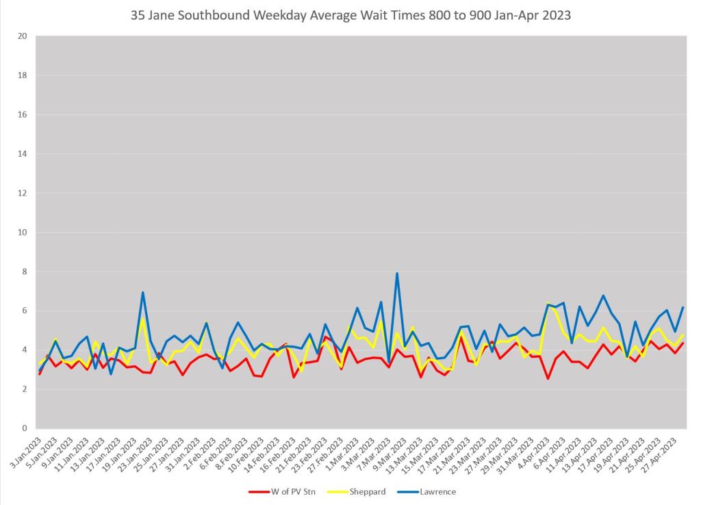 A typical situation on any route is that whatever service quality might exist is seen at the terminal. From that point onward bunches get closer together and gaps get wider. The charts below show weekday average wait times leaving Pioneer Village Station (red), at Sheppard (yellow) and at Lawrence (blue).