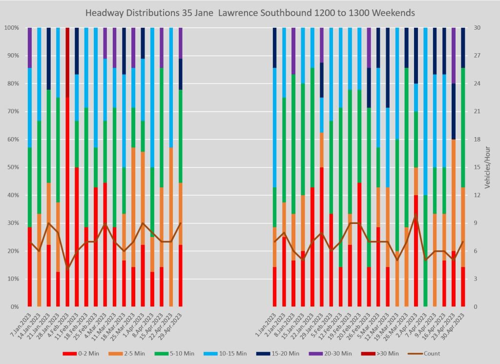 Here is a pair of charts for weekend service. Note that the Sunday portion on the right includes stat holidays and so there are more columns than for Saturday on the left.