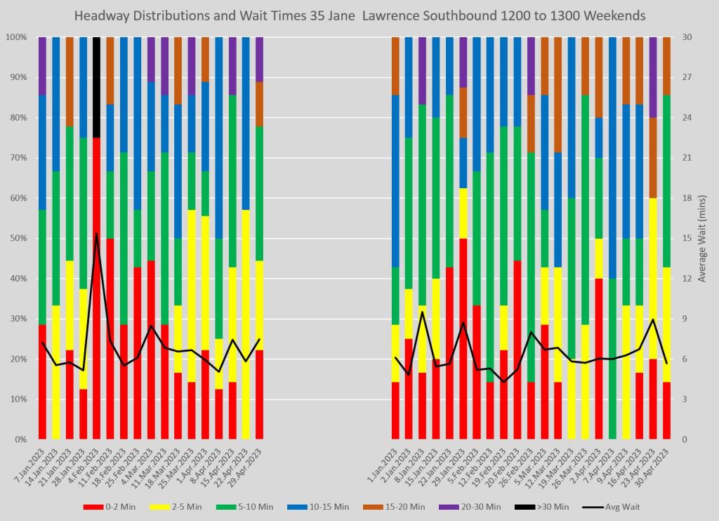 My intent in developing this new type of chart is to add to the repertoire of charts I publish when reviewing a route’s performance and to show how, or if, changes the TTC makes to schedules affect service riders actually encounter.