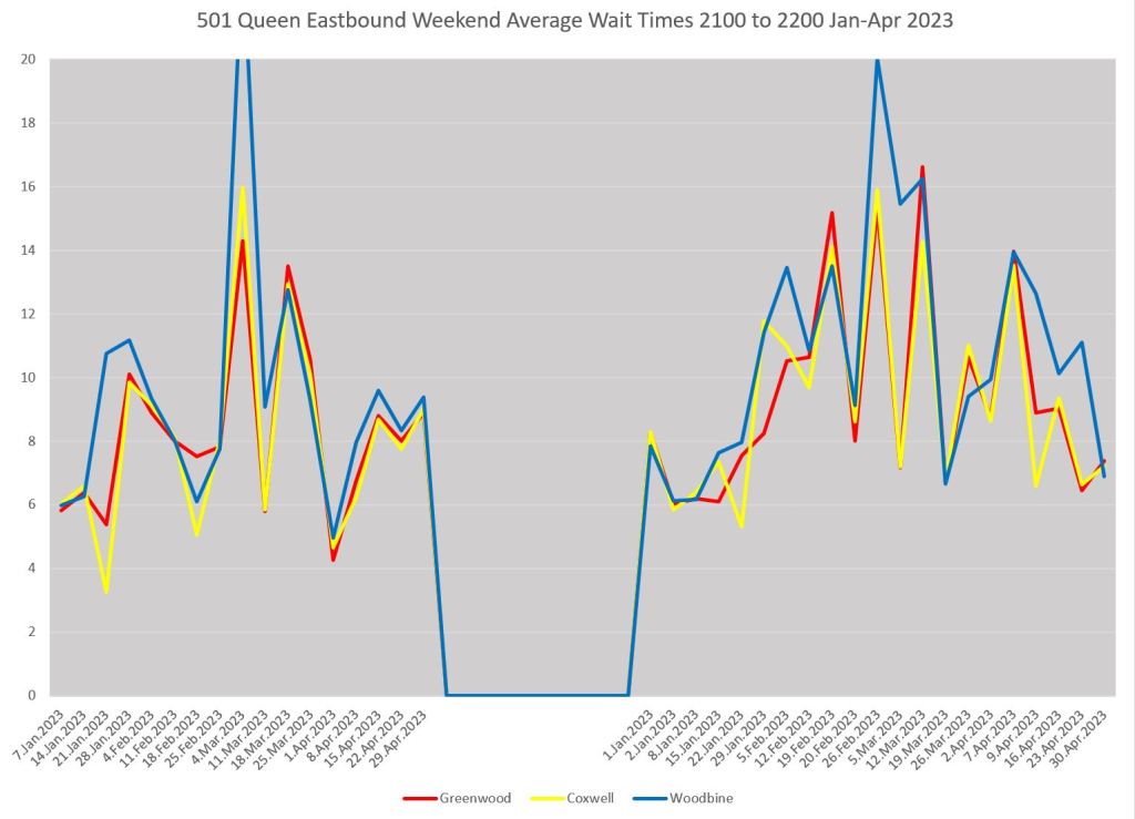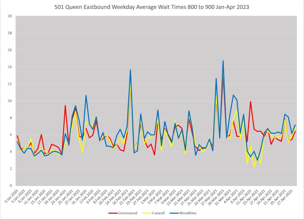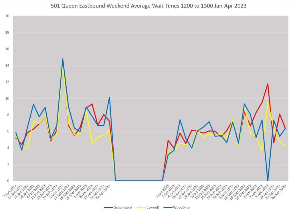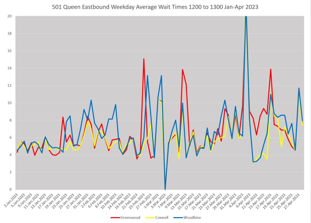 (Note: During a period in early April, buses replaced streetcars east from Coxwell. This results in counting of both types of vehicles at the Coxwell screenline during that period. I have not filtered out this effect because it illustrates how one must take care to deal with exceptional conditions on routes.)