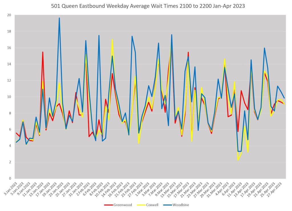 Another variation on this shows the effect of short turns affecting service at the eastern end of the 501 Queen car. The service is already erratic eastbound at Greenwood (just west of Russell Carhouse, red), and it gets worse by Coxwell (yellow), and even worse by Woodbine (blue). Weekday evenings are particularly bad. There is a short turn location between each of these points (Russell Carhouse and Woodbine Loop at Kingston Road).