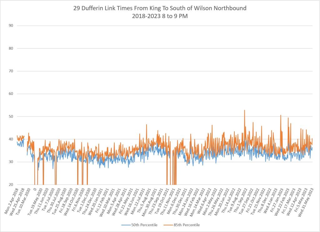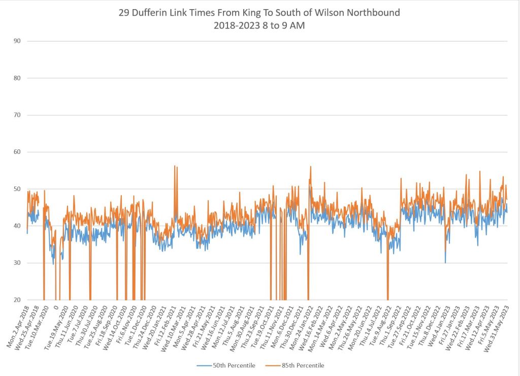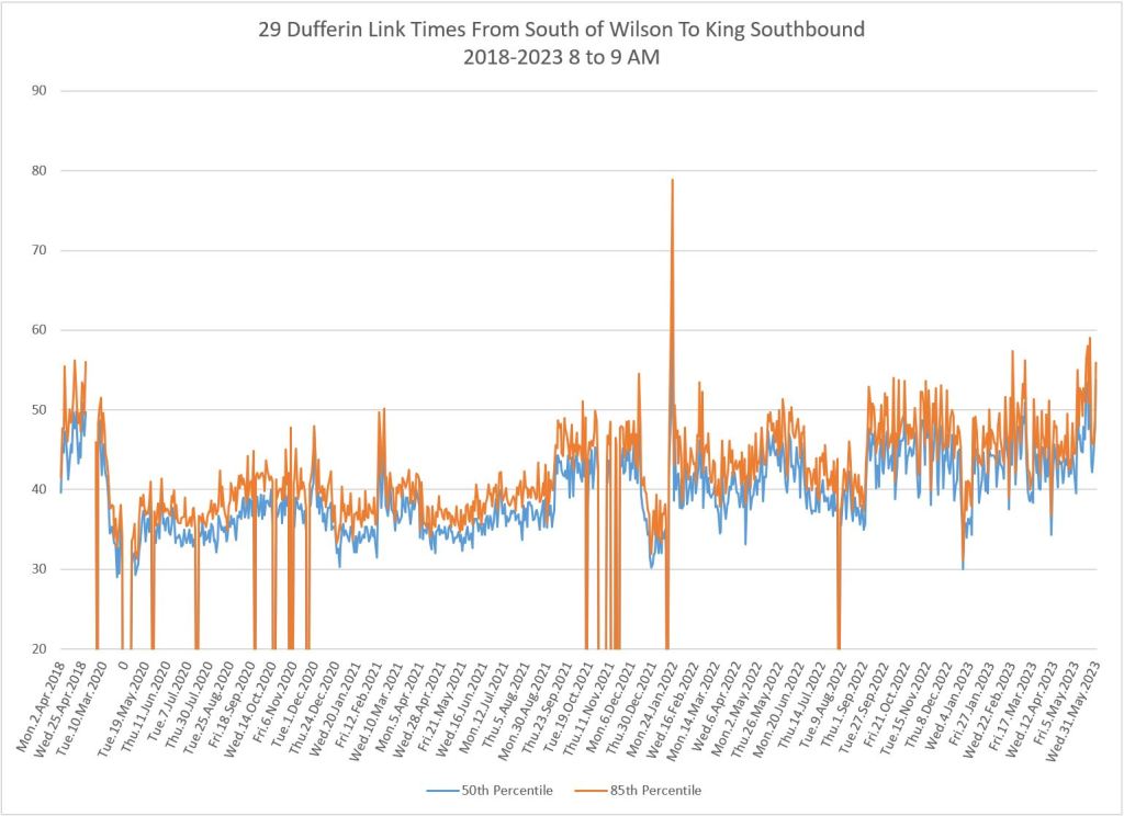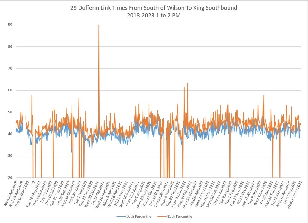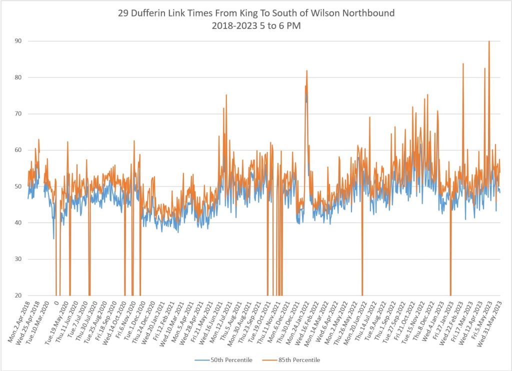 - At some peaks in the 85th percentile values are quite high. By analogy to the King Street project, shaving these peaks and achieving consistent travel times will be an important effect, if it can be achieved, of any priority scheme.
