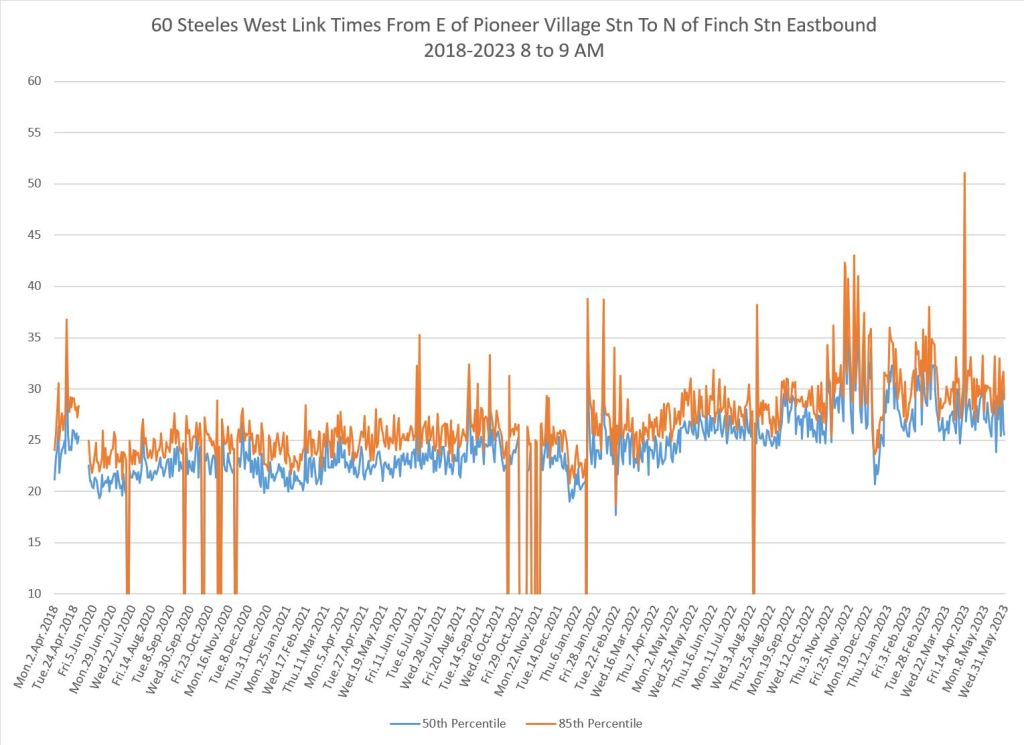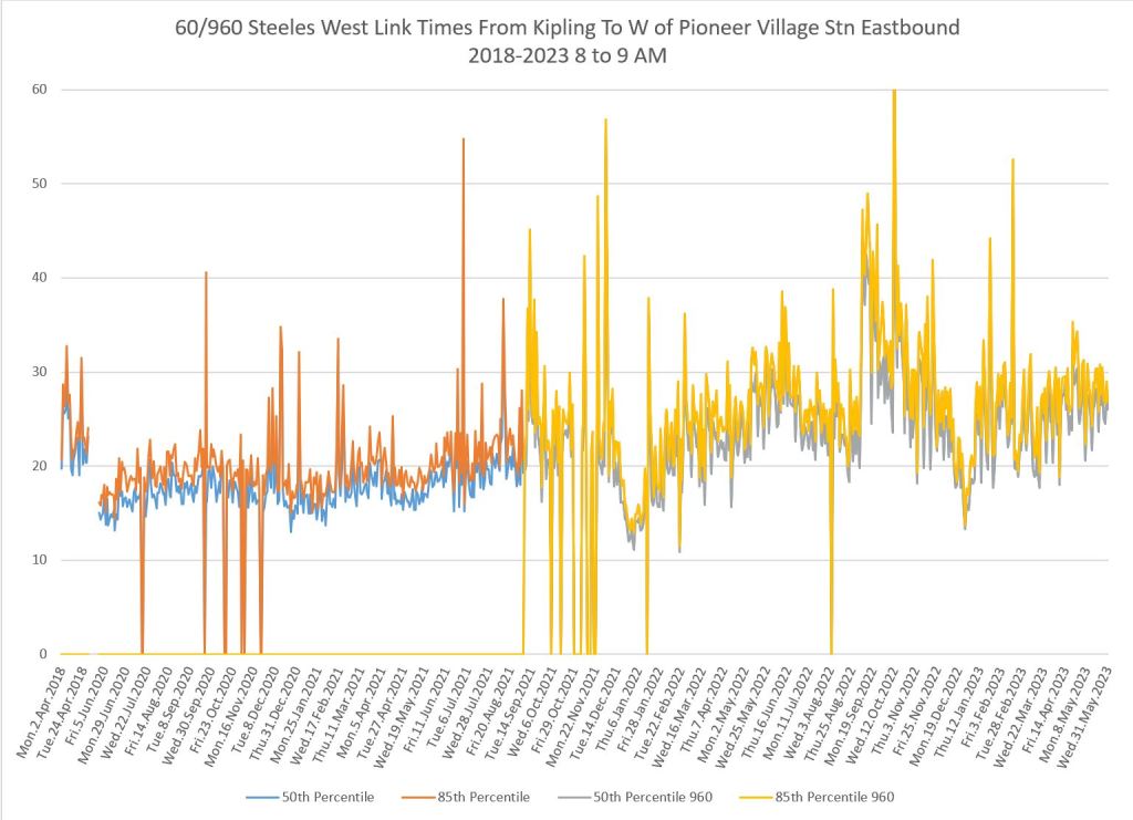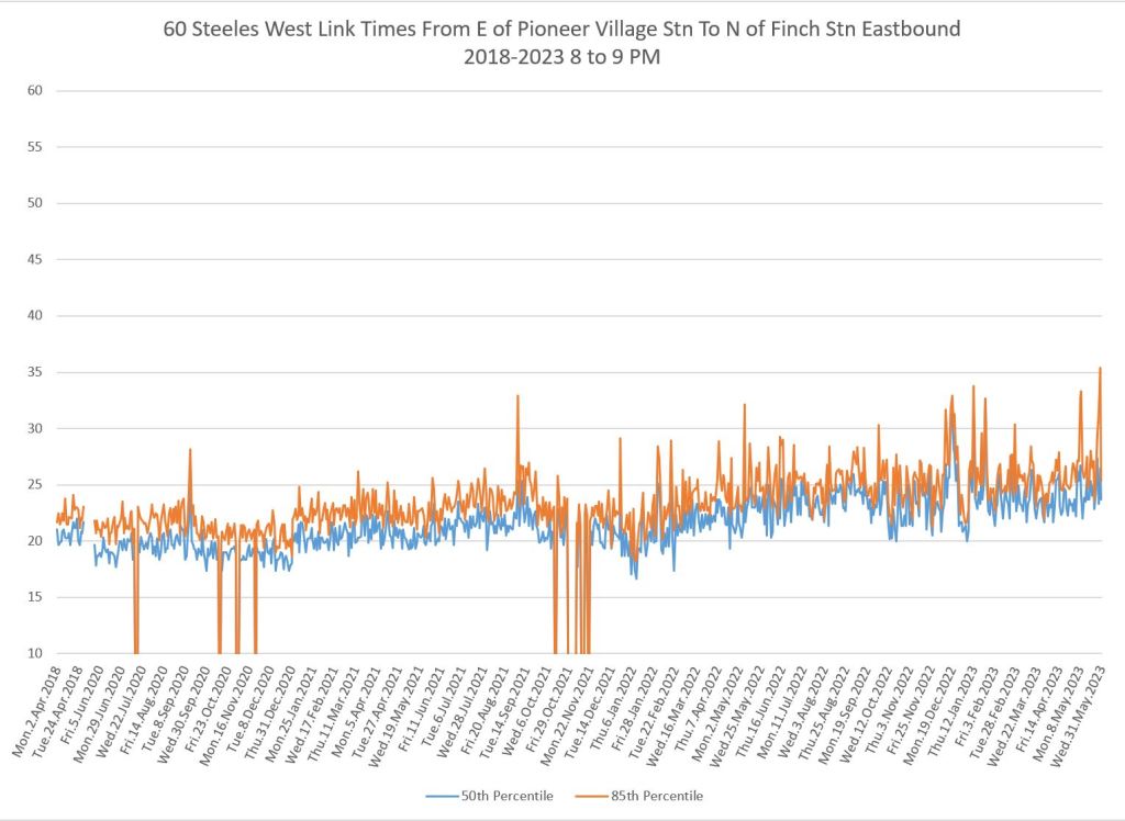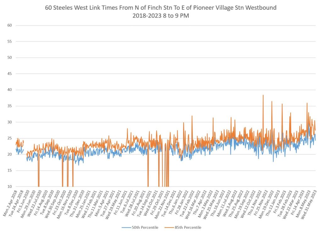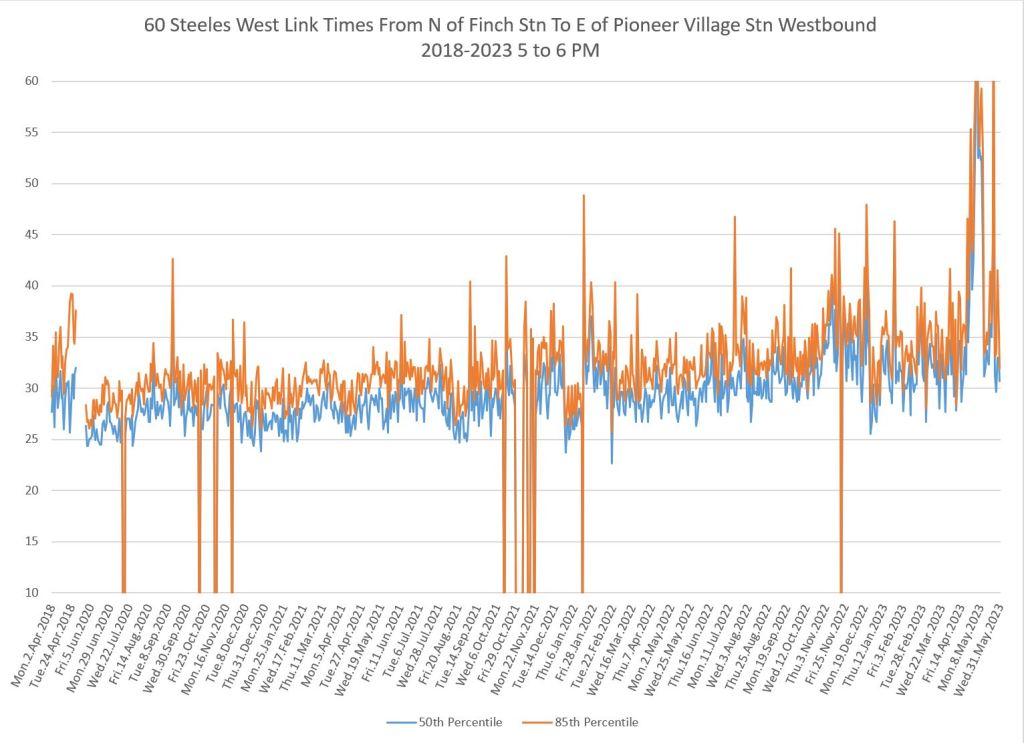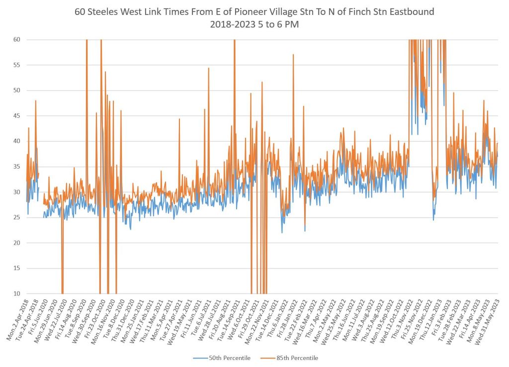 The format of charts used here is different from previous articles which summarized data on a weekly or monthly basis, subdivided by hour of the day. As the number of data points grew, these charts were no longer workable. Here I have adopted the style used in, among other things, my tracking of travel times on King Street which include day-by-day data, but only for a single hour of the day on each chart.