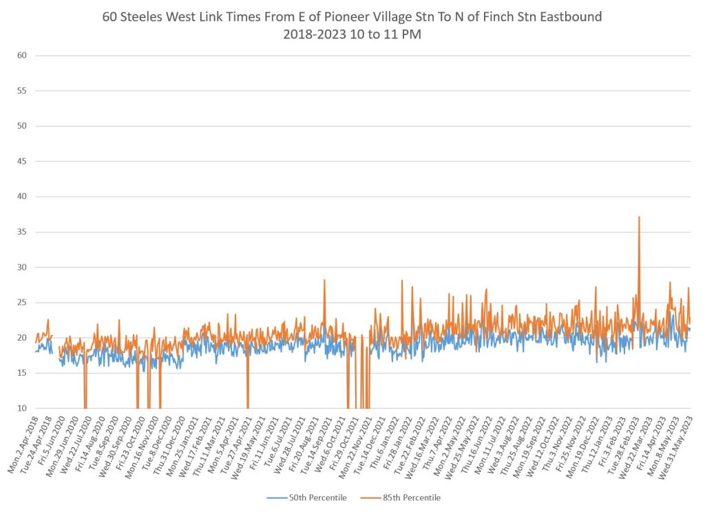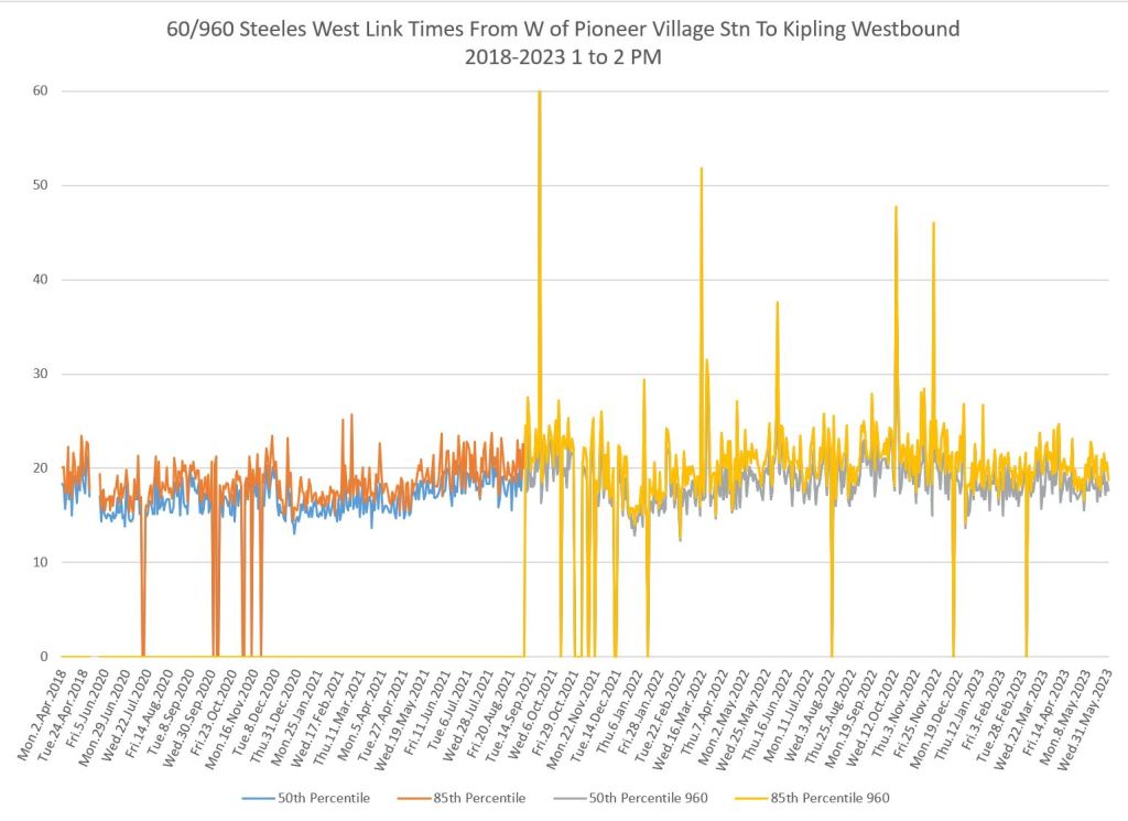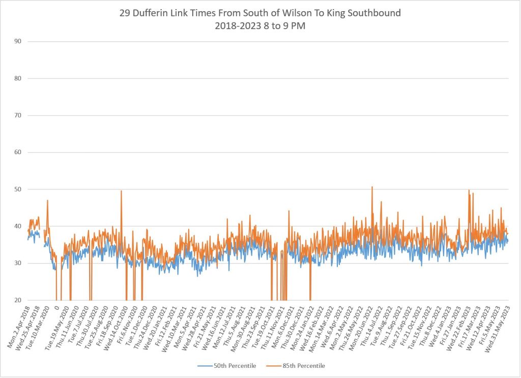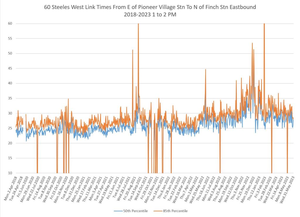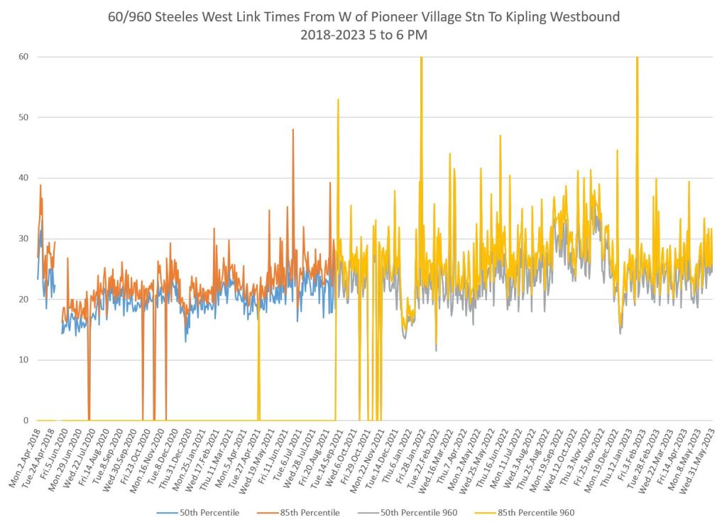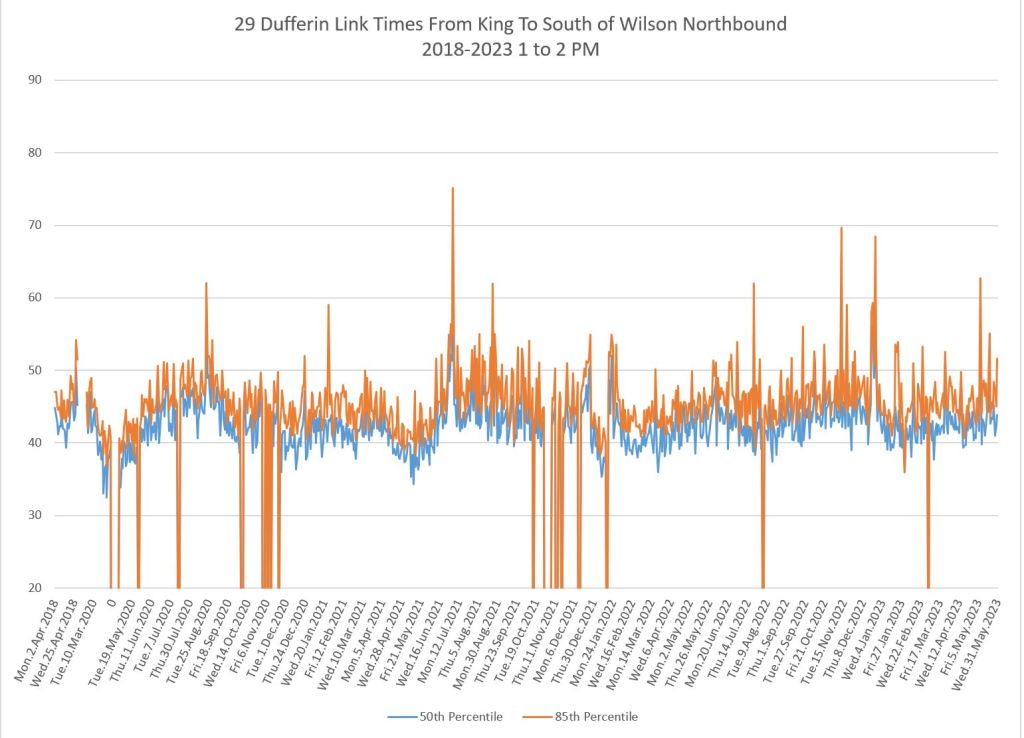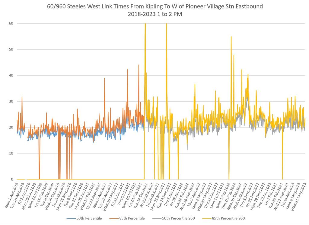 The format of charts used here is different from previous articles which summarized data on a weekly or monthly basis, subdivided by hour of the day. As the number of data points grew, these charts were no longer workable. Here I have adopted the style used in, among other things, my tracking of travel times on King Street which include day-by-day data, but only for a single hour of the day on each chart.