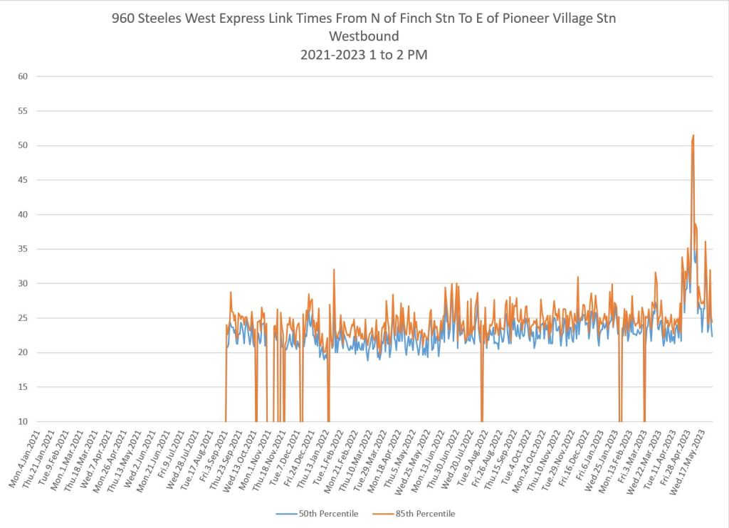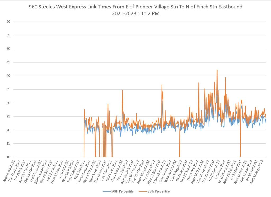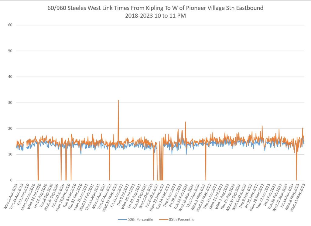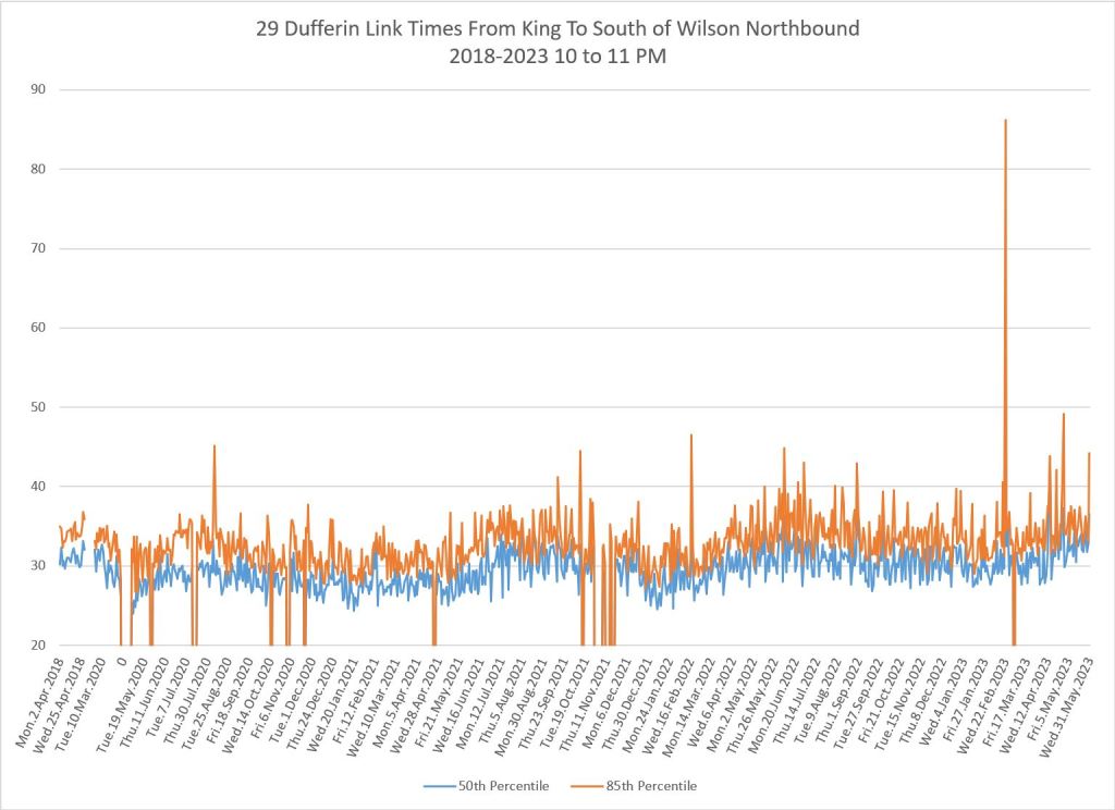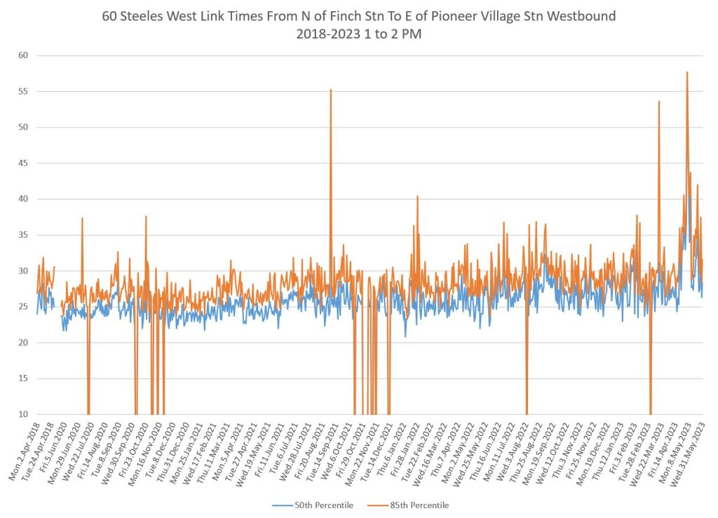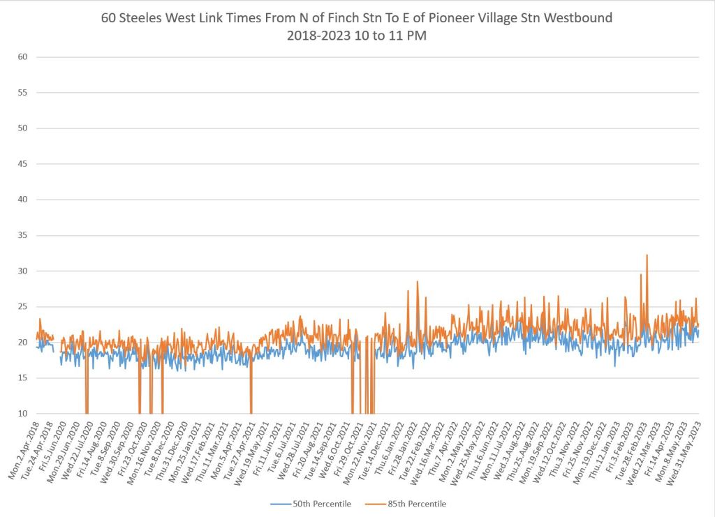 The format of charts used here is different from previous articles which summarized data on a weekly or monthly basis, subdivided by hour of the day. As the number of data points grew, these charts were no longer workable. Here I have adopted the style used in, among other things, my tracking of travel times on King Street which include day-by-day data, but only for a single hour of the day on each chart.