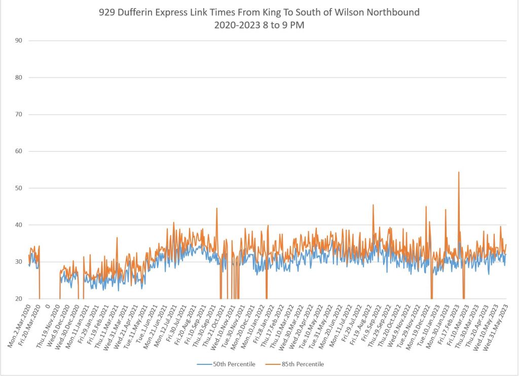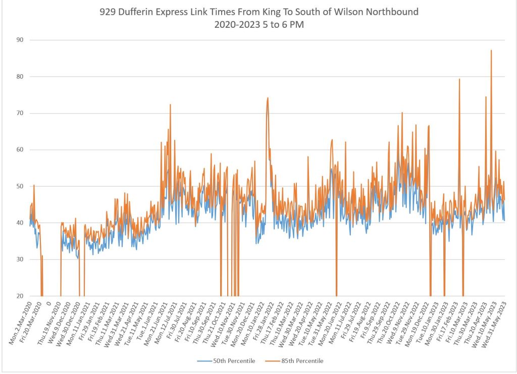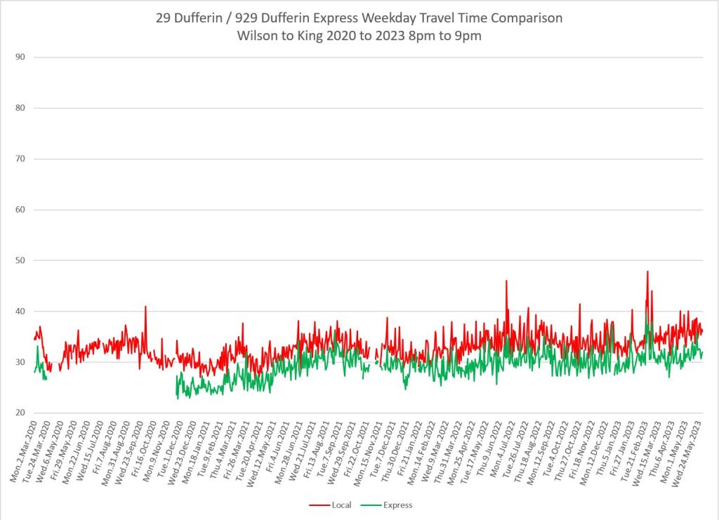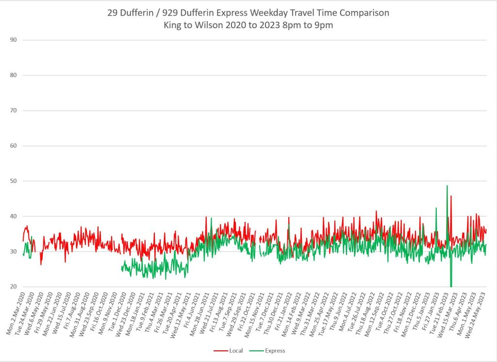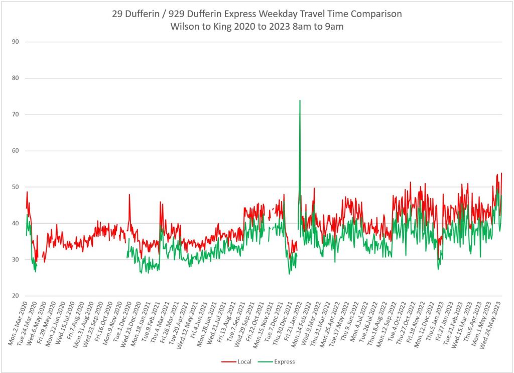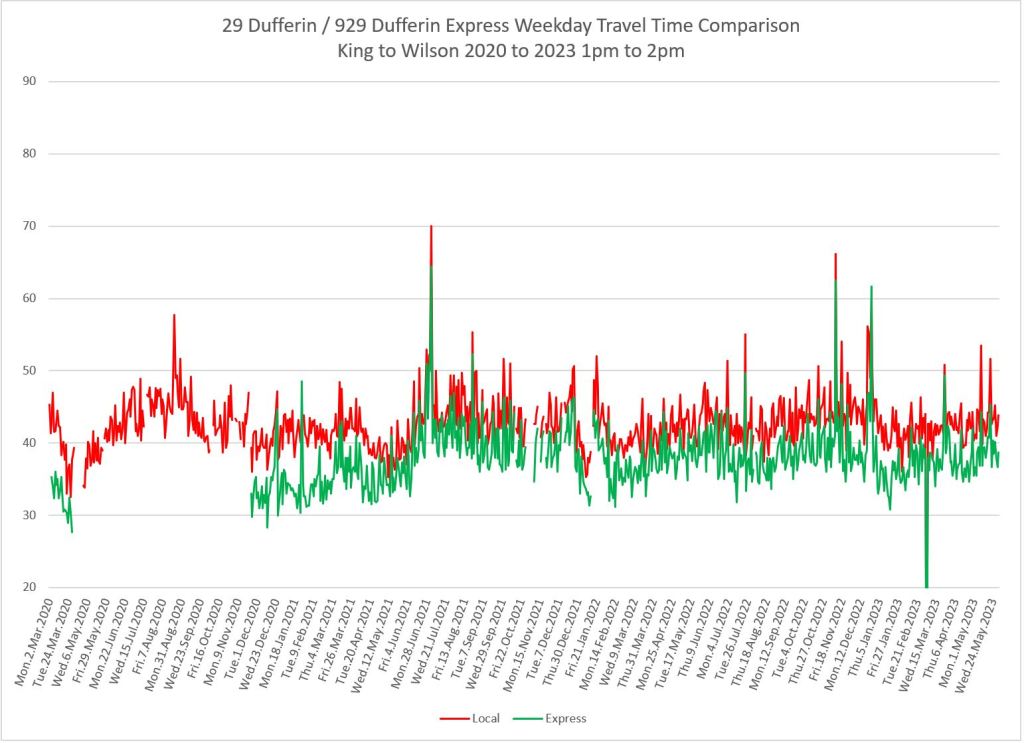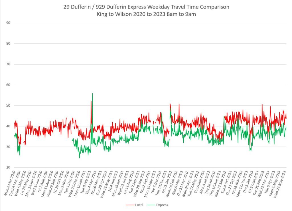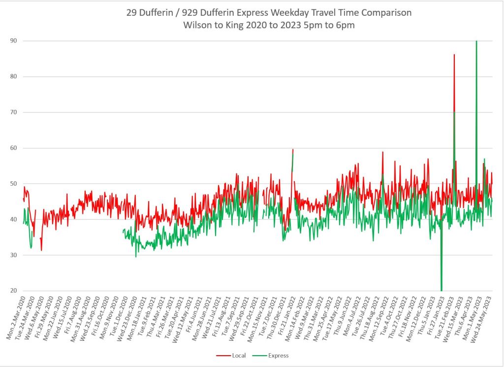 During many periods when both local and express buses operate over this segment, the difference in their median travel times is under five minutes. Both were affected by the congestion eastbound near Dufferin in the PM peak from October 2022 through January 2023.