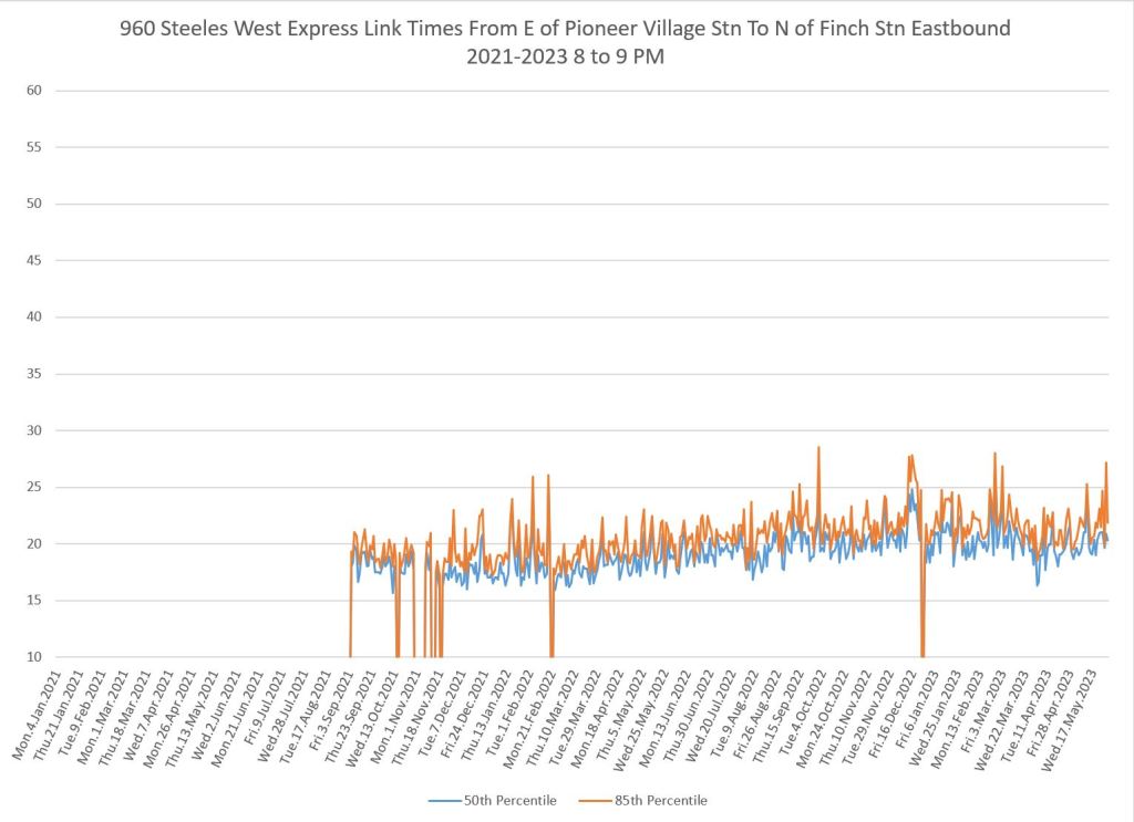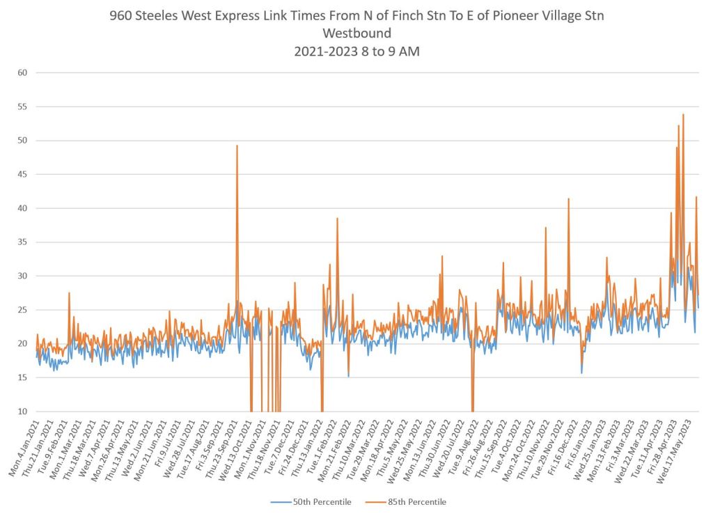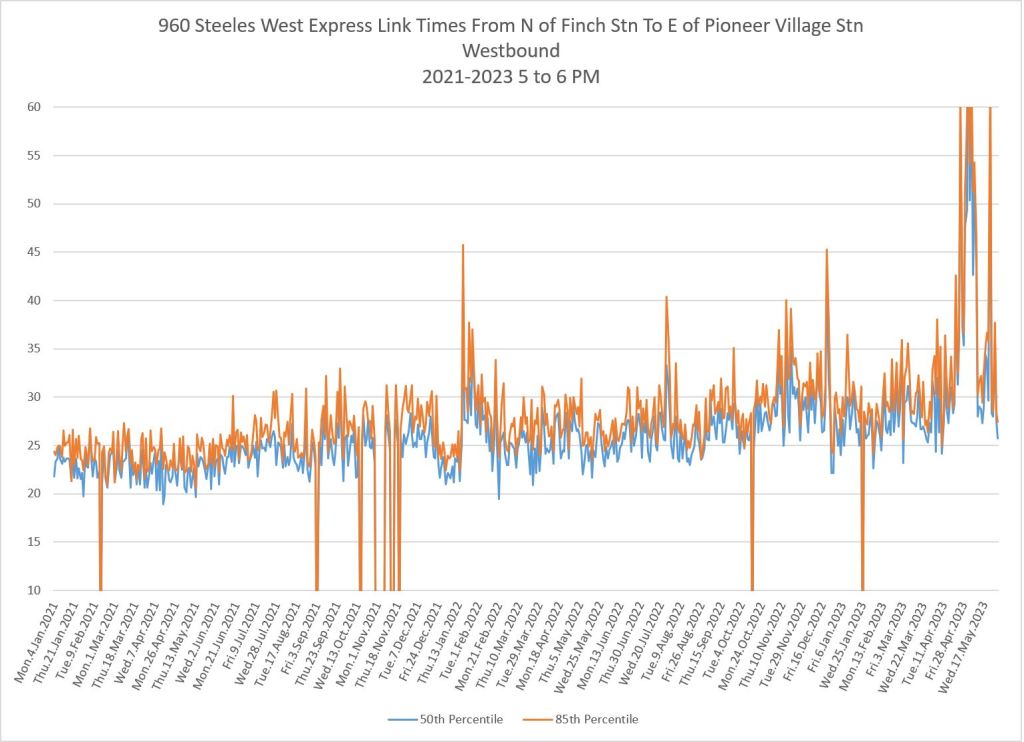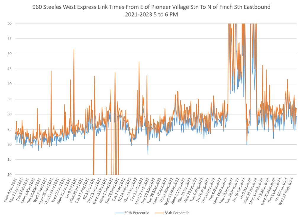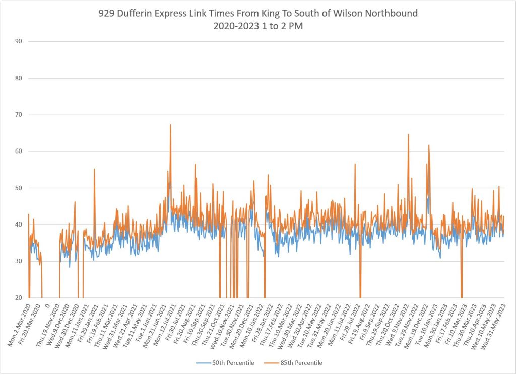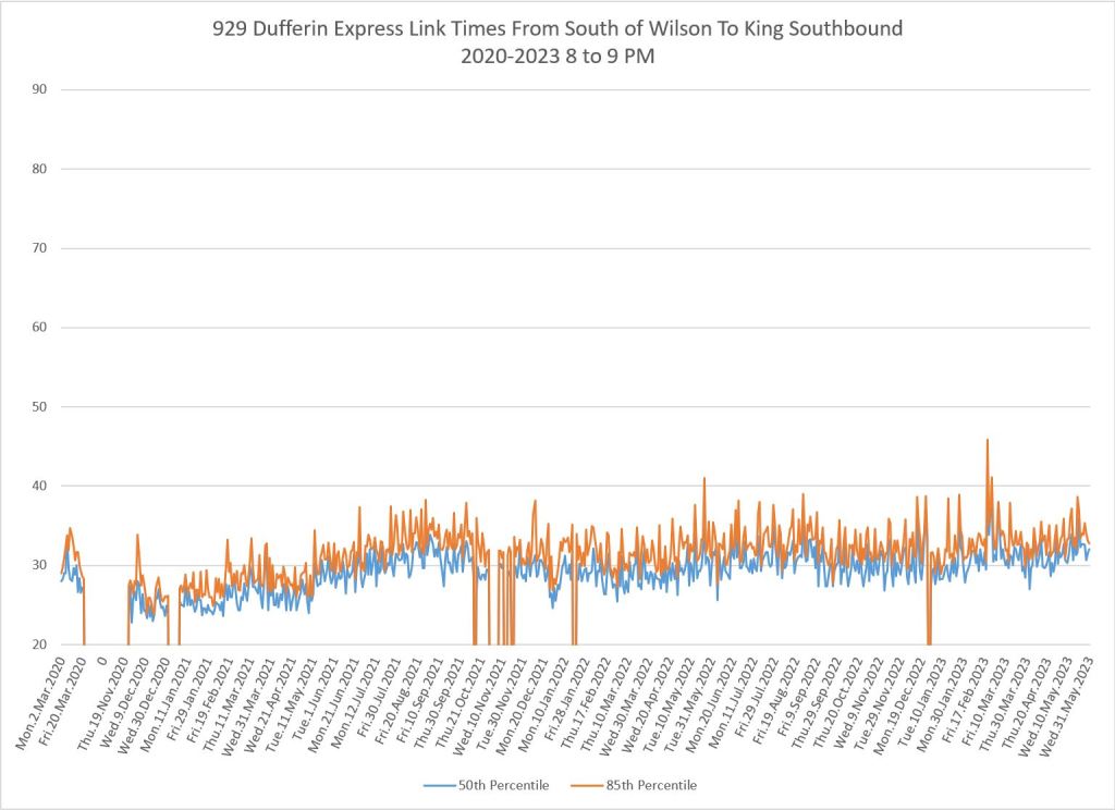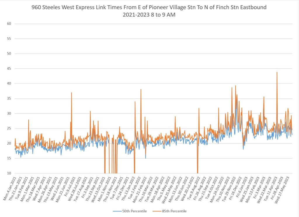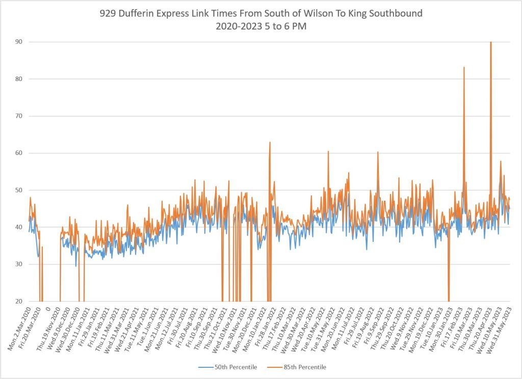 During many periods when both local and express buses operate over this segment, the difference in their median travel times is under five minutes. Both were affected by the congestion eastbound near Dufferin in the PM peak from October 2022 through January 2023.