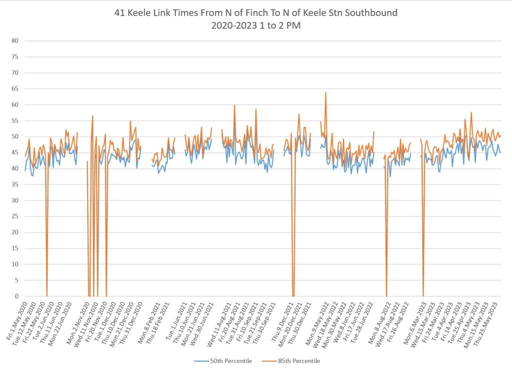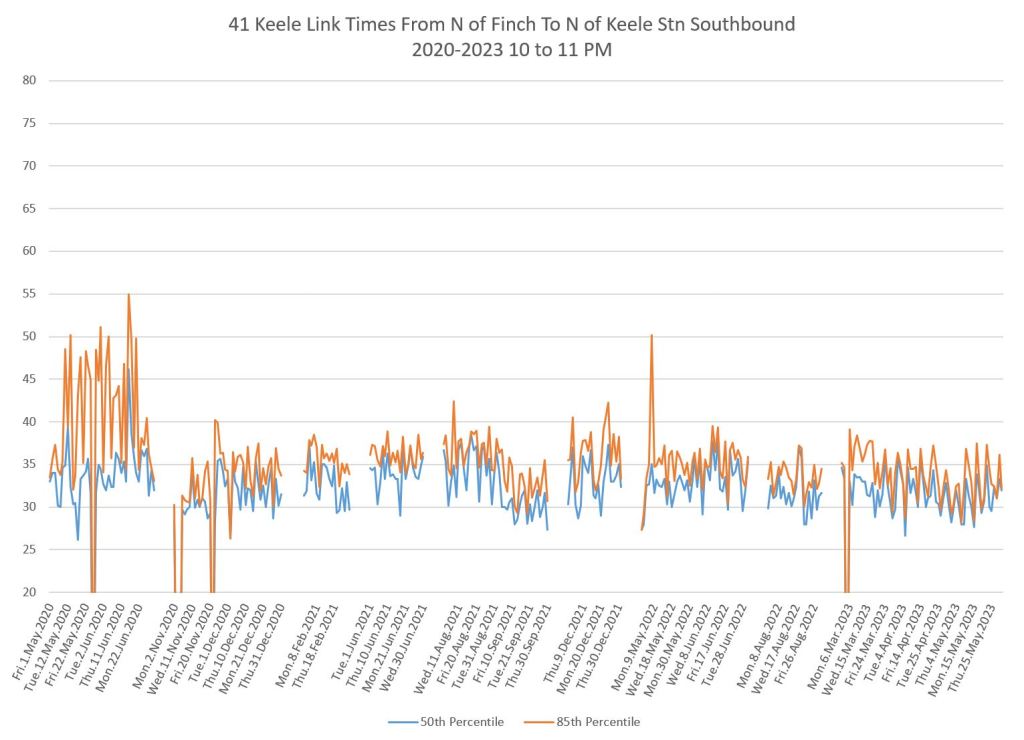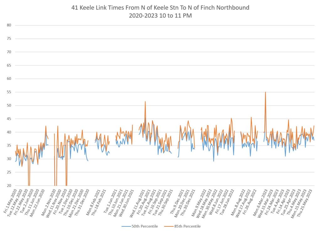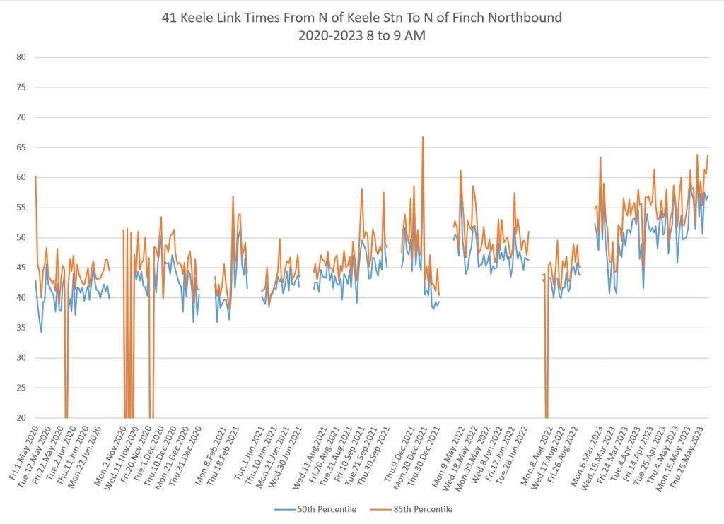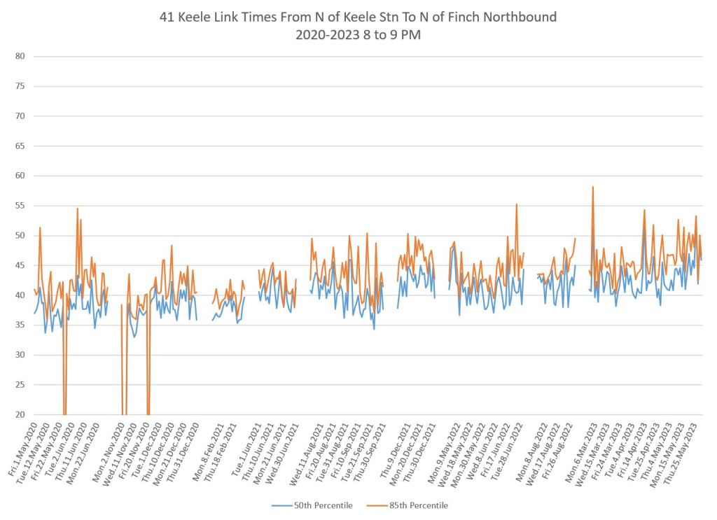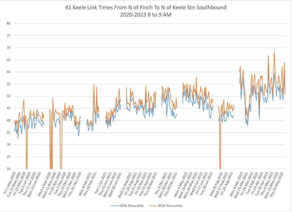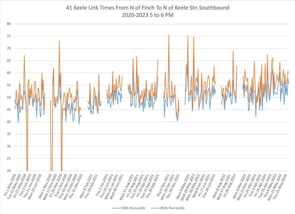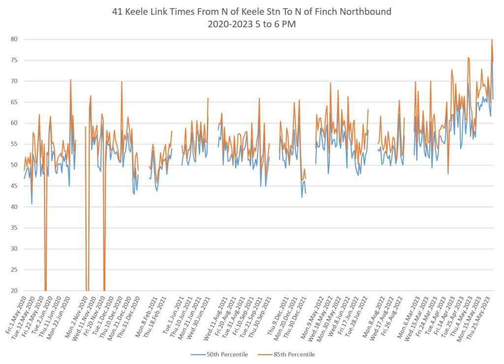 Keele is another corridor I have been tracking on and off in recent years. There is a clear growth in travel times over the route, especially in peak periods.