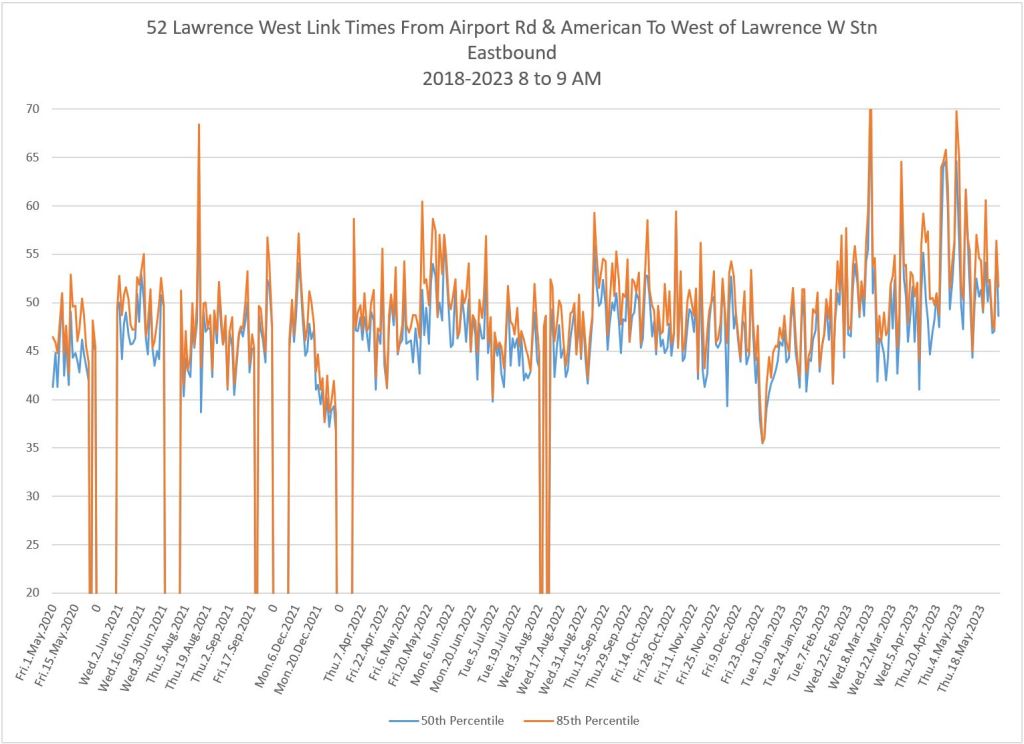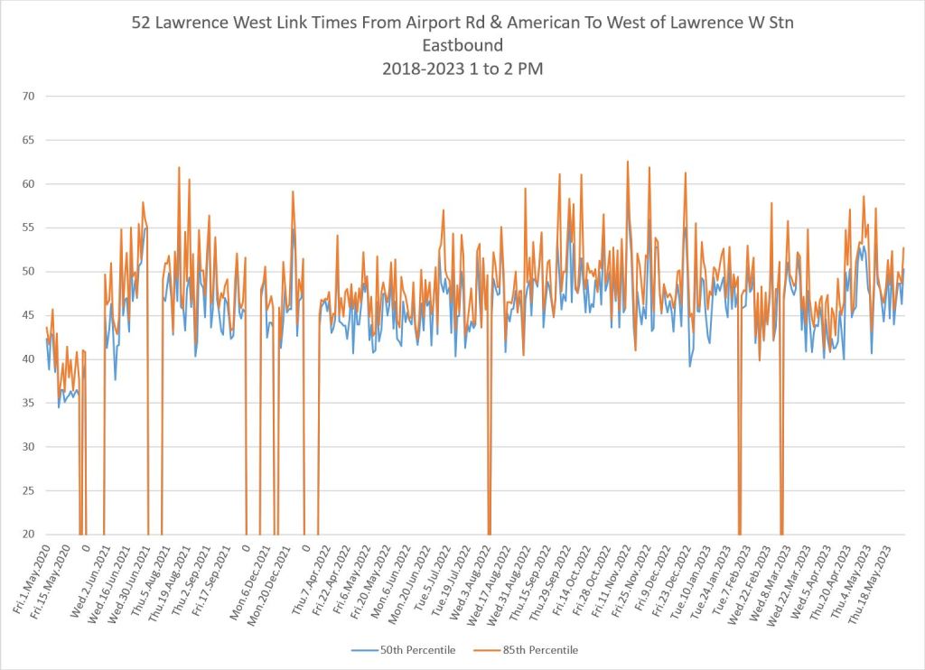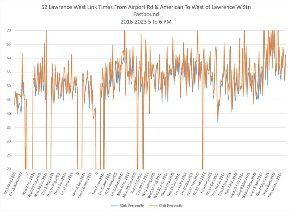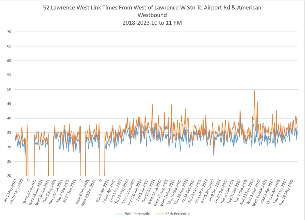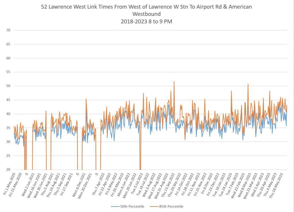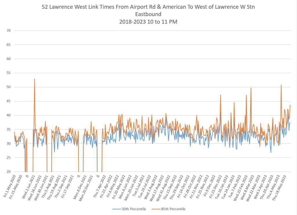 For the most part, these charts cover the period from March 2020 to May 2023, with some additional data from earlier months where I have it. My purpose in collecting the data was to monitor travel time changes with reduced traffic congestion and stop service times of the pandemic era.