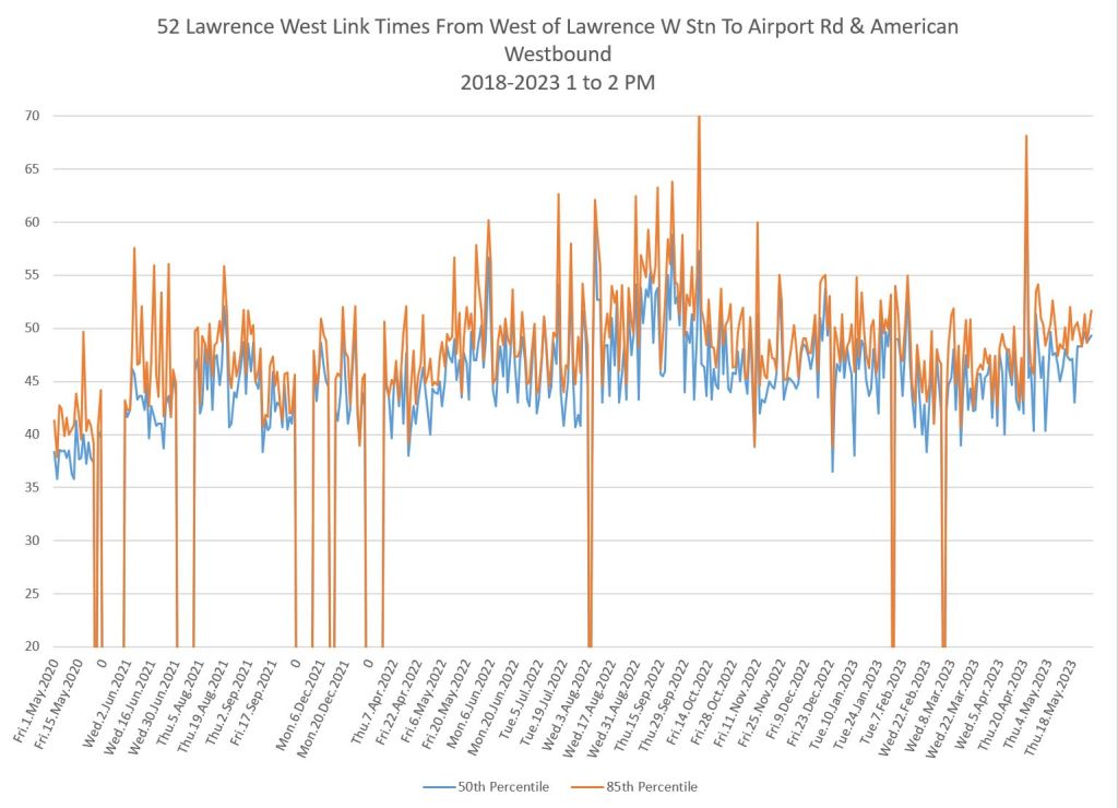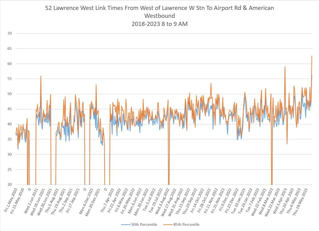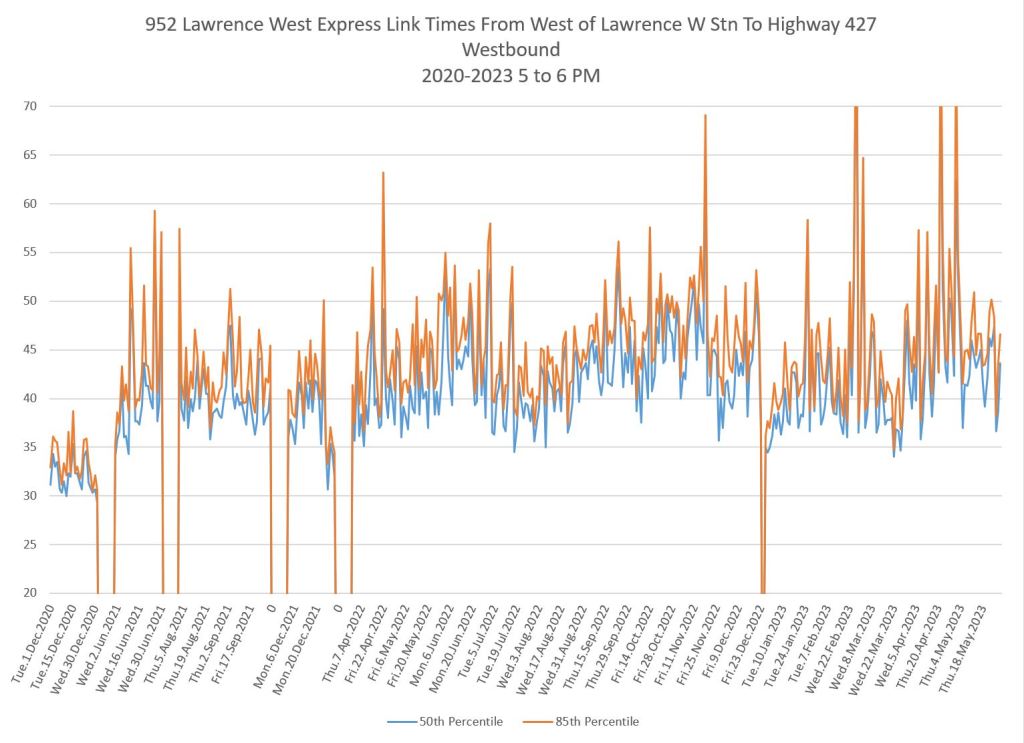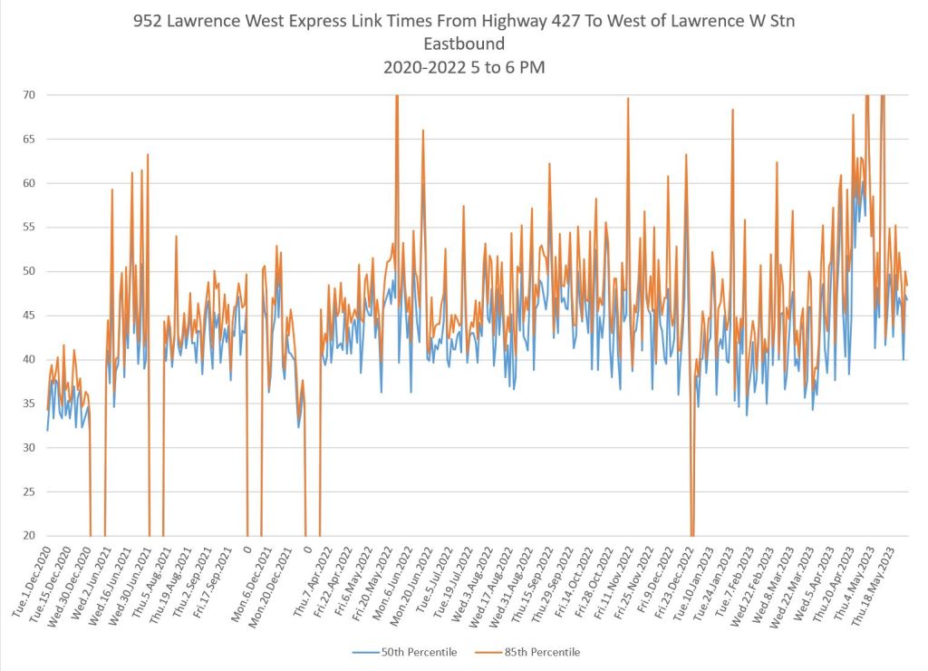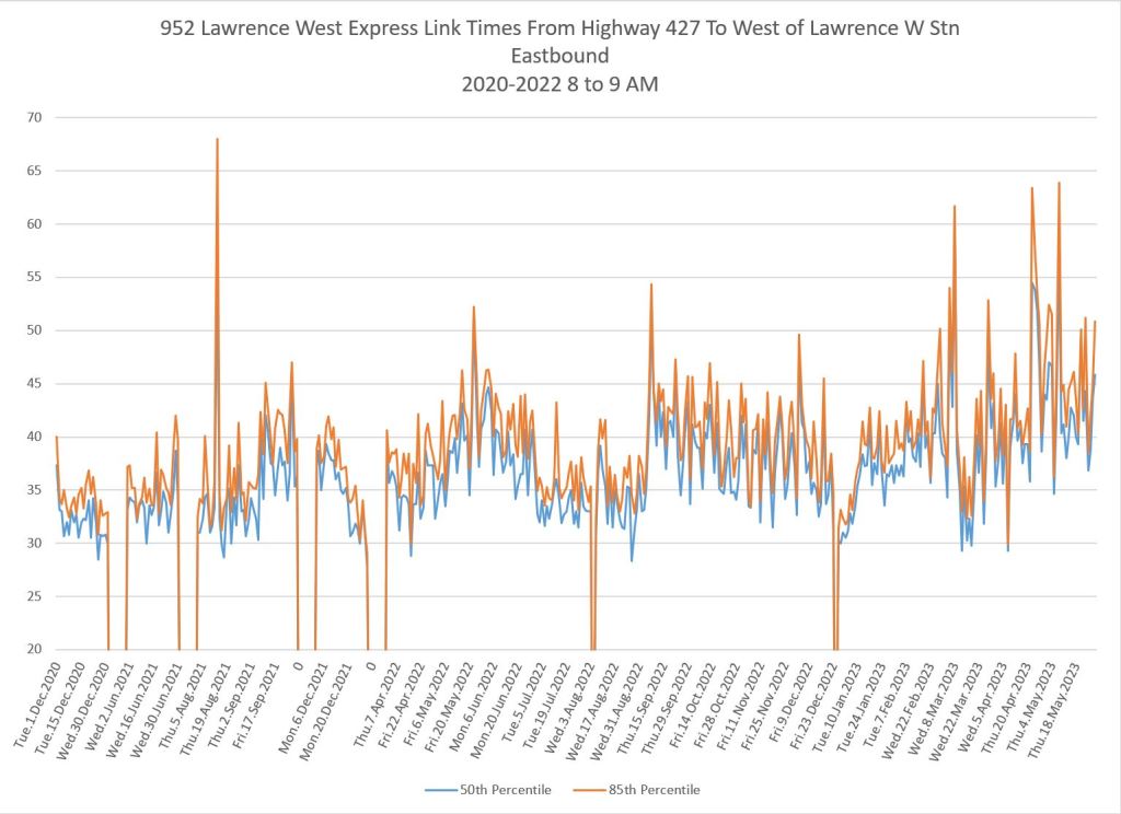 Lawrence West is not a proposed route for RapidTO red lanes, but I have been tracking it on and off as a major route comparatively unaffected by construction (such as Eglinton West or Finch West). I have included the data here to show the pattern over the past three years.