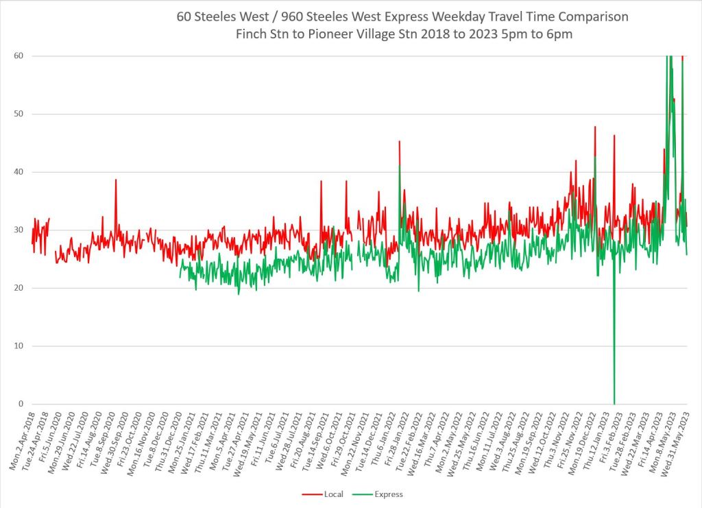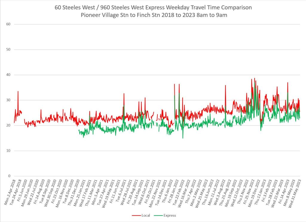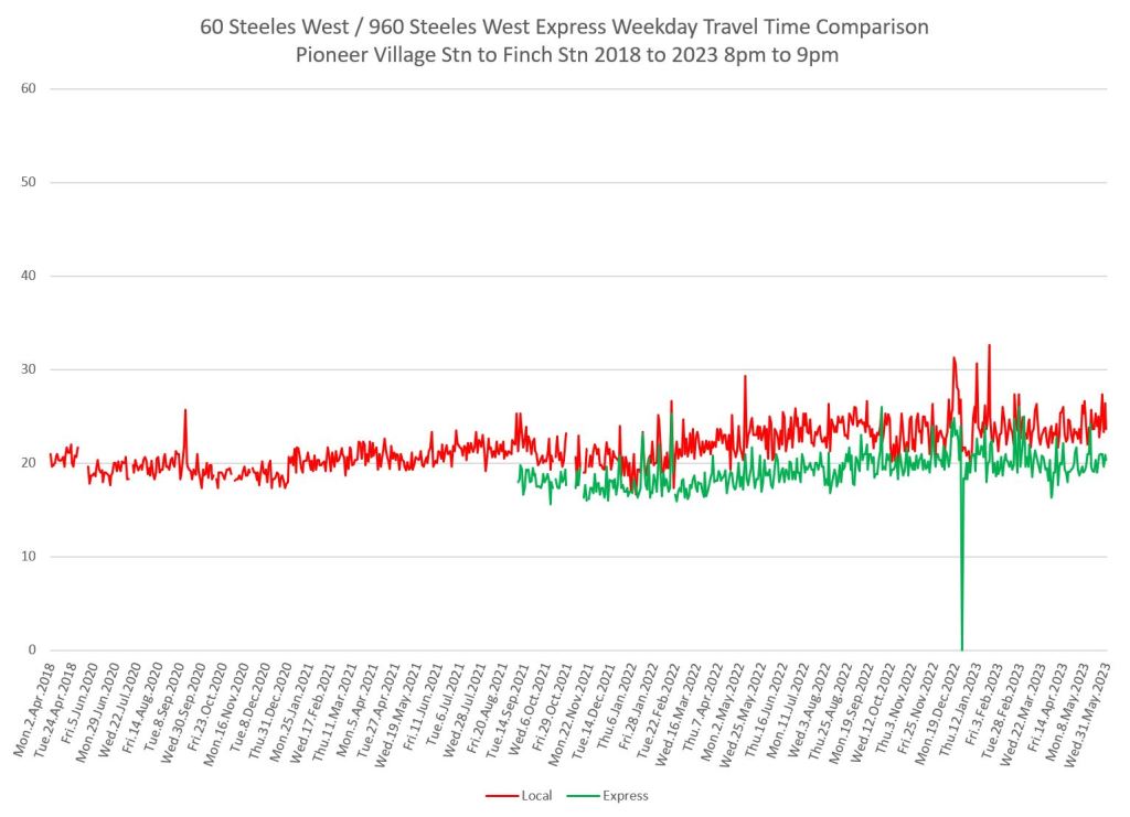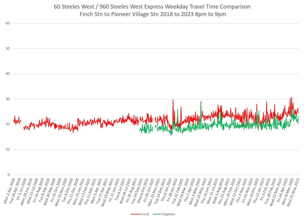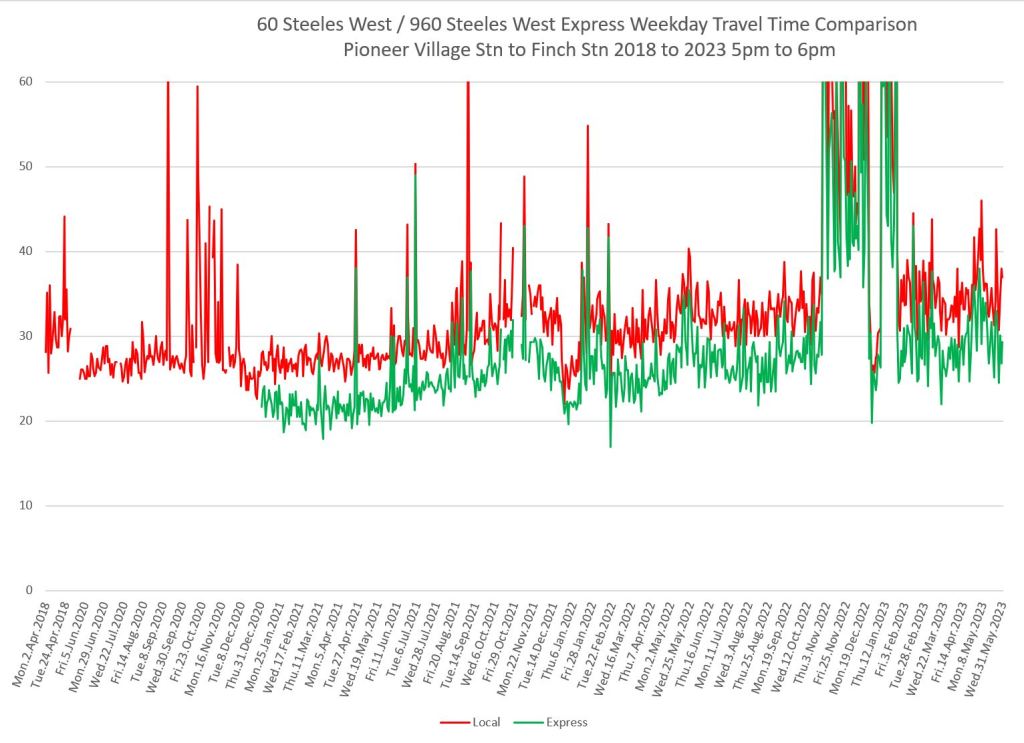 60/960 Steeles Express vs Local Travel Times (Eastern Segment)