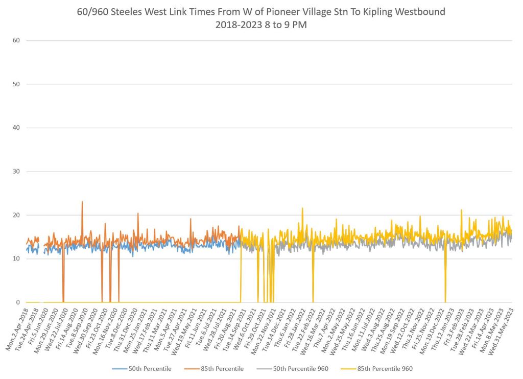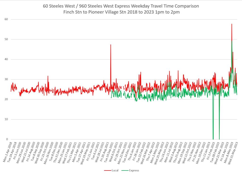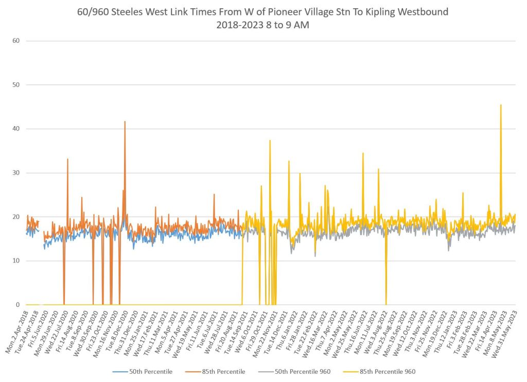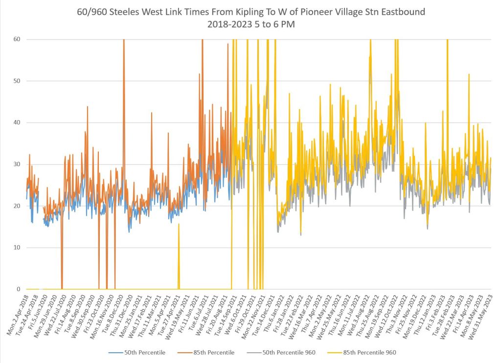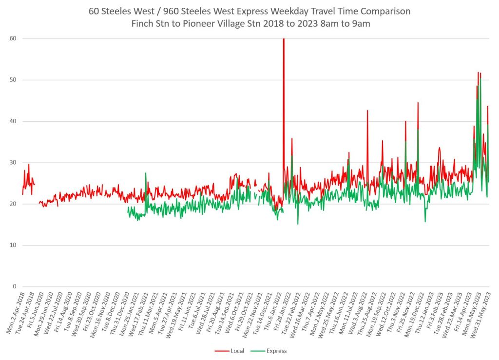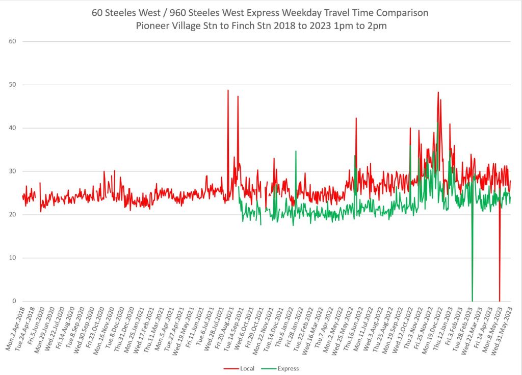 60/960 Steeles Express vs Local Travel Times (Eastern Segment)